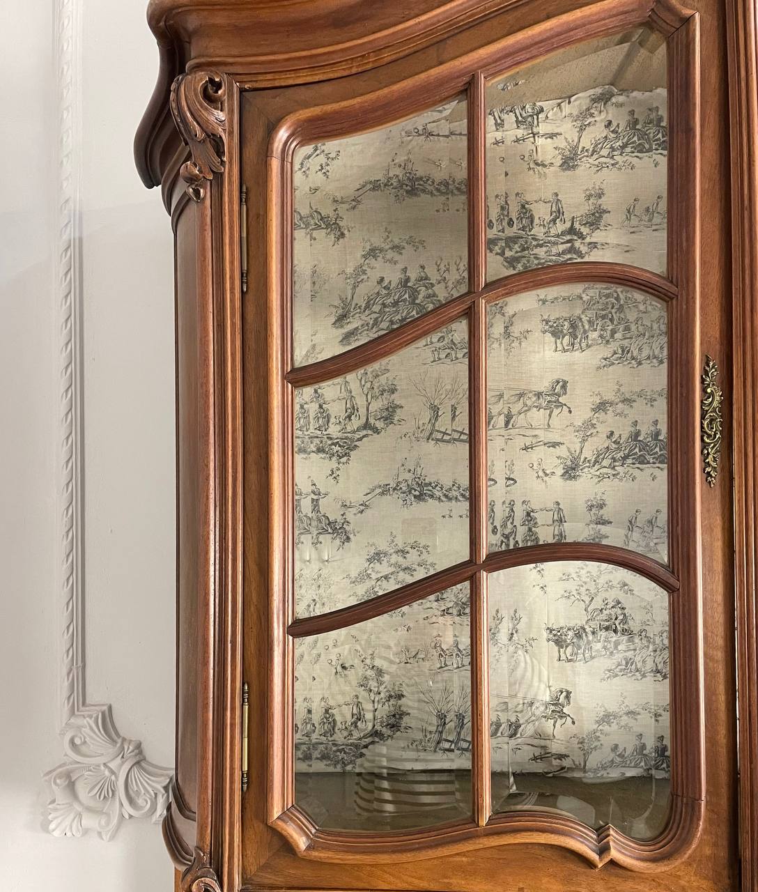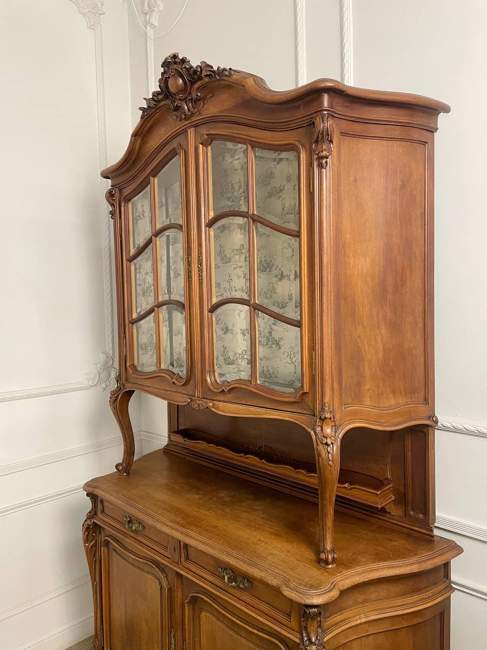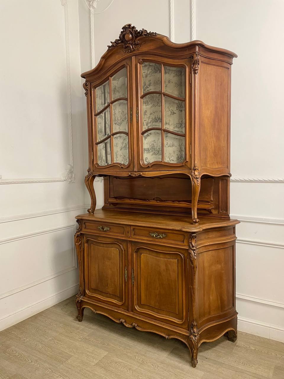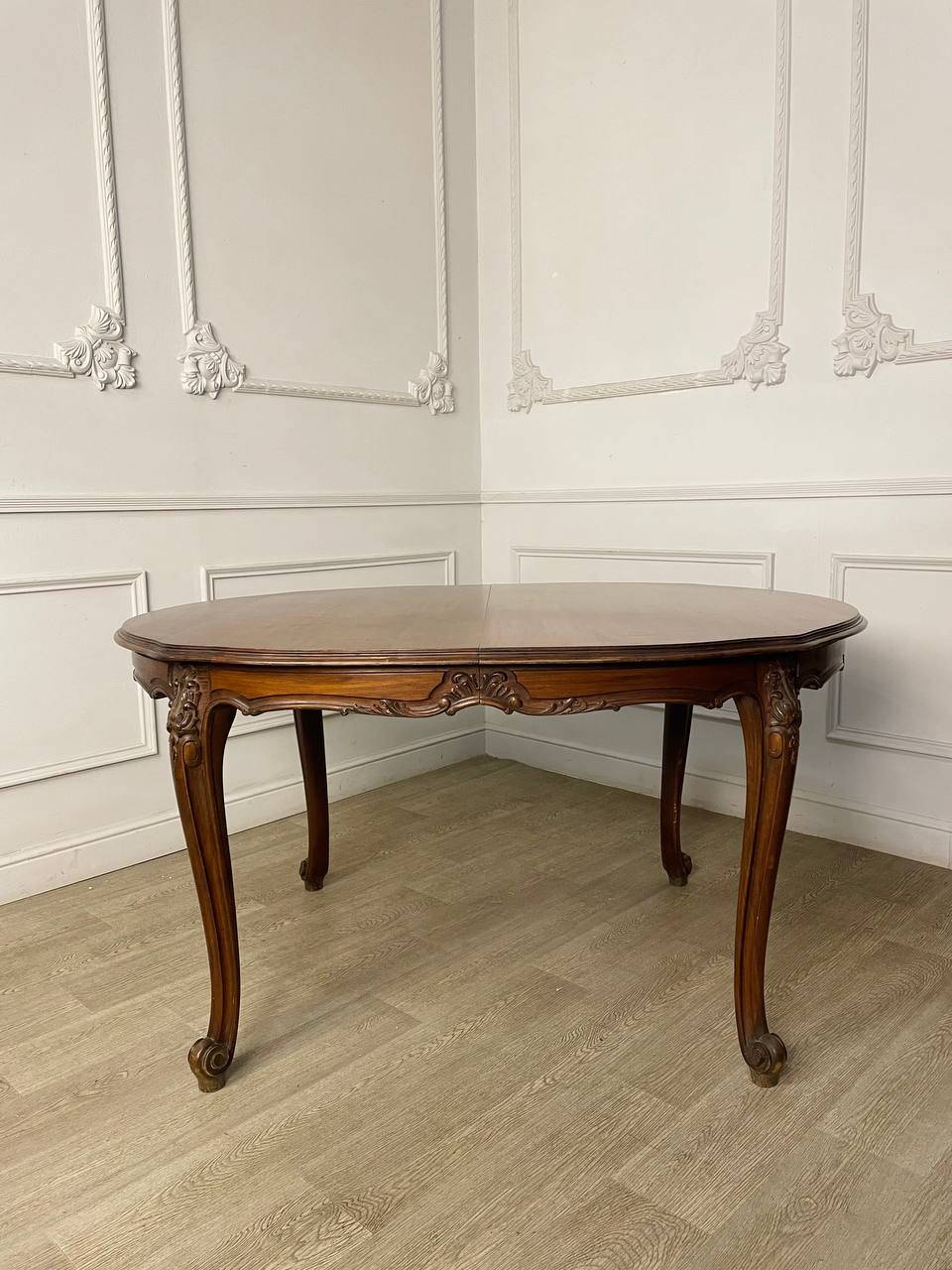 Антикварный комплект столовой мебели 8 предметов в стиле Луи XV рубежа XIX-начала XX веков, Франция. Выполнен из массива ореха. Оригинальные стекла с фигурным фацетом. Оригинальная бронзовая фурнитура. Овальный обеденный стол может раскладываться, но оригинальные вставки не сохранены. Буфет 150х55х255h см. Стол 142(+180)х108х76h см. Стулья 6 шт 49х49х93h см.