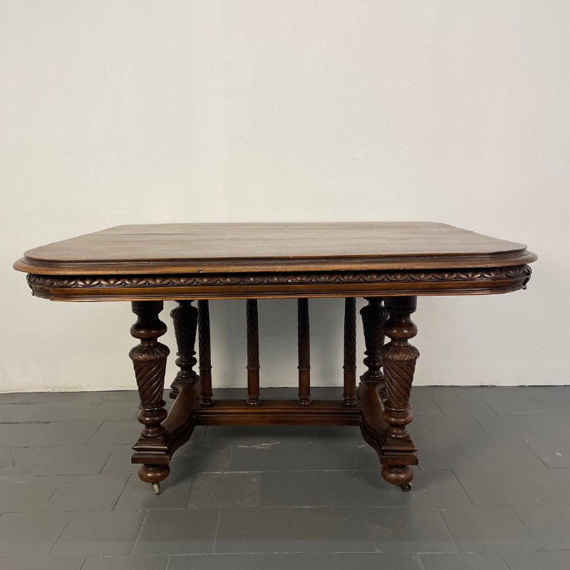 Антикварный обеденный стол Обеденный стол из массива ореха, начало ХХ века, Франция. Стол раскладывается. Оригинальные вставки не сохранились, но можем сделать на заказ. Размер: 131х113х74 см. В разложенном виде: 320х113х74 см.