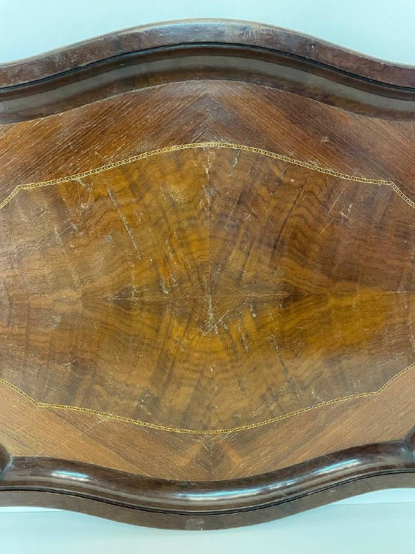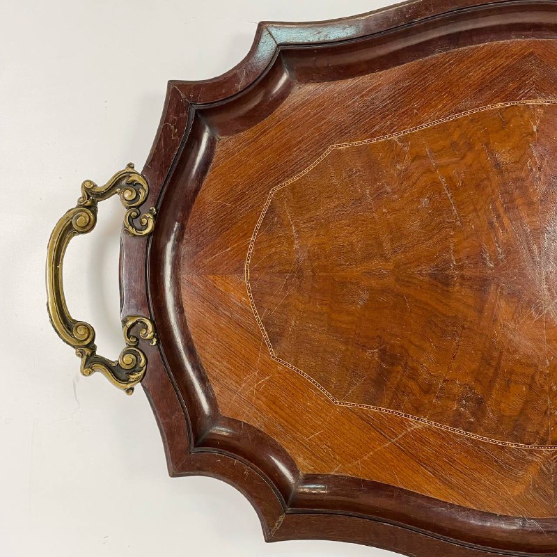 Большой поднос из нескольких пород дерева: корень ореха, палисандр, ручки выполнены из бронзы. Начало ХХ века, Франция. Размер: 78х48 cм.