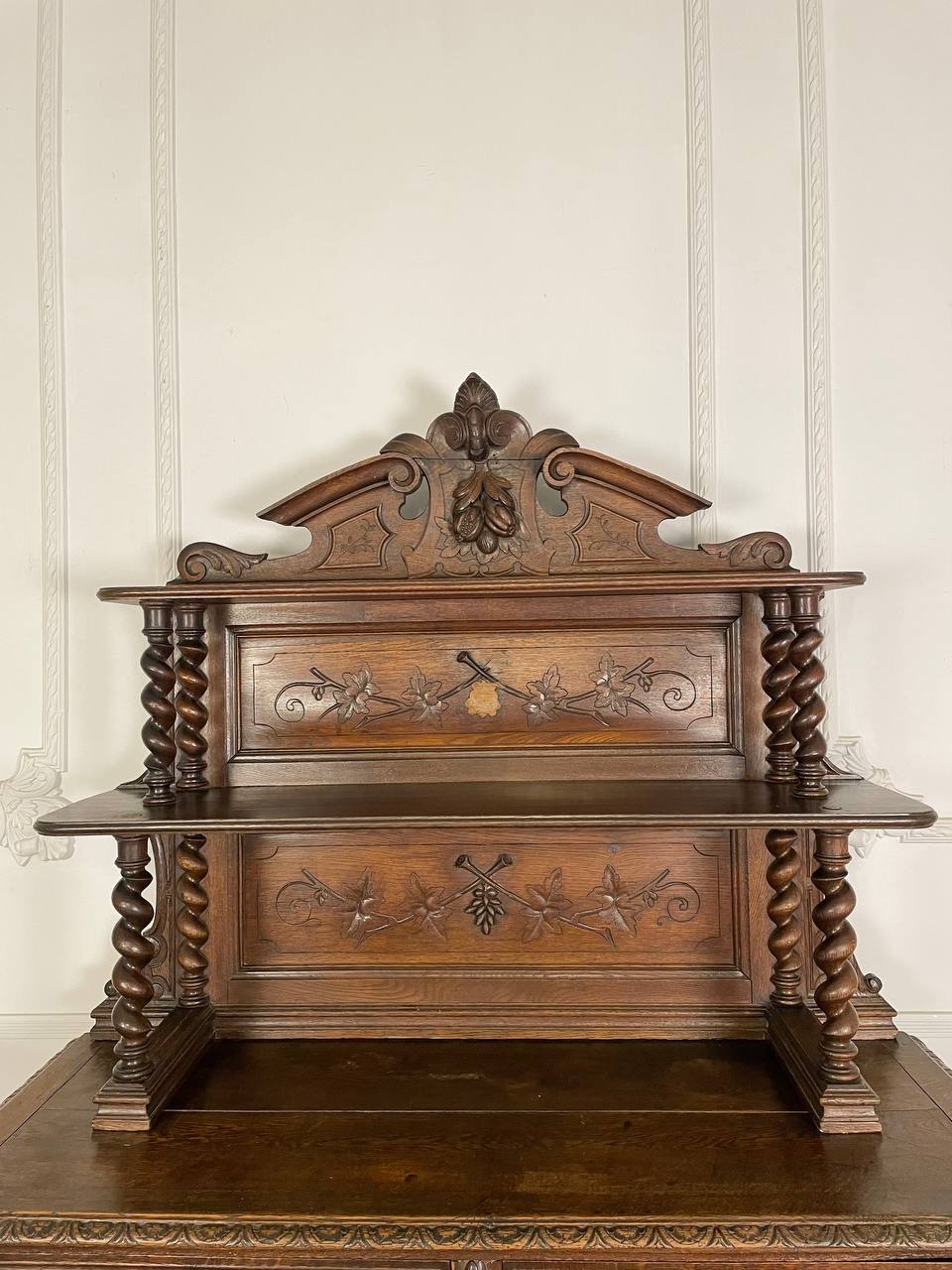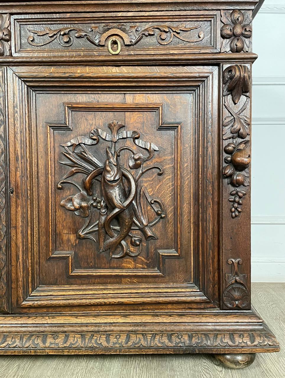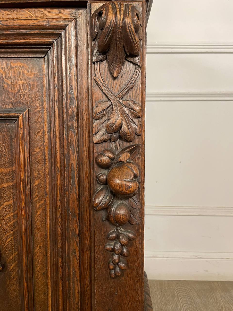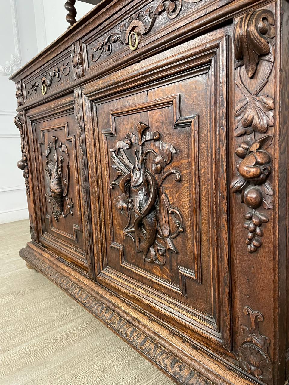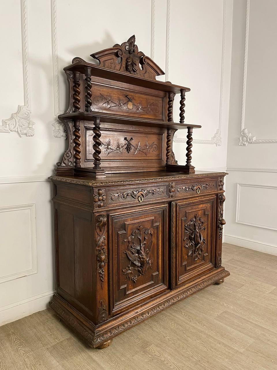 Антикварный поставец XIX века, Франция. Выполнен из массива дуба. Богатая резьба ручной работы. Размер 145х59х207h см.
