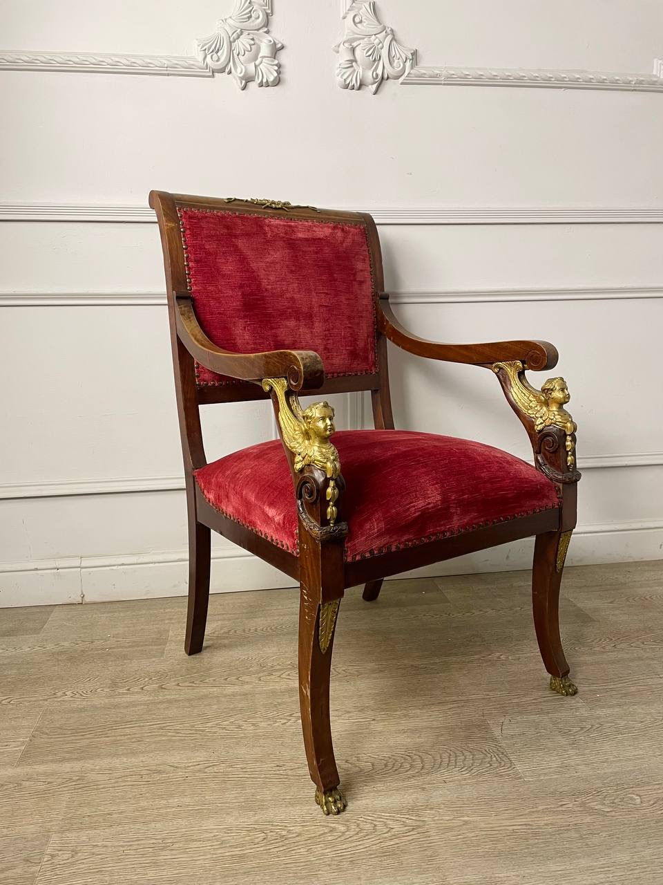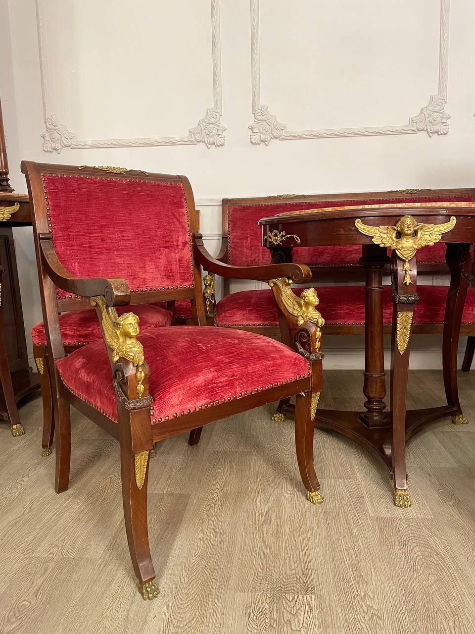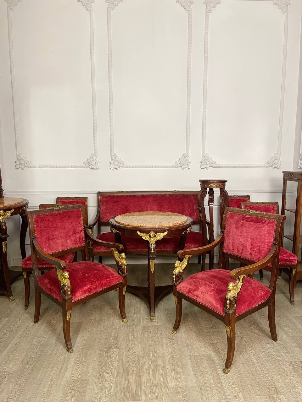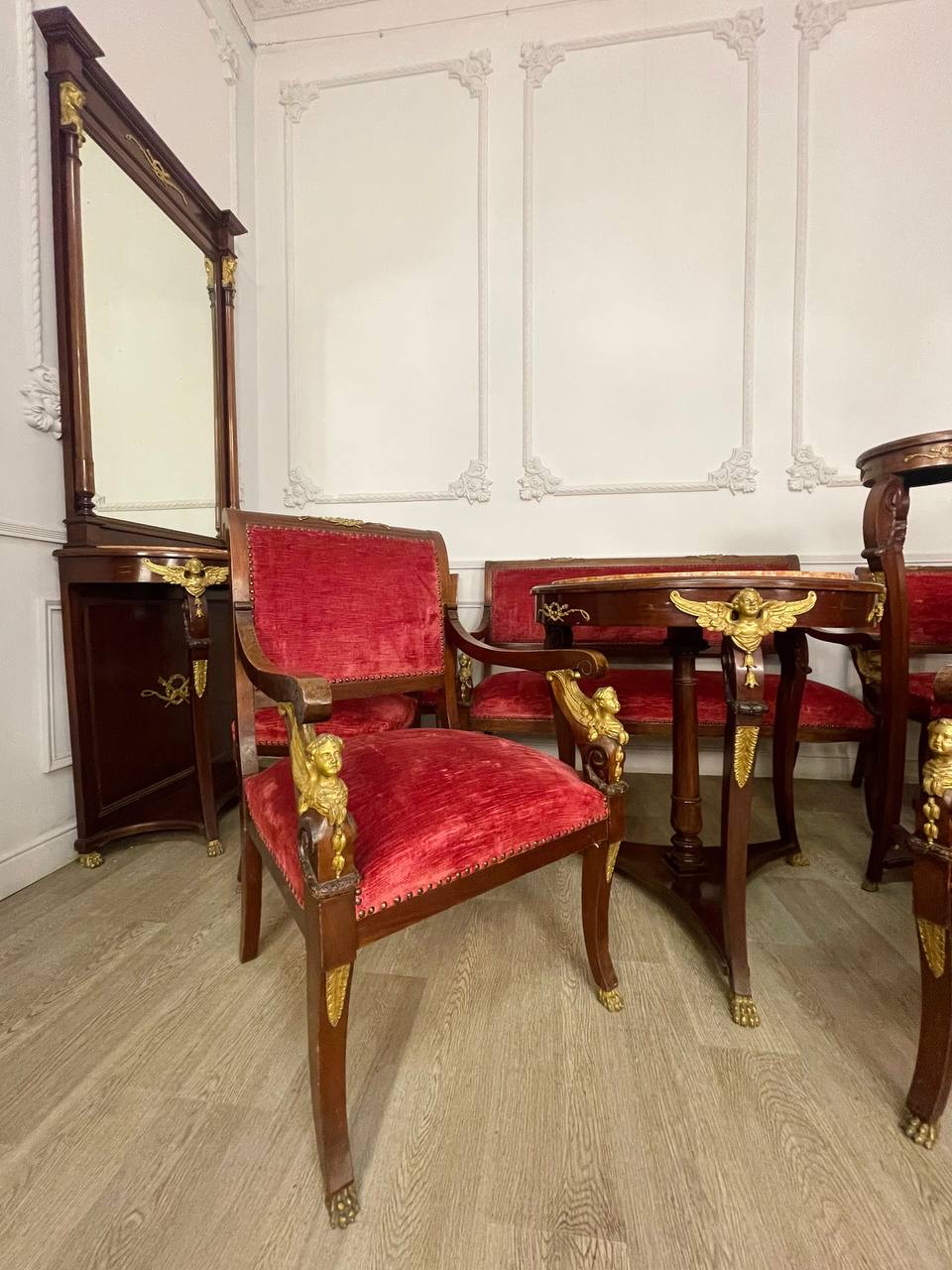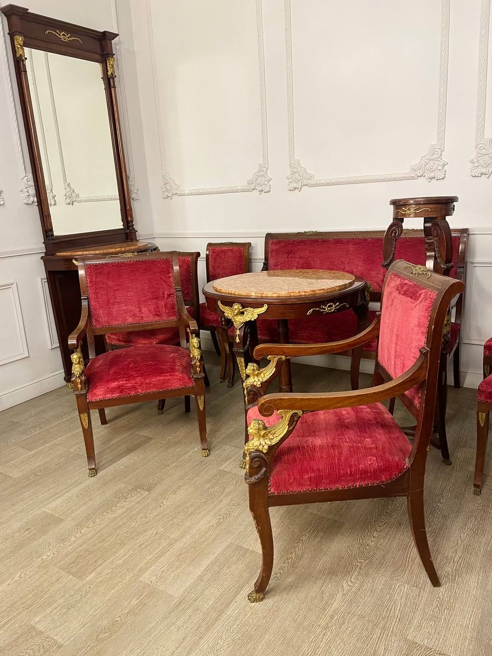 Антикварный гарнитур в стиле Ампир XIX века, Франция. Состоит из 11 предметов. Выполнен из красного дерева. Оригинальная бронзовая фурнитура. Оригинальные зеркальные полотна. Оригинальная мраморная столешница. Стол диаметр 82 см, высота 83 см. Диван 142х64х98h см. Кресло 60х61х98h см. Стул 43х51х93h см. Зеркало с консолью 88х46х241h см. Зеркало с витринами 143х31х211h см.