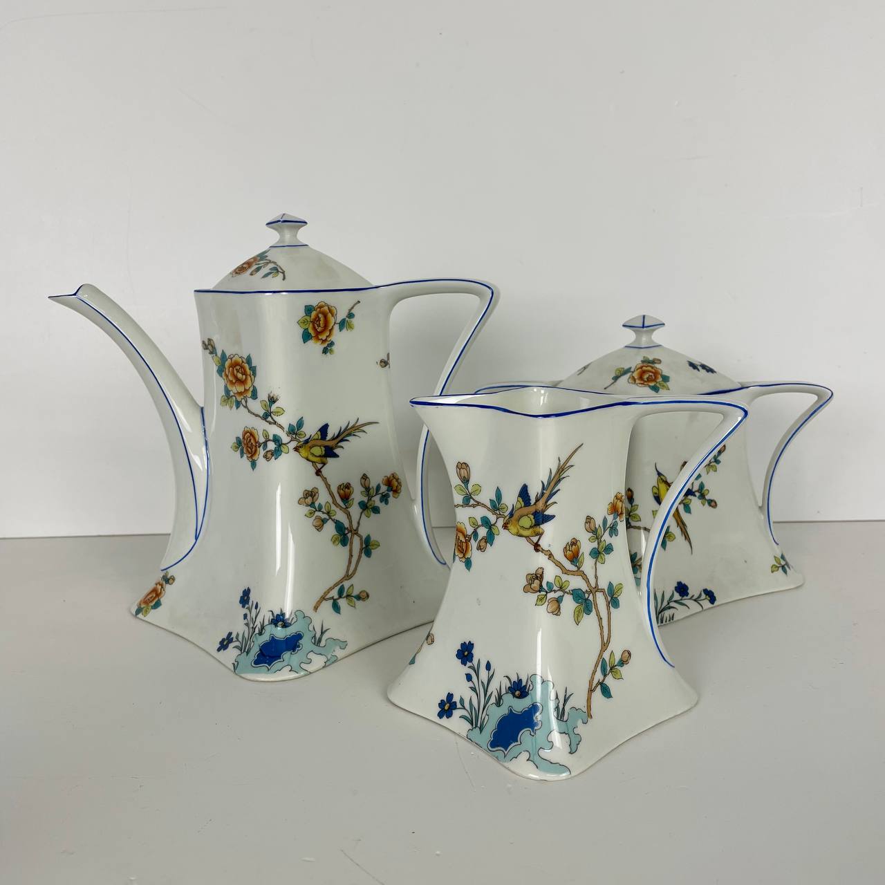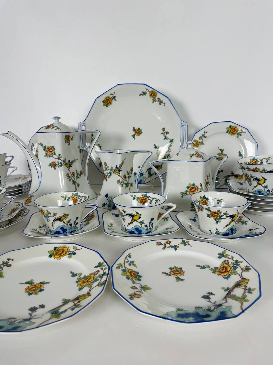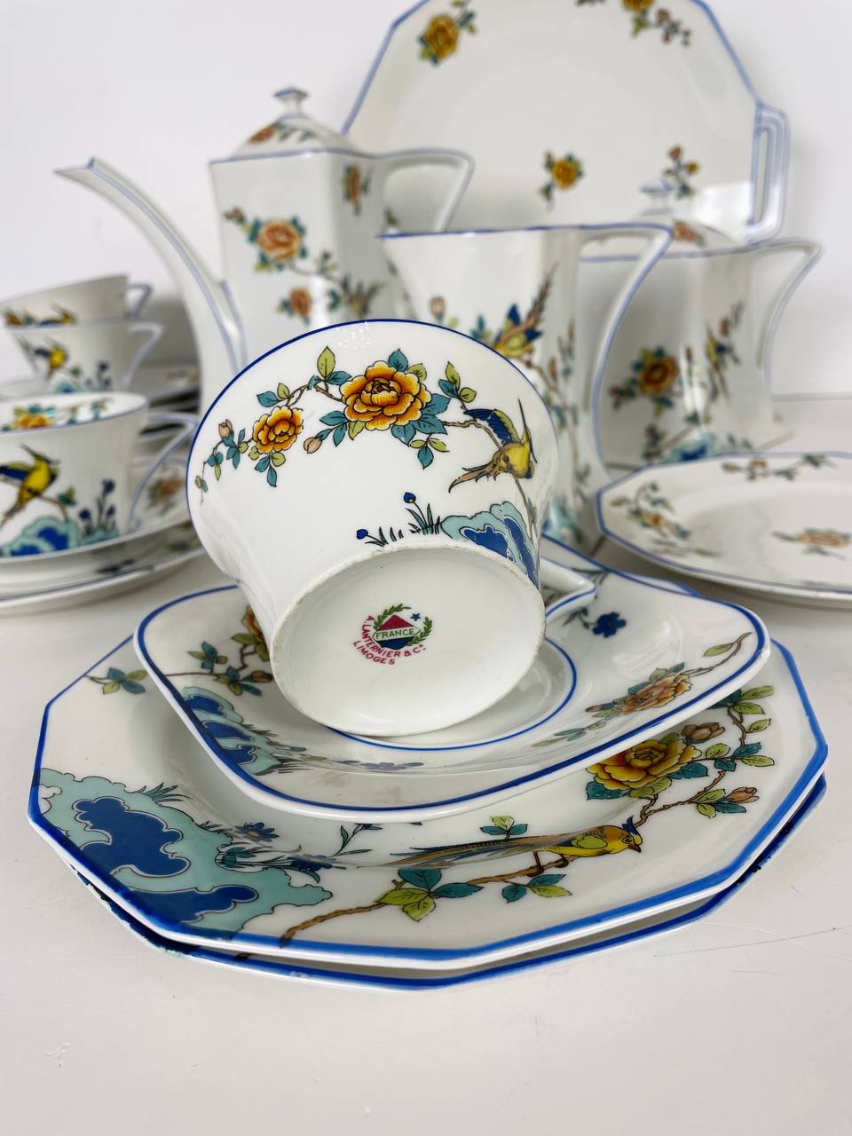 Антикварный кофейный сервиз Limoges в стиле шинуазри, первая половина ХХ века, Франция. Костяной фарфор с ручной росписью. 9 кофейных чашек, 9 блюдец, 9 пирожковых тарелочек, 1 блюдо, 1 кофейник, 1 молочник, 1 сахарница. Всего: 31 предмет