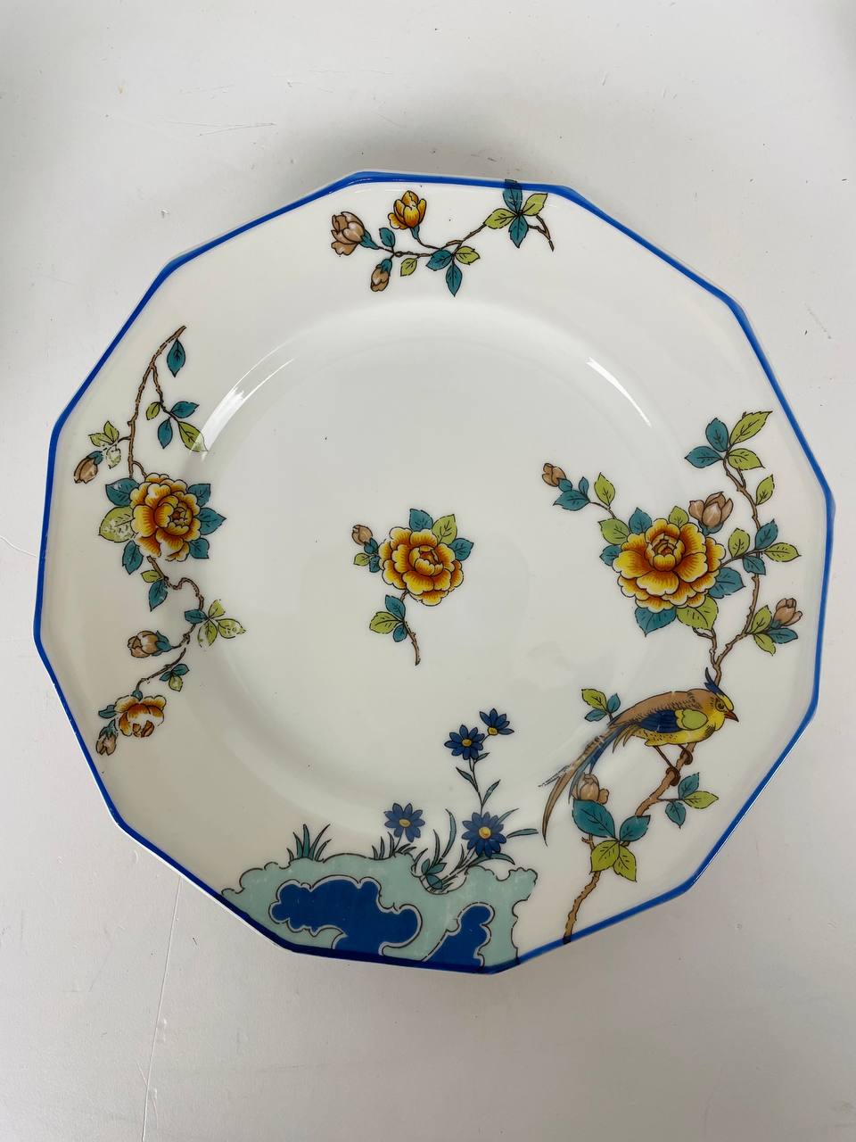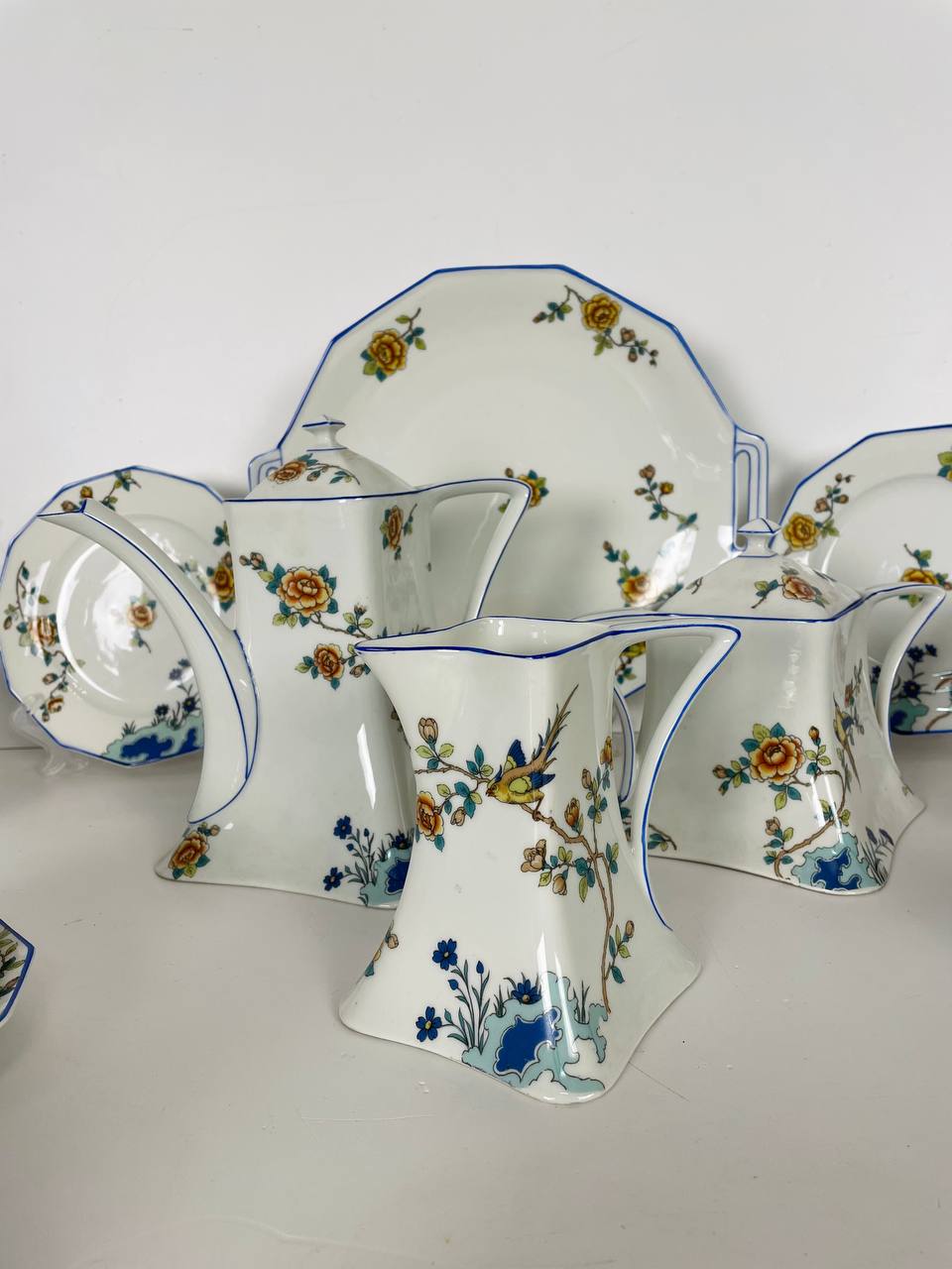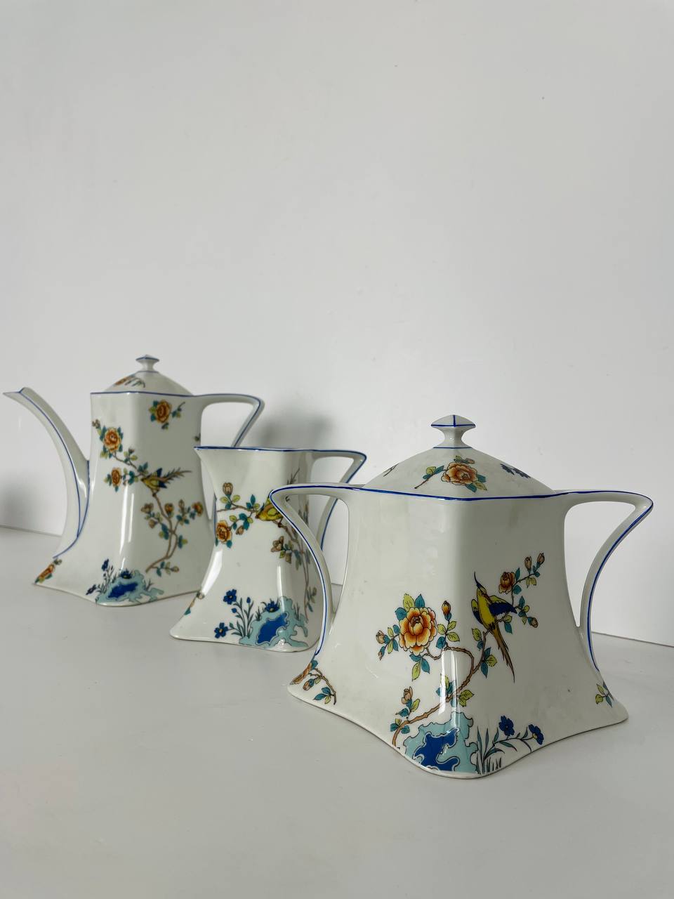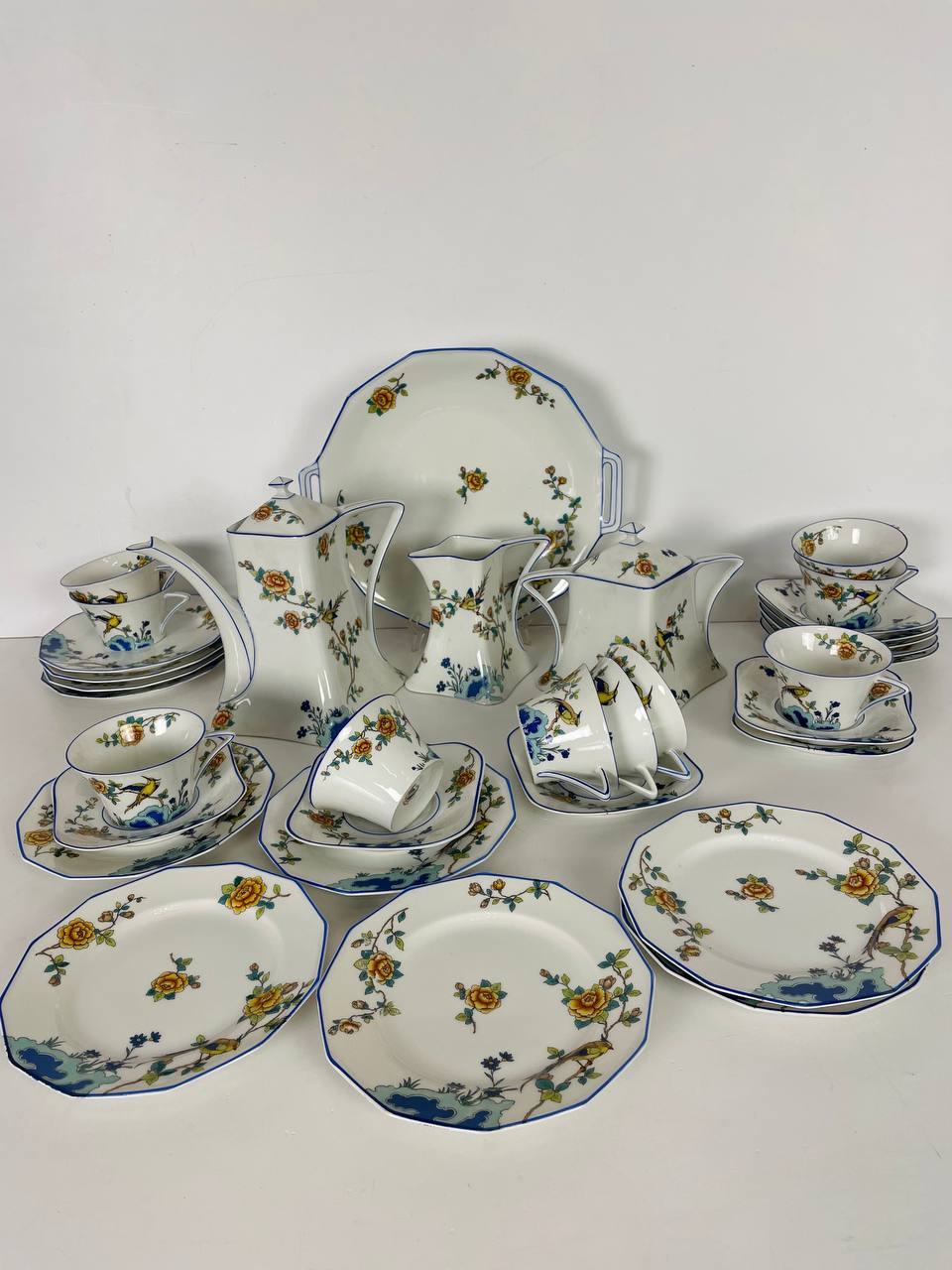 Антикварный кофейный сервиз Limoges в стиле шинуазри, первая половина ХХ века, Франция. Костяной фарфор с ручной росписью. 9 кофейных чашек, 9 блюдец, 9 пирожковых тарелочек, 1 блюдо, 1 кофейник, 1 молочник, 1 сахарница. Всего: 31 предмет