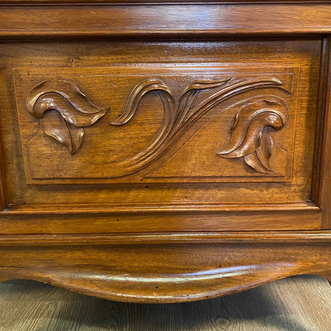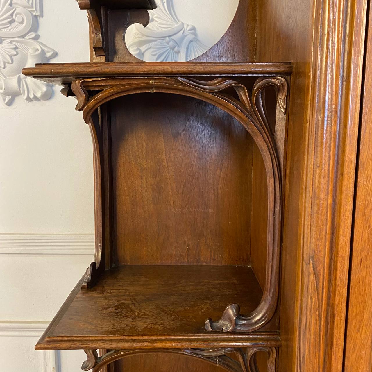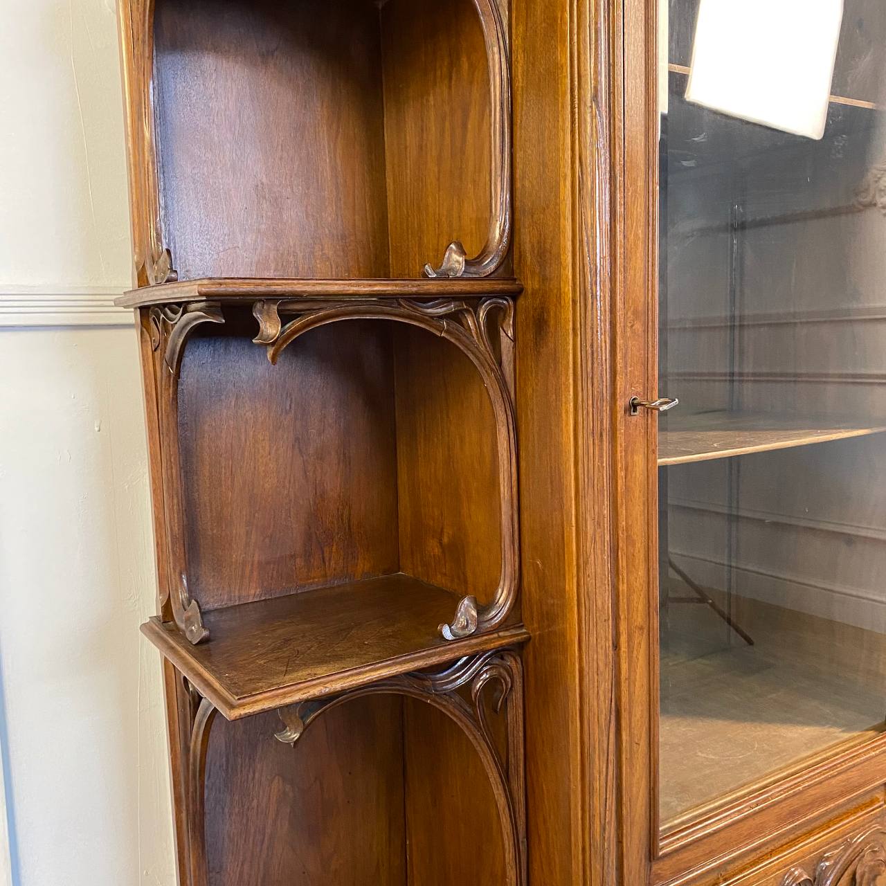 Антикварная витрина в стиле Ар-Нуво начала XX века, Франция. Выполнена из массива ореха, украшена резьбой в виде цветов водяной лилии. Внутренняя стенка отделана зеркальным полотном. Родной ключик. Размер: 102х37х167h см.