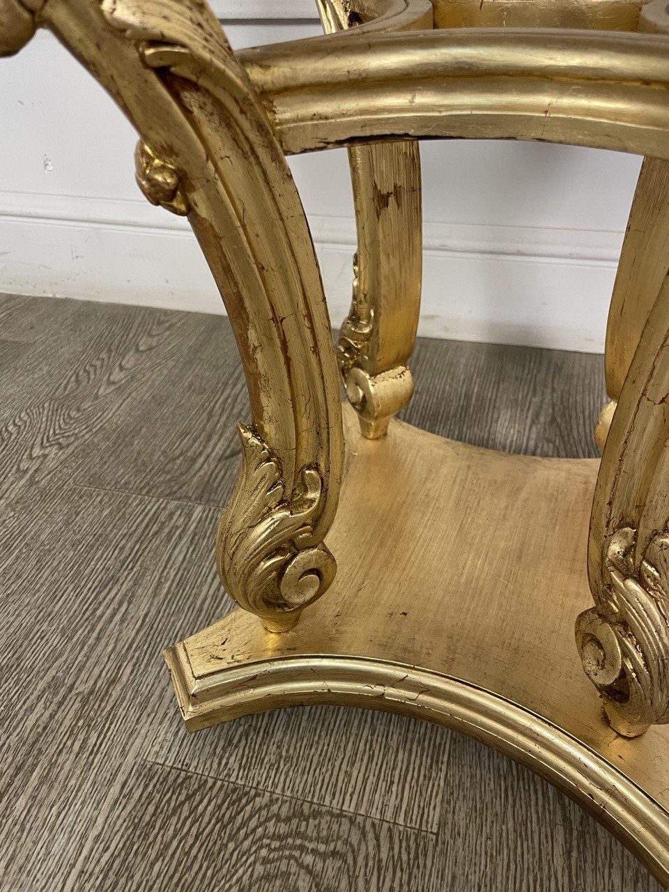 Антикварный столик с мраморной столешницей XIX века, Франция. Сусальное золото. Мраморная столешница современная. Диаметр 62 см. Высота 84 см.
