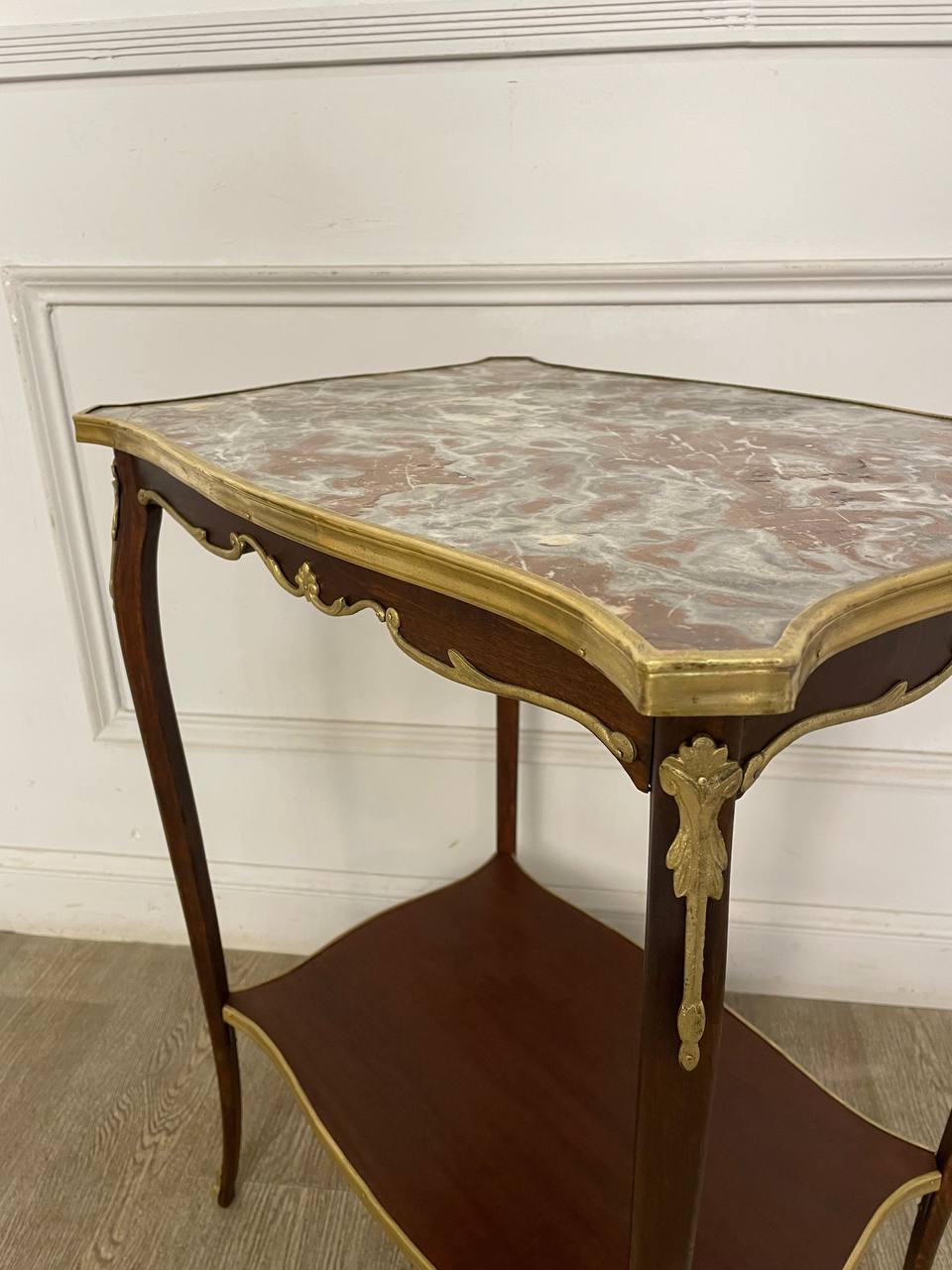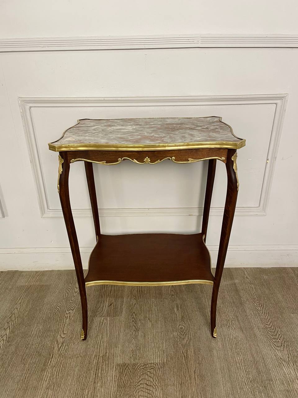 Приставной двухъярусный столик, ХIХ век, Франция. Красное дерево, латунь, бронза. Фигурная столешница из оригинального мрамора. Отличное состояние! Размер: 53х38х73h см.