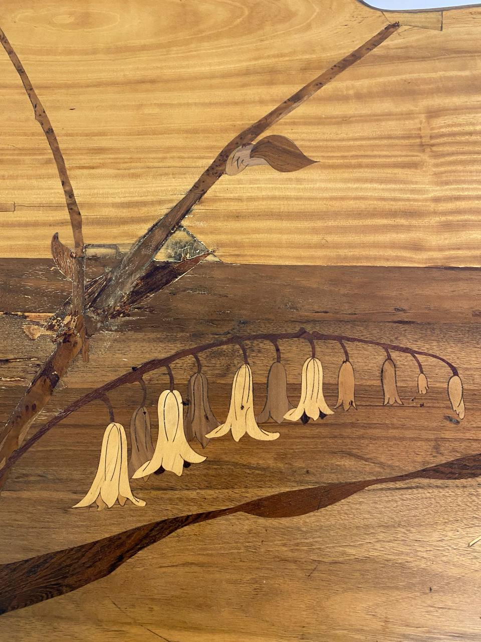 Подписной двухъярусный столик известного краснодеревщика A. Bastet, начало ХХ века, Франция. Стоит подпись. Выполнен из массива ореха. Украшен в технике маркетри, цветочный рисунок выложен из разных пород дерева: палисандр, розовое дерево, груша. Размер: 92х61х83h см. Antoine Bastet (1864-1935) — французский краснодеревщик, владел