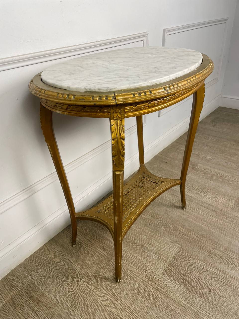 Антикварный овальный столик начала XX века, Франция. Массив дерева, позолота. Оригинальная столешница из белого мрамора. Натуральный ротанг. Размер 70х50х77h см