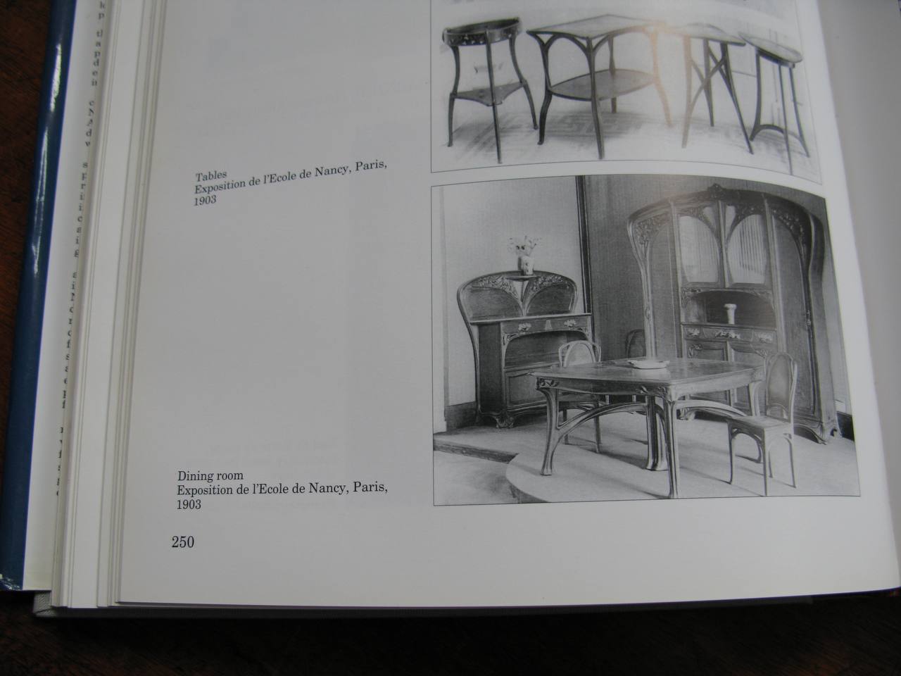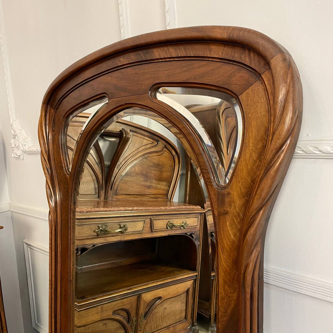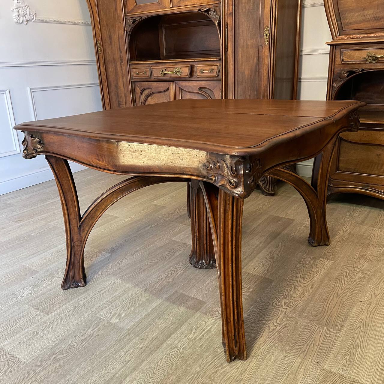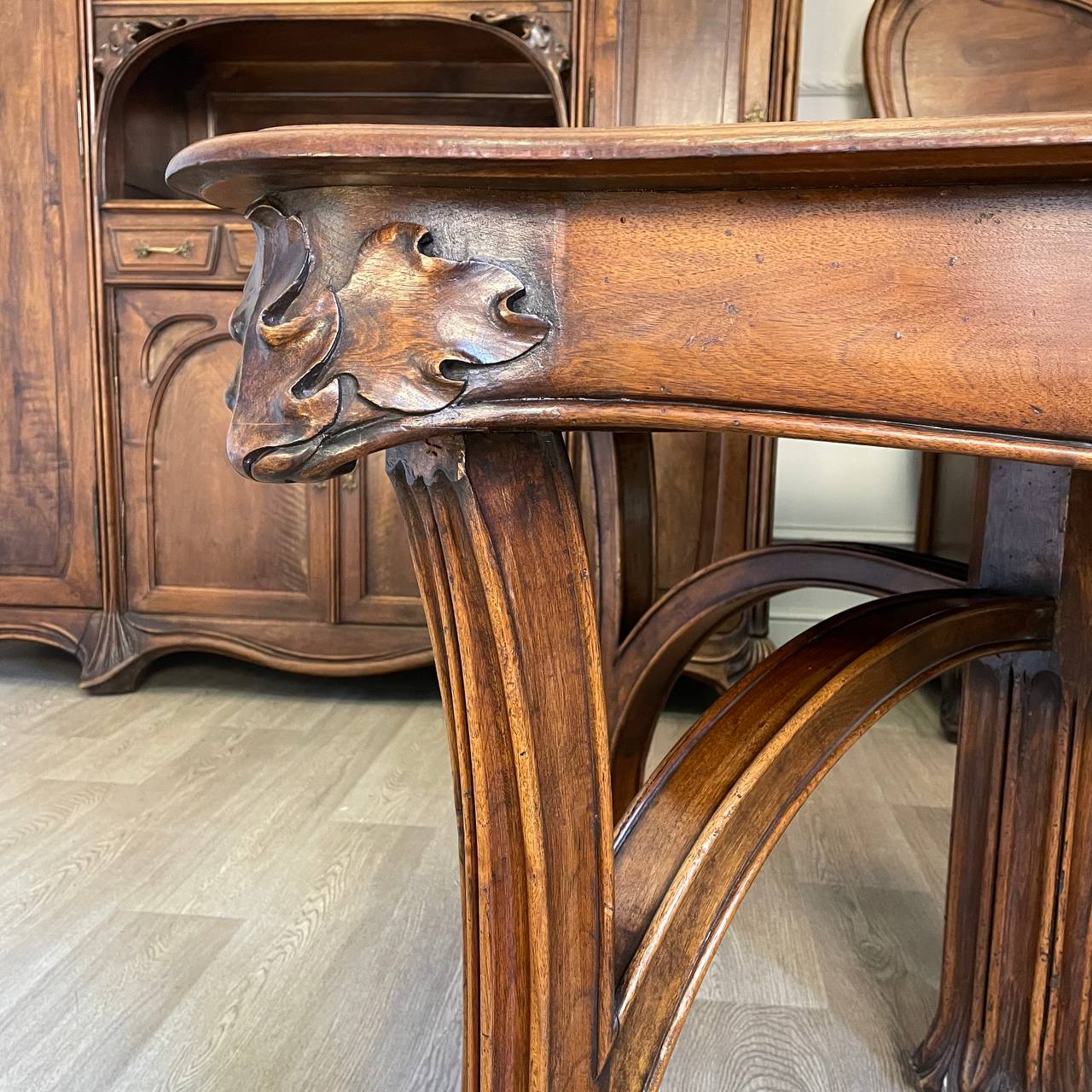 Антикварный столовый гарнитур в стиле Ар-Нуво, 1890- е годы, школа Нанси, Франция. Состоит из 4-х предметов: большой буфет, поставец, раскладывающийся стол, зеркало. Массив ореха, бронзовая оригинальная фурнитура, натуральный мрамор и стёкла с фацетом. Размер буфета: 200х49х213h см. Размер стола: 110х118х74h см. В разложенном виде: 238х110х74h см. Размер поставца: 158х50х165h см. Зеркало: 115х10х166h см. Школа Нанси - объединение художников и мастеров декоративно-прикладного искусства, работавших в столице Лотарингии в 1890-1910-х годах и сформировавших локальную стилистическую школу в рамках стиля Ар-Нуво. Среди самых значимых фигур: Эмиль Галле, Луи Мажорель, Виктор Пруве. Публикации: The Paris Salons 1895-1914 Volume III: Furniture под ред. Alastair Duncan