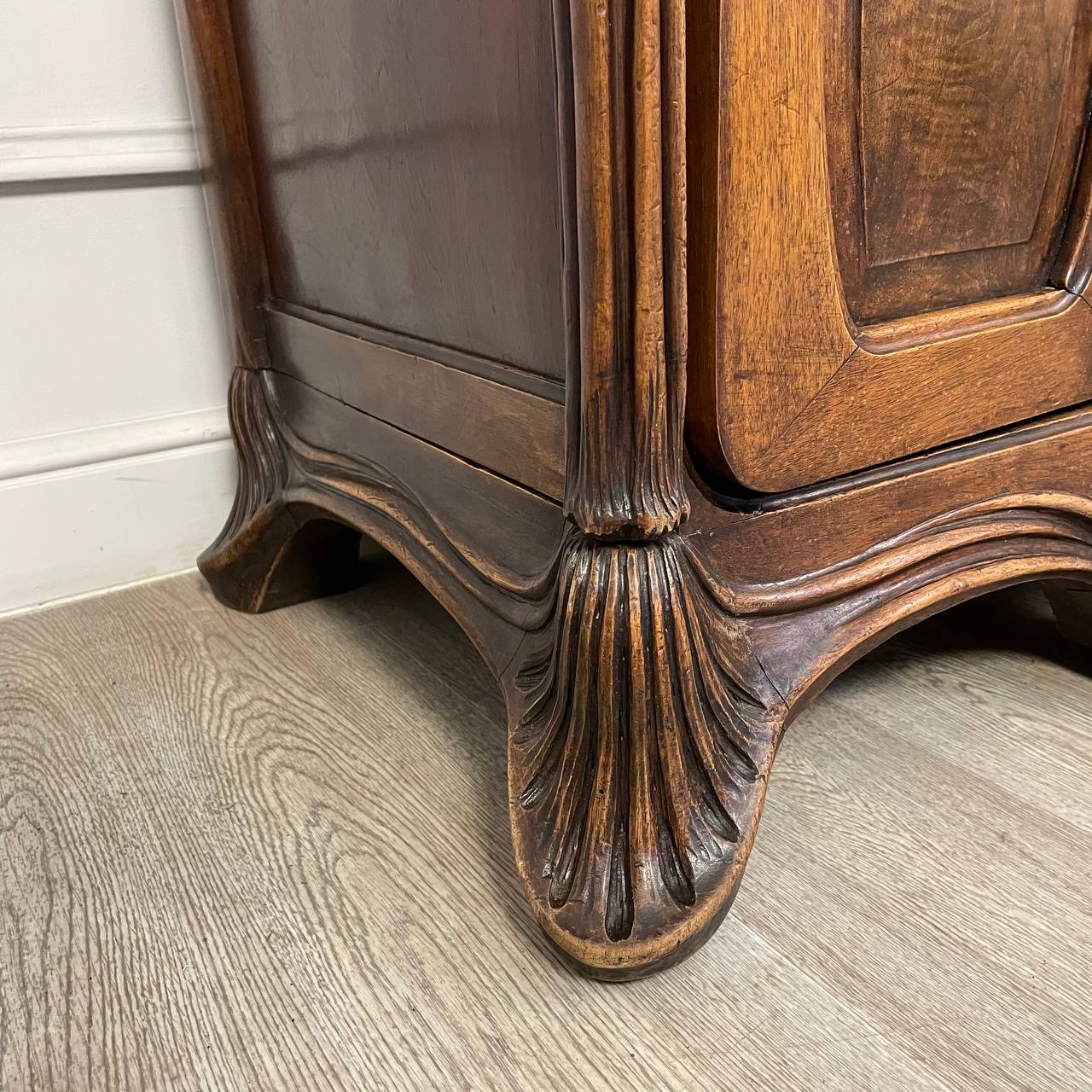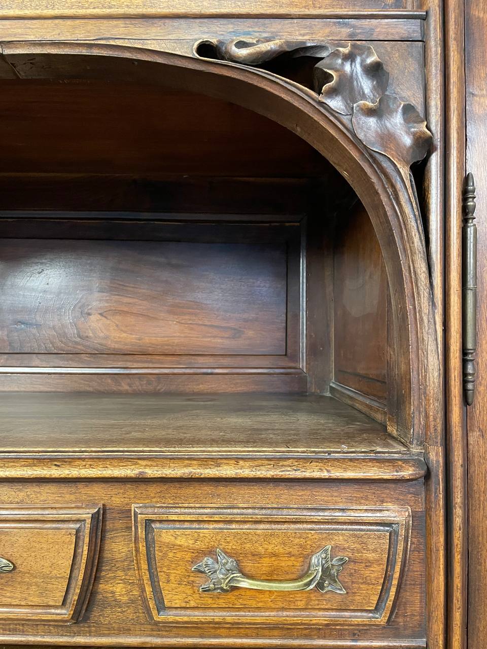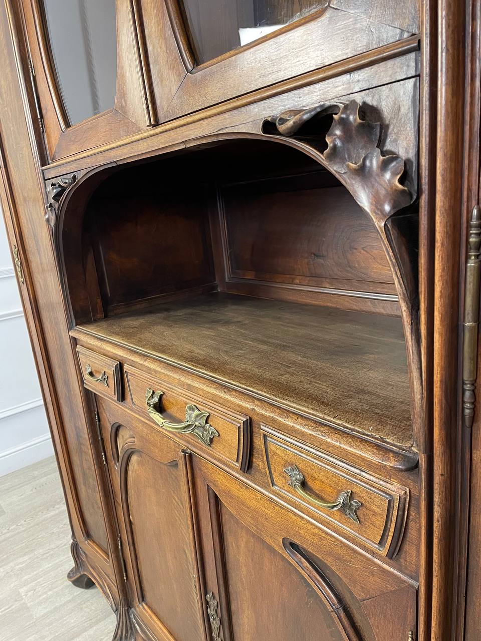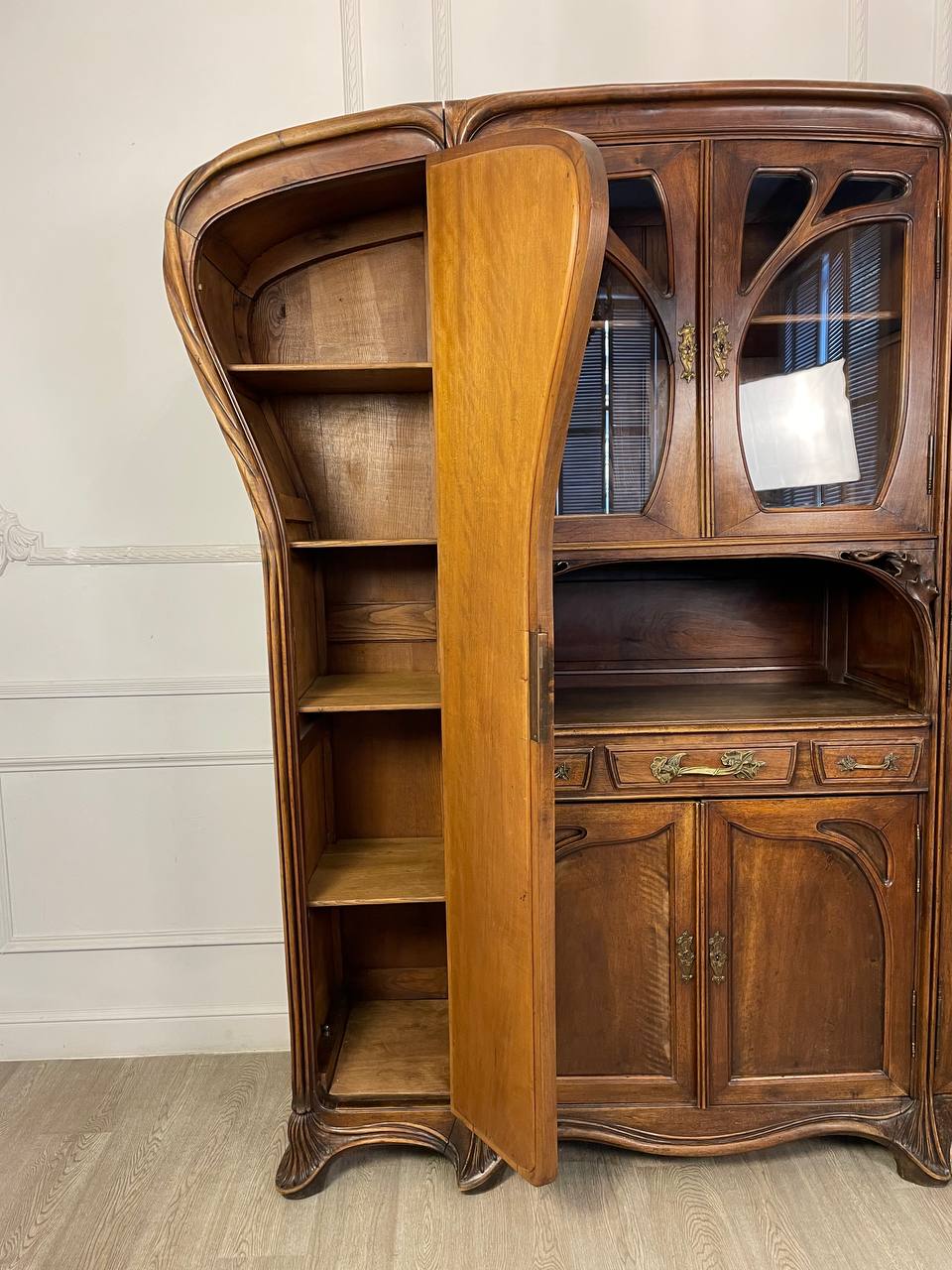 Антикварный столовый гарнитур в стиле Ар-Нуво, 1890- е годы, школа Нанси, Франция. Состоит из 4-х предметов: большой буфет, поставец, раскладывающийся стол, зеркало. Массив ореха, бронзовая оригинальная фурнитура, натуральный мрамор и стёкла с фацетом. Размер буфета: 200х49х213h см. Размер стола: 110х118х74h см. В разложенном виде: 238х110х74h см. Размер поставца: 158х50х165h см. Зеркало: 115х10х166h см. Школа Нанси - объединение художников и мастеров декоративно-прикладного искусства, работавших в столице Лотарингии в 1890-1910-х годах и сформировавших локальную стилистическую школу в рамках стиля Ар-Нуво. Среди самых значимых фигур: Эмиль Галле, Луи Мажорель, Виктор Пруве. Публикации: The Paris Salons 1895-1914 Volume III: Furniture под ред. Alastair Duncan