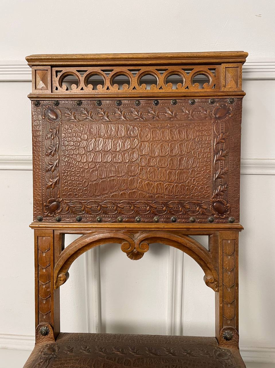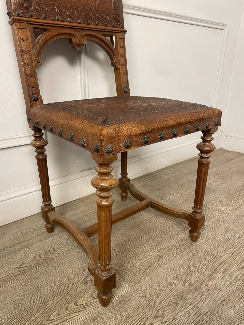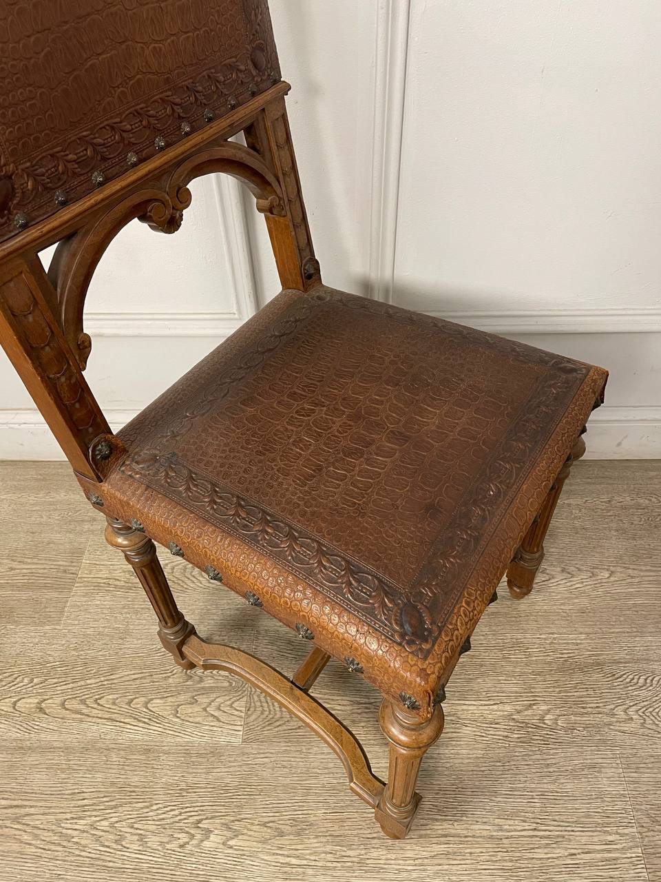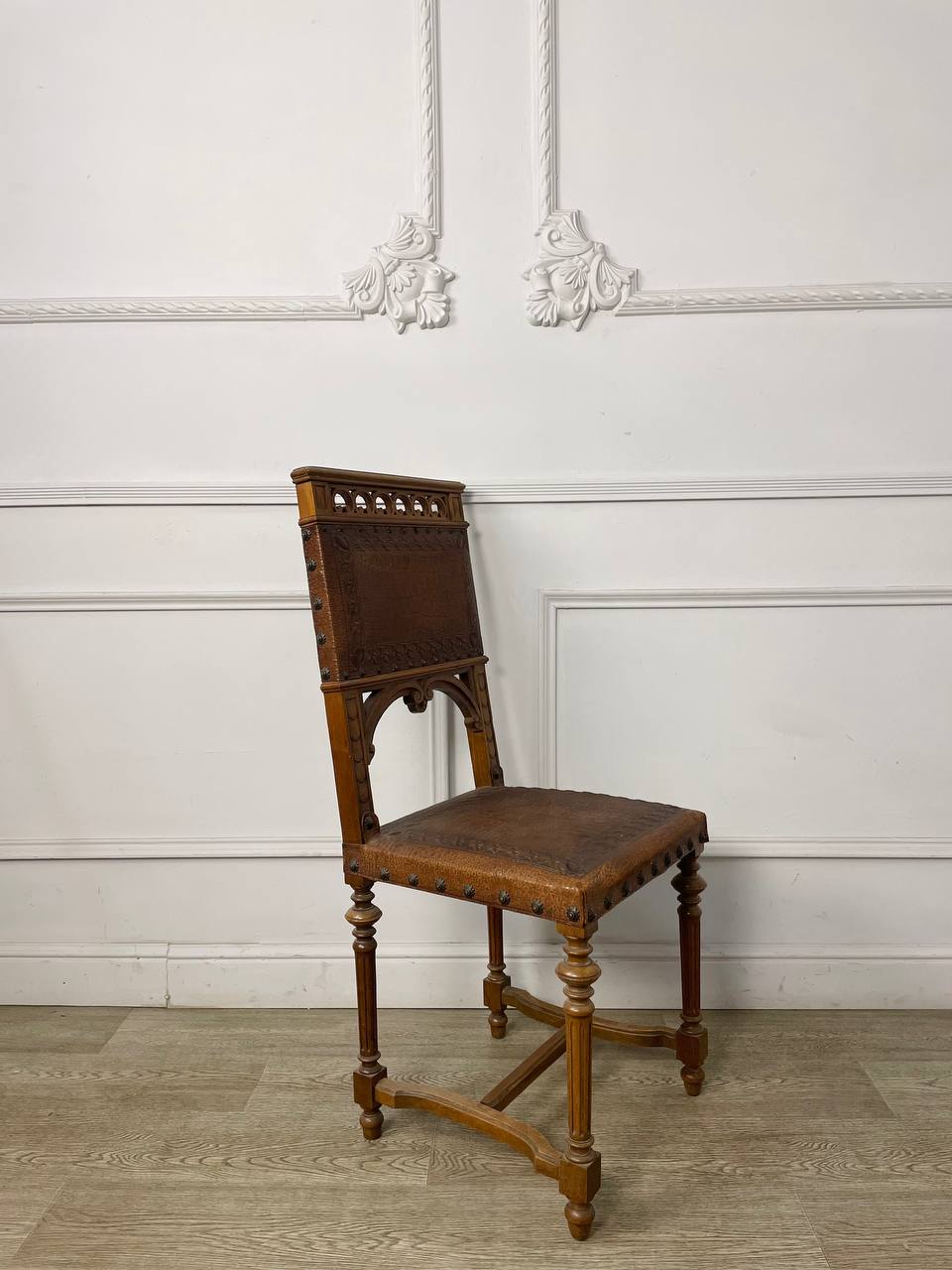 Антикварный стул начала XX века, Франция. Выполнен из массива ореха. Оригинальные гвозди. Оригинальная кожа тисненая. Размер 43х48х100h см. Высота сиденья от пола 47 см.
