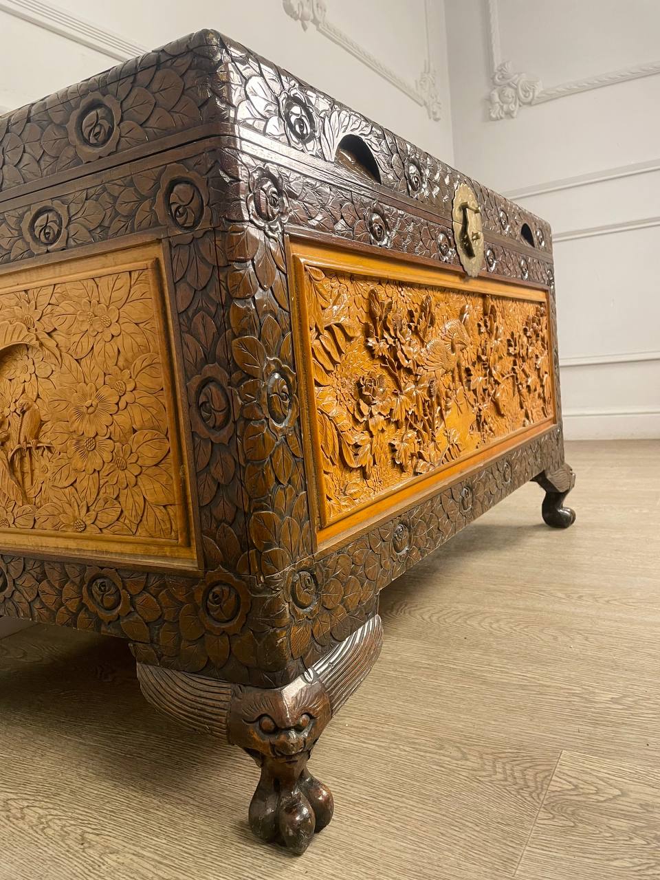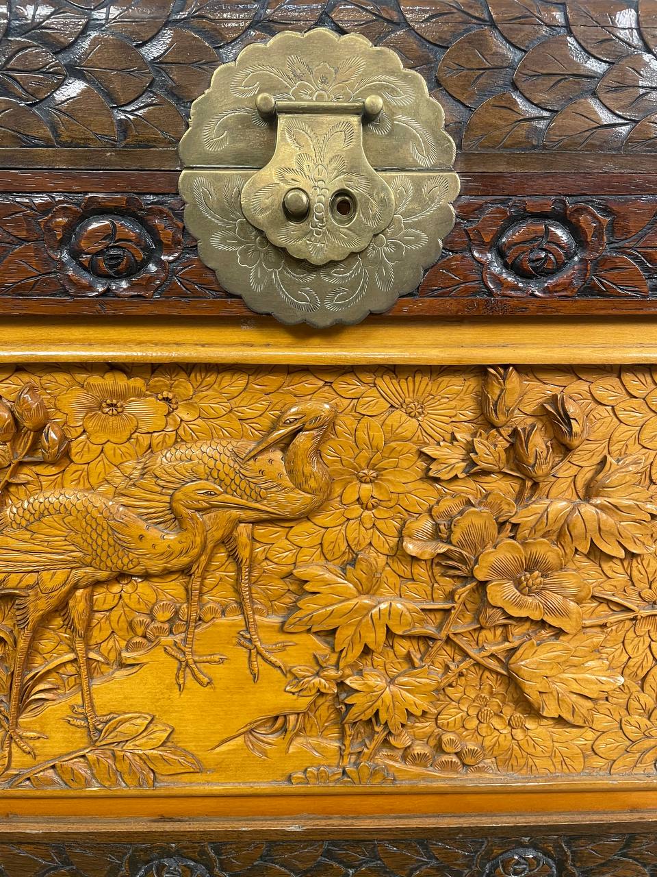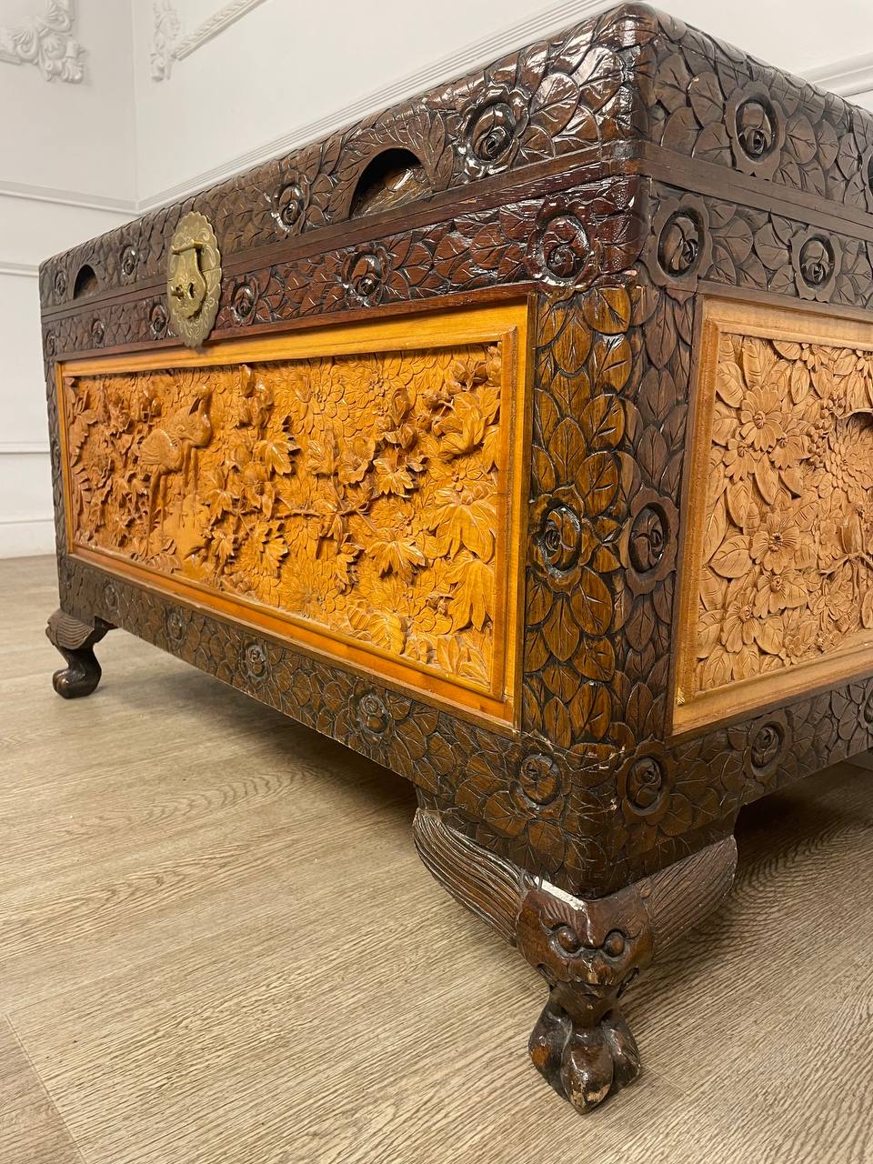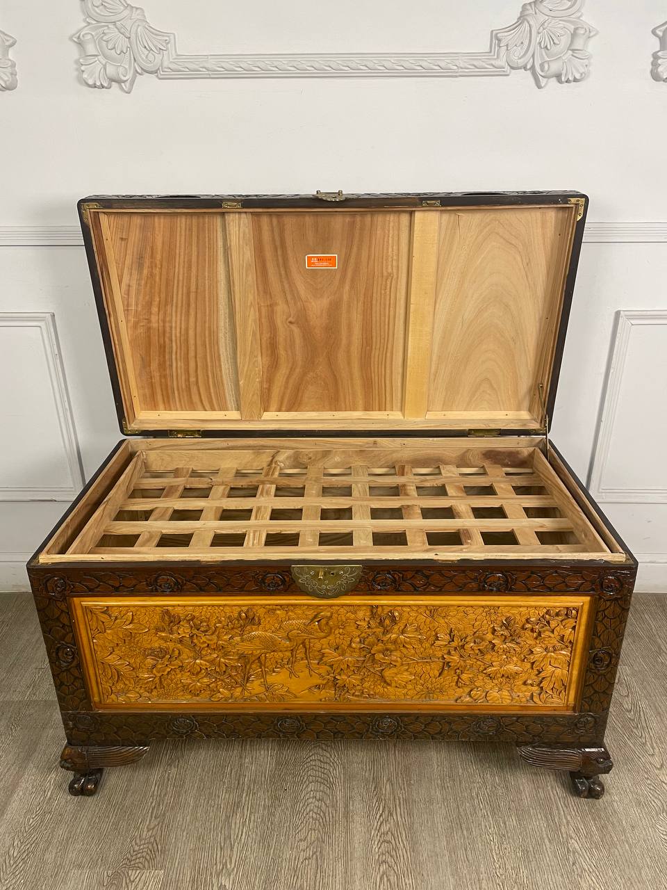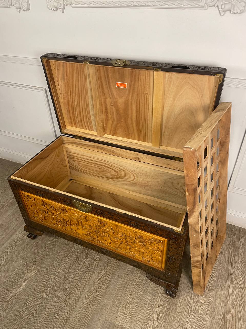 Антикварный сундук в стиле шинуазри 1970-1980х годов, Китай. Выполнен из сандалого и лимонного дерева. Украшен изумительной резьбой на тему «цветы и птицы» со всех сторон. Оригинальная латунная фурнитура. С двух сторон на крышке выемки для рук. Внутри находится сетчатая полка. Размер 104х56х61h см.