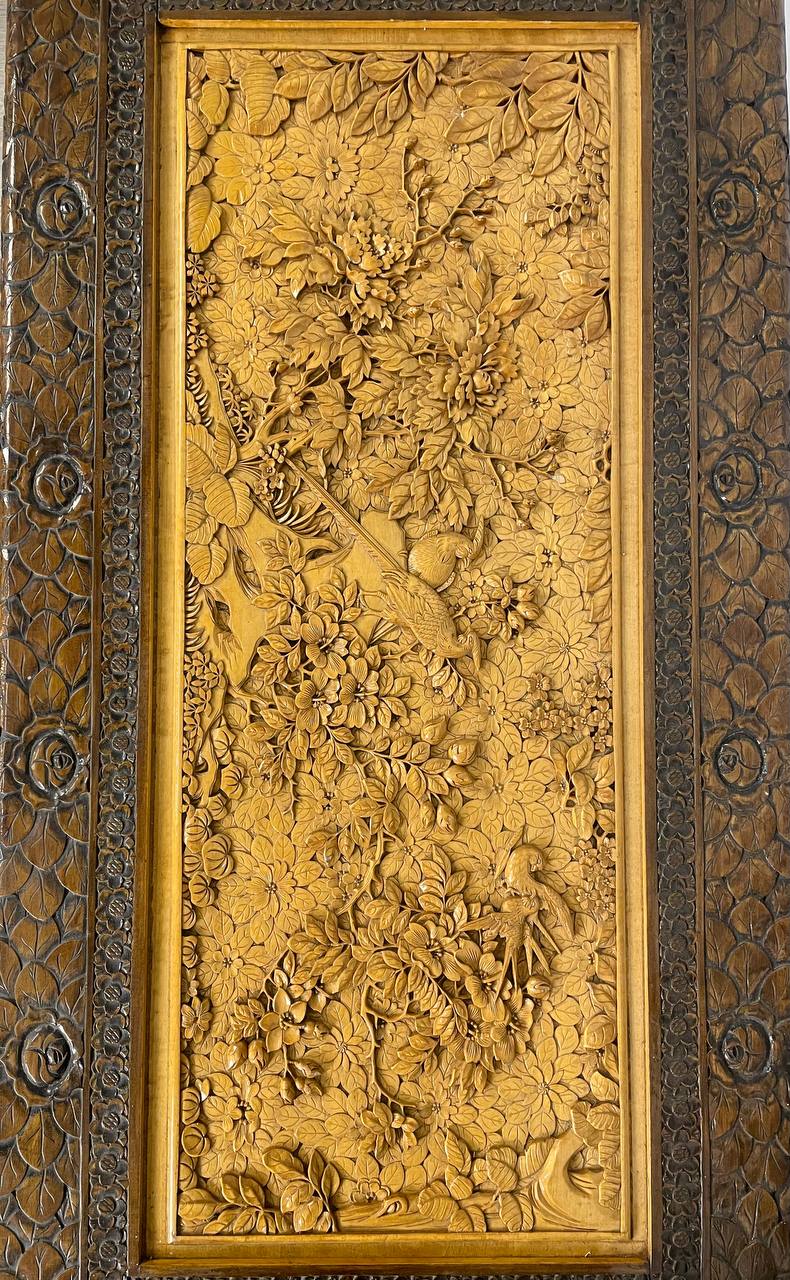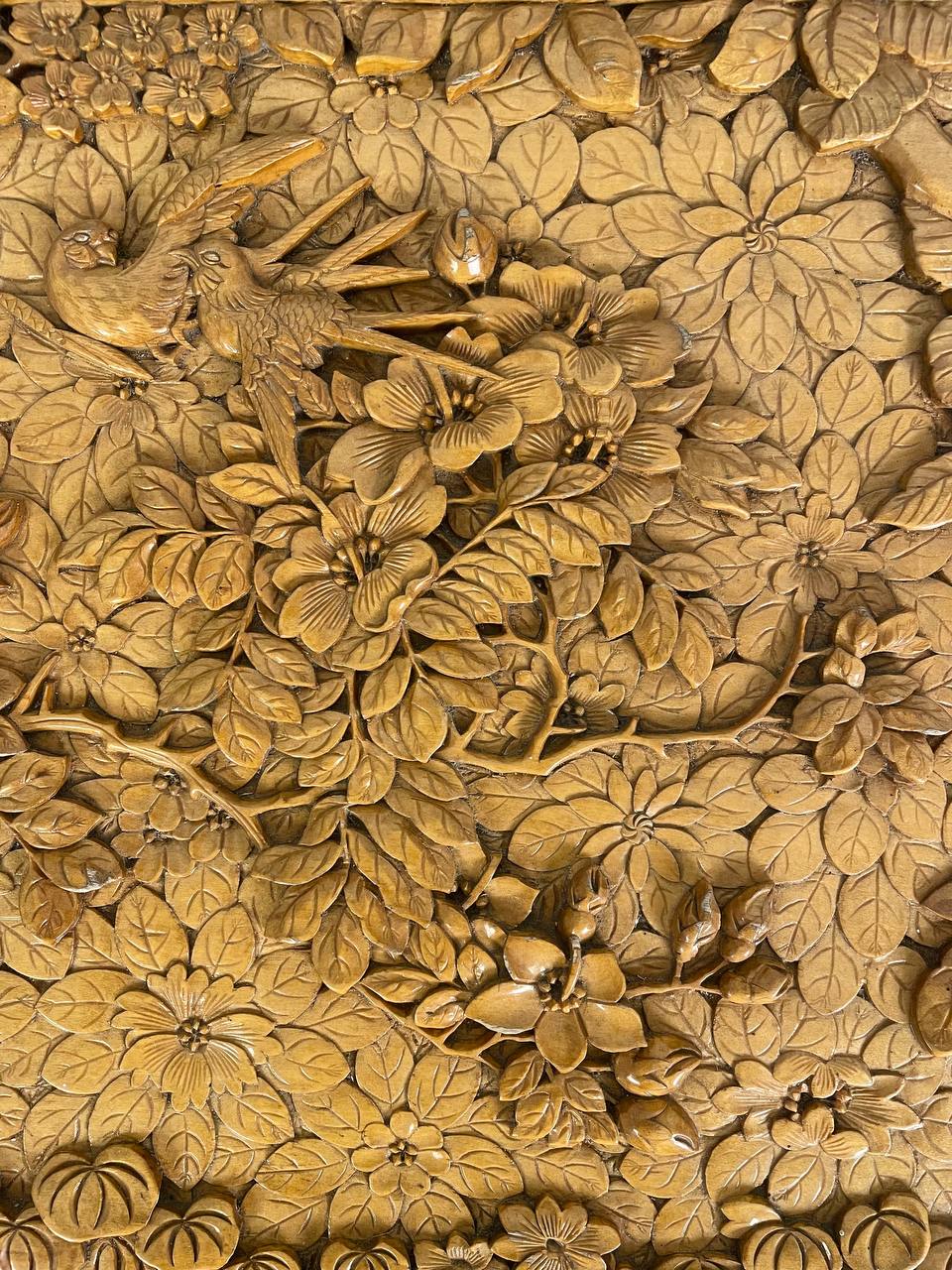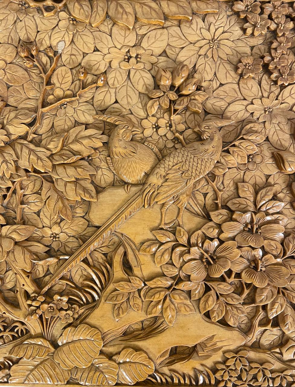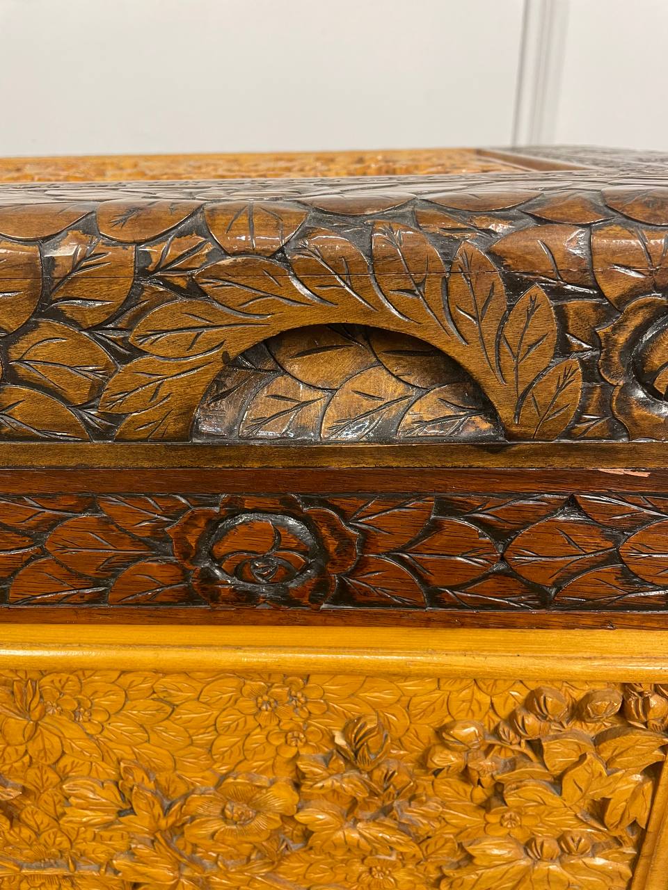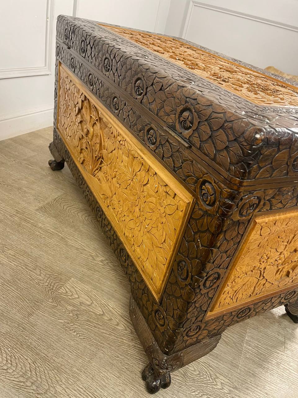 Антикварный сундук в стиле шинуазри 1970-1980х годов, Китай. Выполнен из сандалого и лимонного дерева. Украшен изумительной резьбой на тему «цветы и птицы» со всех сторон. Оригинальная латунная фурнитура. С двух сторон на крышке выемки для рук. Внутри находится сетчатая полка. Размер 104х56х61h см.