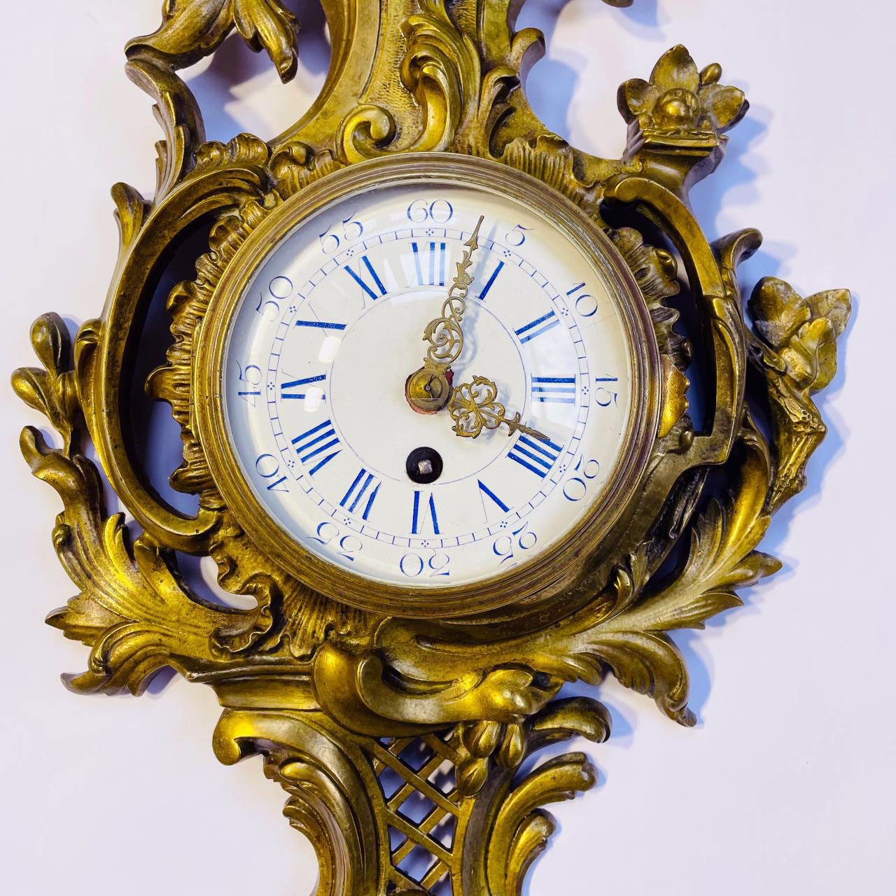 Бронзовые антикварные настенные Часы XIX-XX века Франция. Роскошное бронзовое литье. Механизм работает, часы прошли реставрацию. Размер 30х50h см.