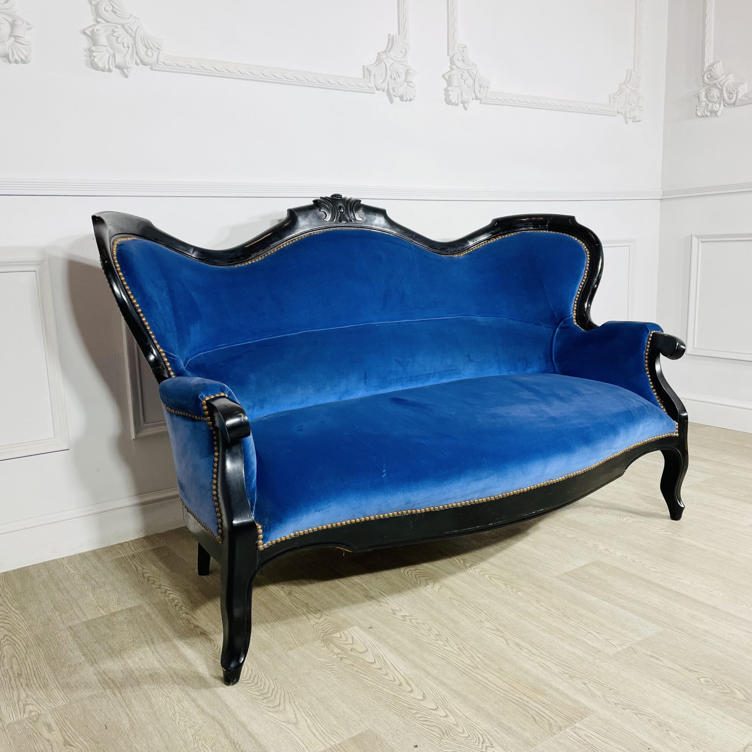 Низкий антикварный диван ярко синего цвета середины XX века, Франция. Выполнен из массива дерева и ярко синего велюра. Размер 155х80х96h см.