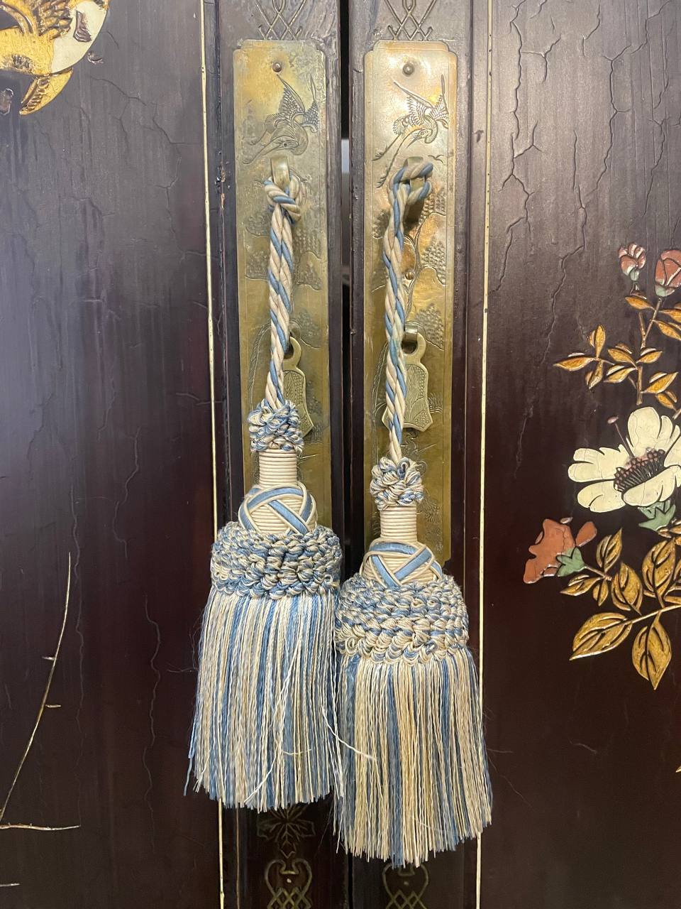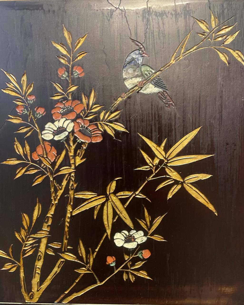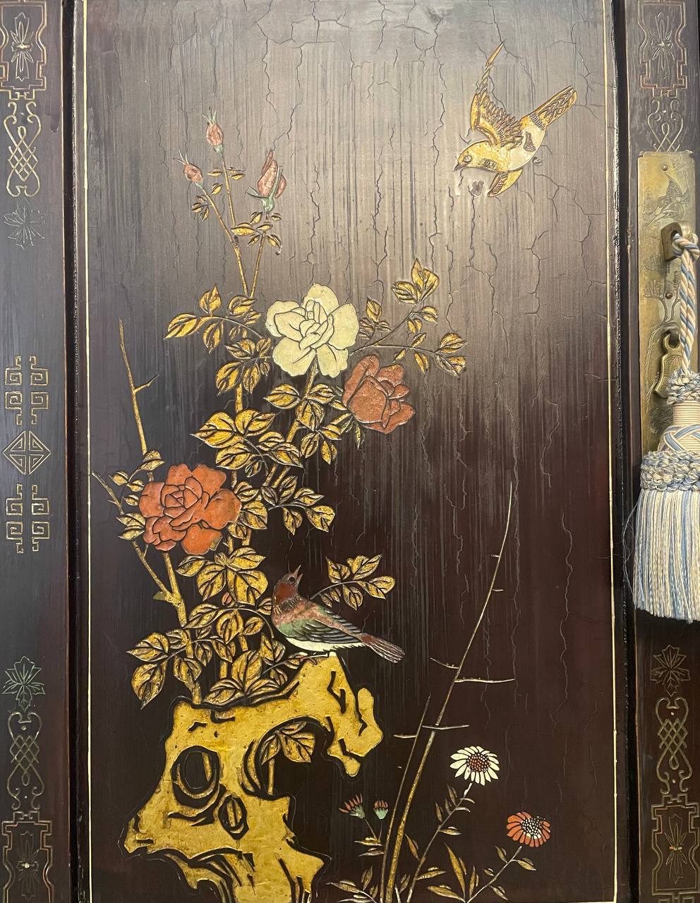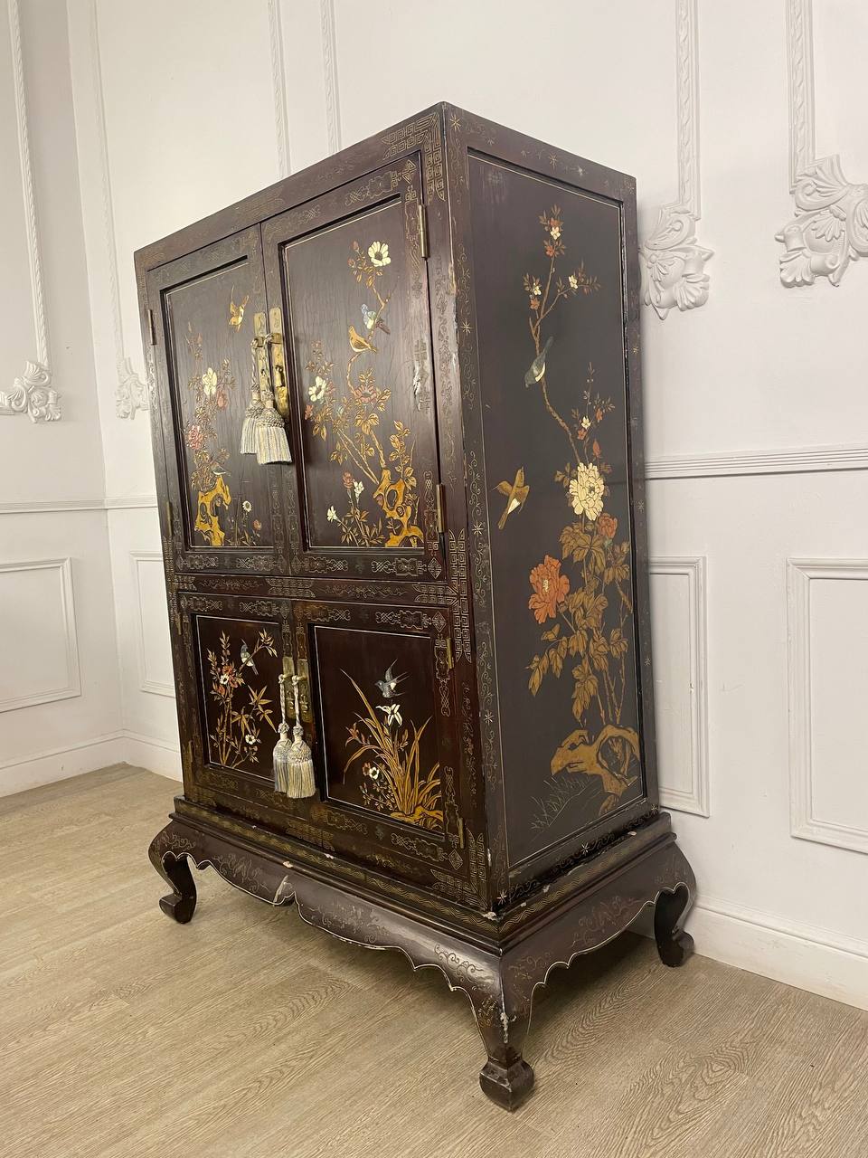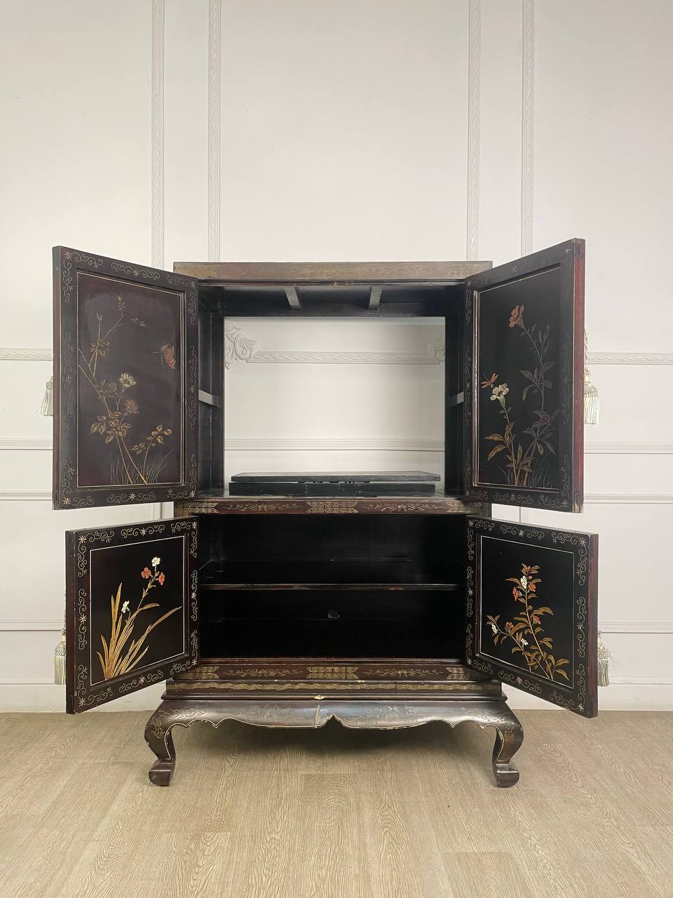 Антикварный шкаф в стиле Шинуазри на подставке первой половины XX века, Китай. Выполнен из массива дерева, тонирован в коричневый цвет с ручной росписью на тему «цветы и птицы». В нижней части полка, верхняя часть предназначена для ТВ. Оригинальная латунная фурнитура. Размер 105х58х149h см.