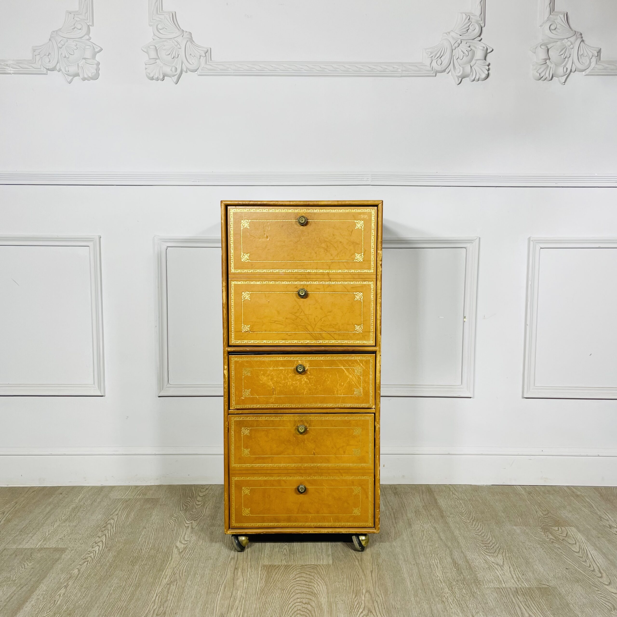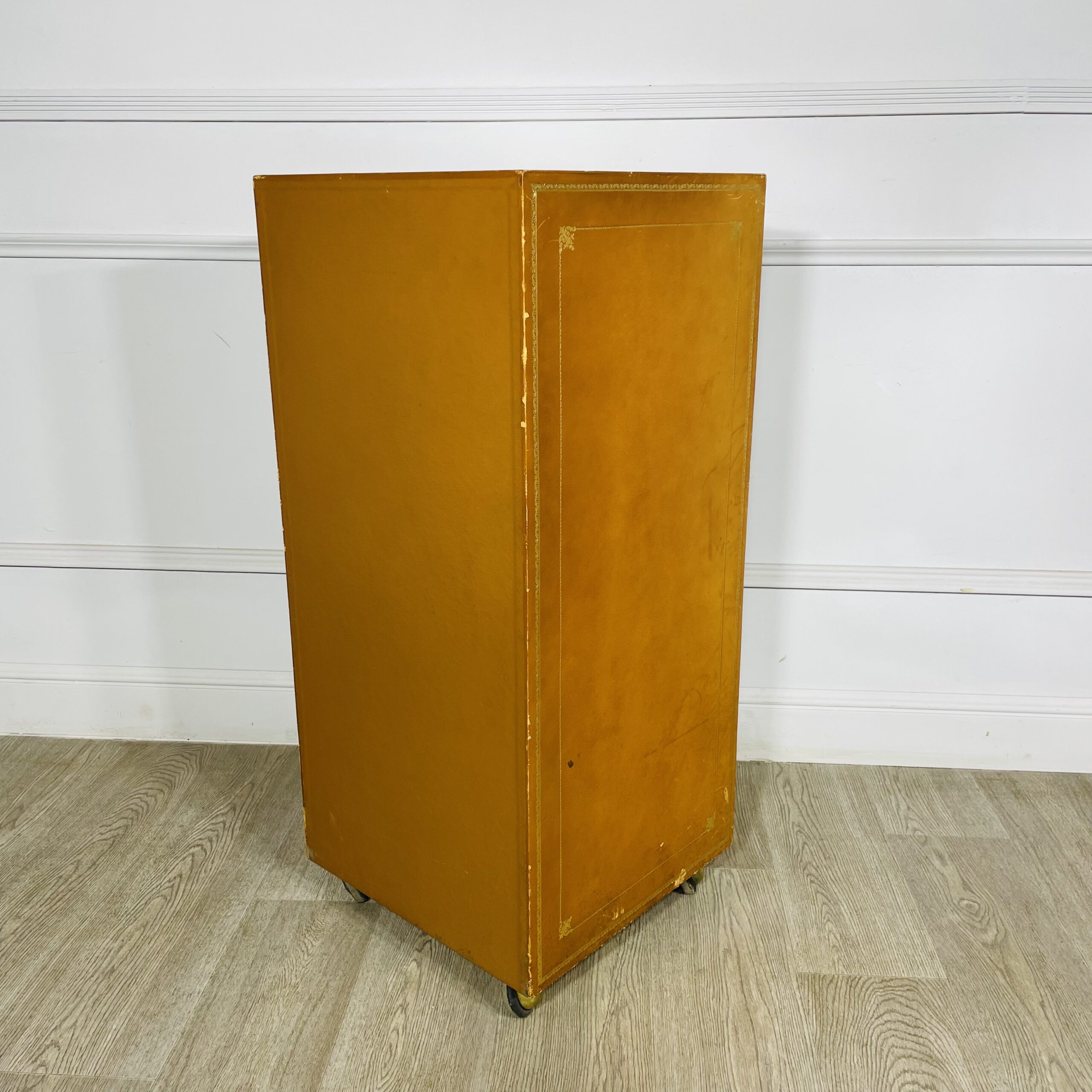 Высокий комод (картоньер) на колесиках середины XX века, Франция. Со всех сторон обтянут кожей с золотым тиснением. Размер 39х30х88h см.
