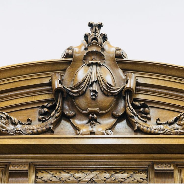 Музейного уровня шкаф-поставец уникально крупного масштаба с зеркалом XIX века, Франция. Выполнен из ореха, высокохудожественная резьба. Все элементы выполнены вручную. Был изготовлен по индивидуальному заказу для одного из замков Луары. Оригинальное зеркало с фацетом. Размер 245х62х345h см.