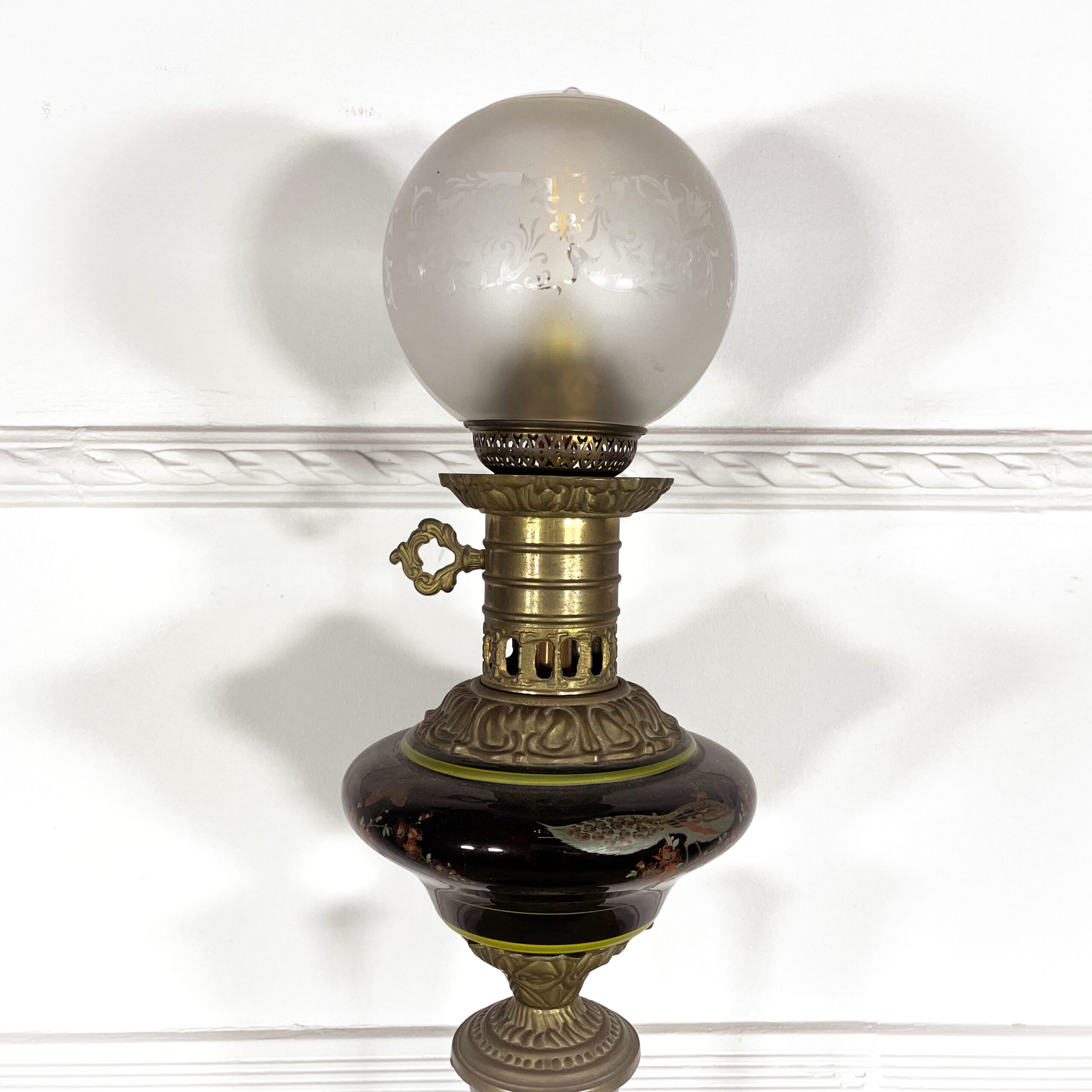 Лампы парные антикварные, XIX век, Франция. Когда-то были керосиновыми, позднее их переделали в электрические. На иссиня-черном фарфоре изображены павлины, ручная роспись В рабочем состоянии. Высота 84 см. Диаметр основания 20 см.