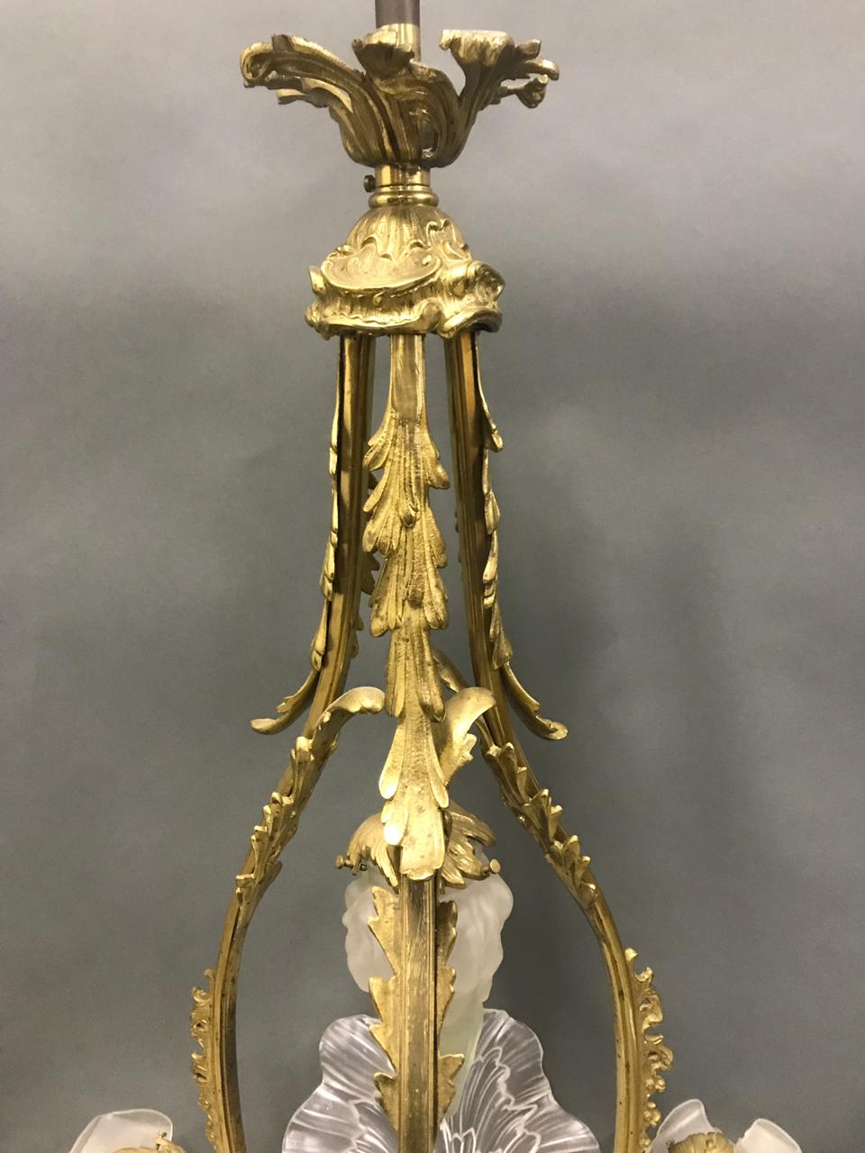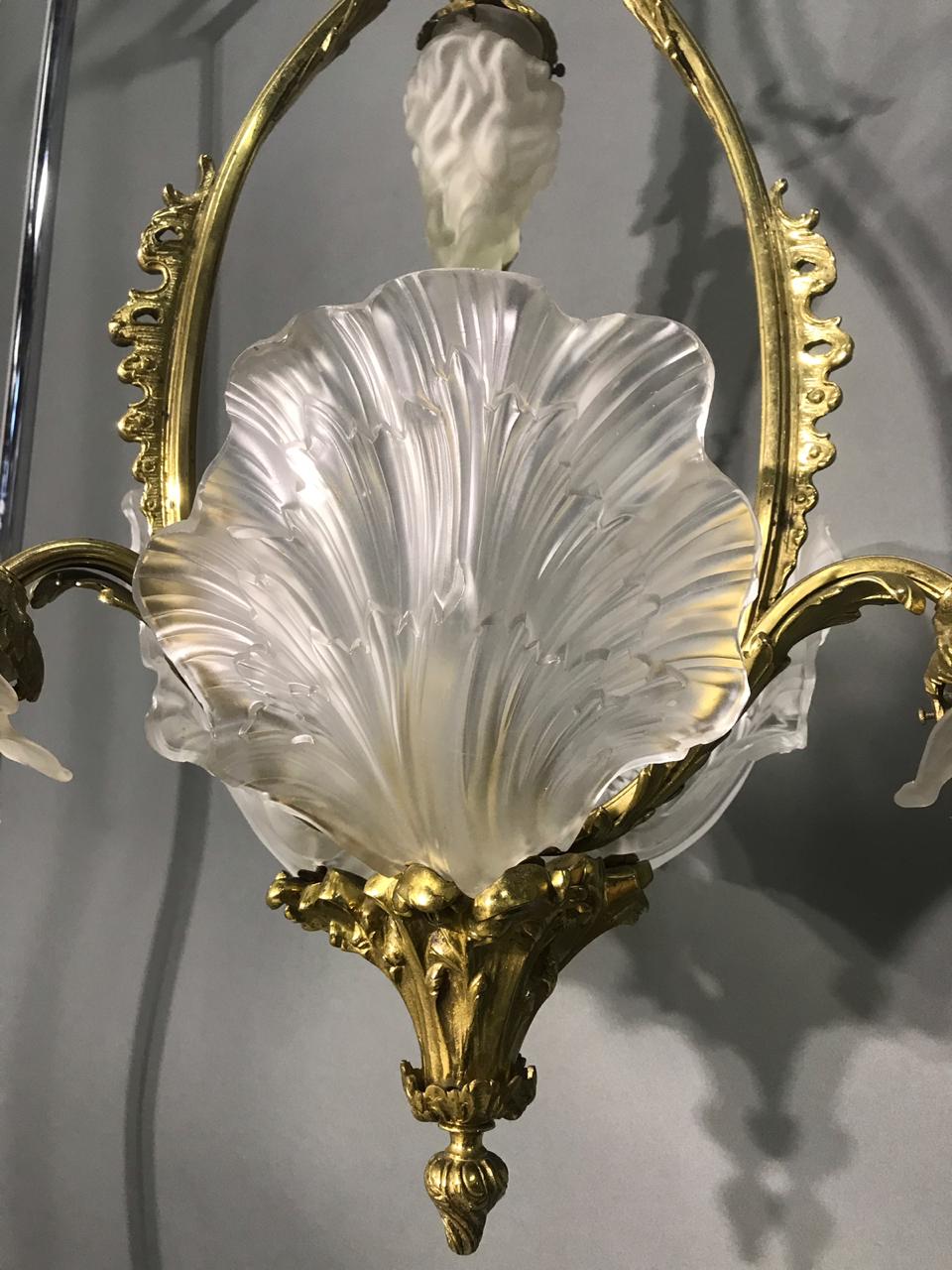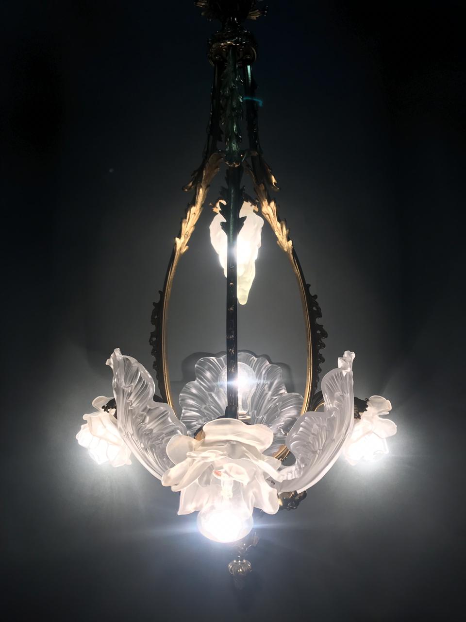 Антикварная бронзовая люстра на 5 лампочек, рубеж XIX-XX веков, Франция. Сохранены оригинальные плафоны из матового стекла. Центральная часть сделана в виде раковины. Высота - 90 см. Диаметр - 50 см.