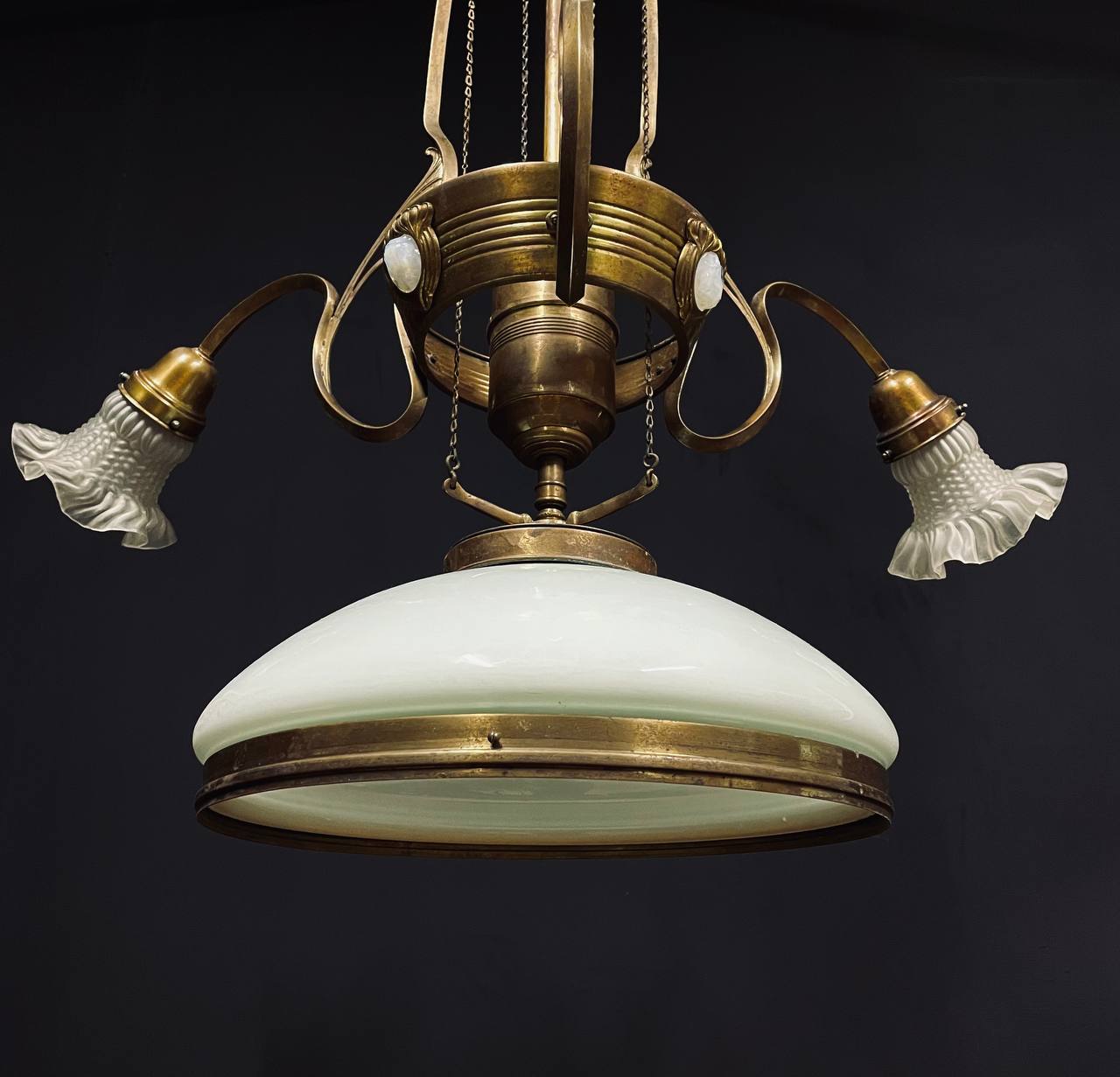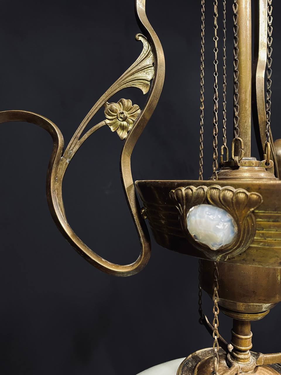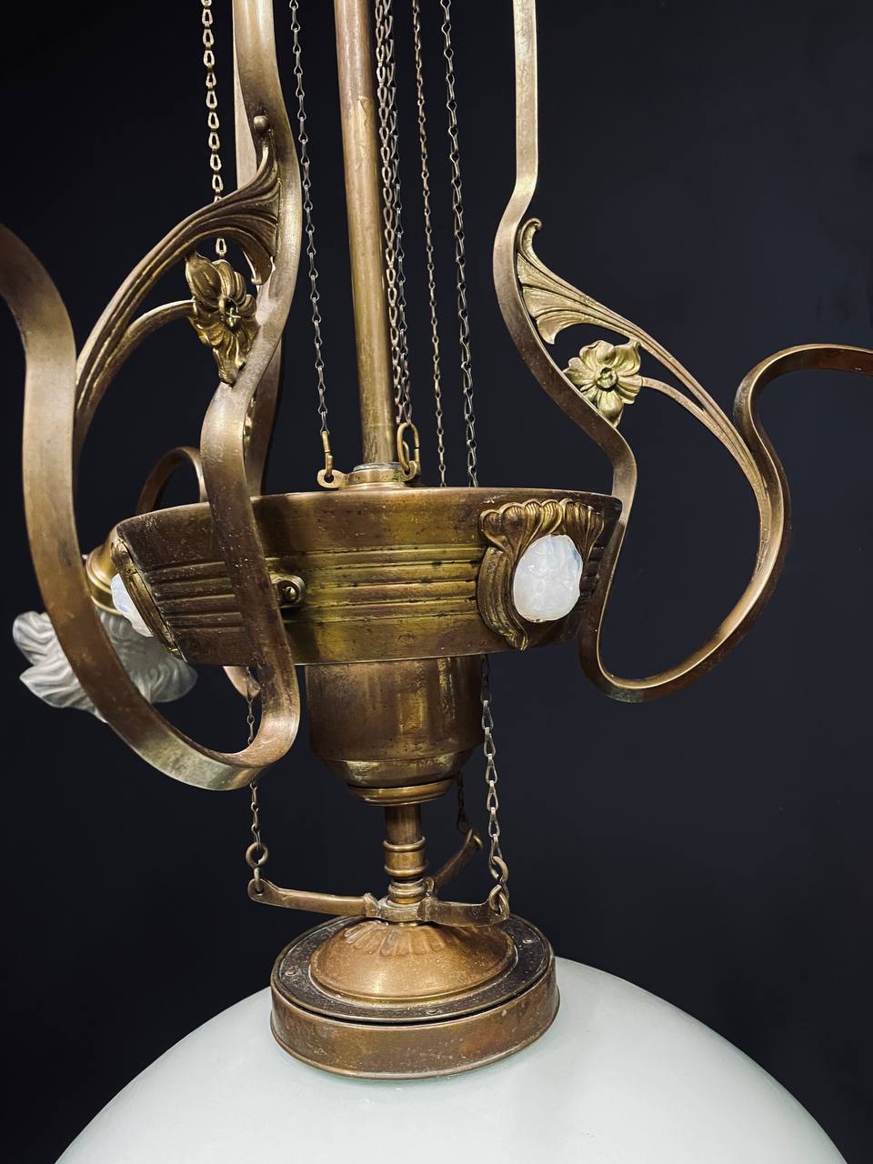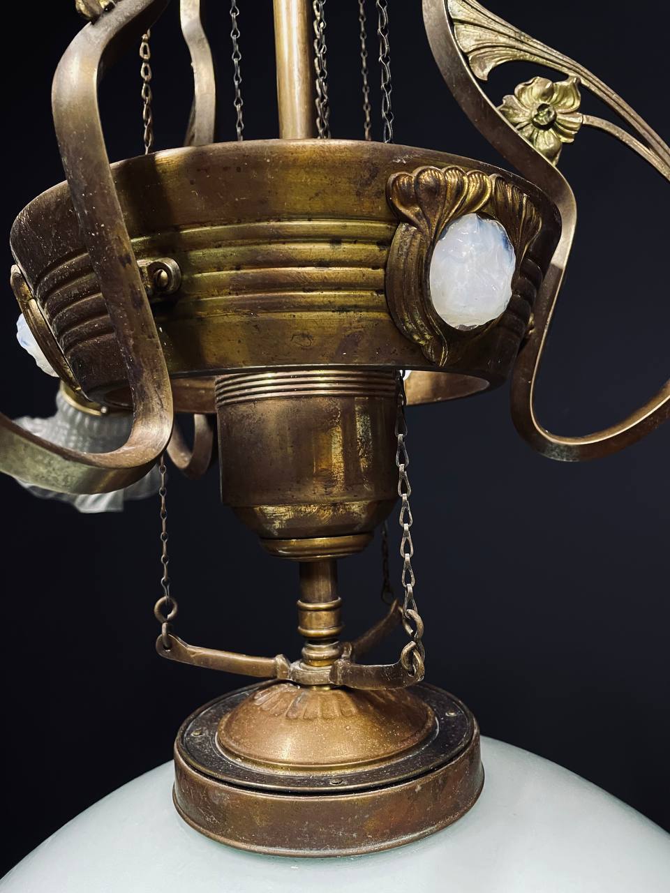 Люстра Ар-нуво начала XX века, Россия. Выполнена из латуни. Оригинальный центральный плафон. Механизм для регулировки высоты. Д 90 см. В 100-138h см.