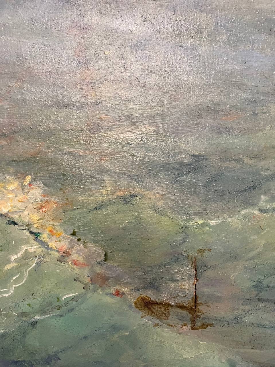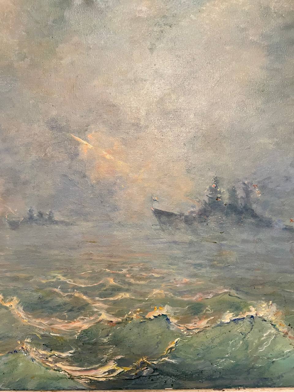 «Маневры Флота» И.Ф. Васильев, 1981 год, Москва. Оригинальный багет с подвесами. Есть небольшой разрыв (возможно отреставрировать в нашей реставрационной мастерской). Подпись правый нижний угол. Размер 106х73 см. Васильев Илья Федотович 1925 года рождения. Ветеран Вооруженных Сил СССР. Народная Изостудия ЦДСА им. Фрунзе.