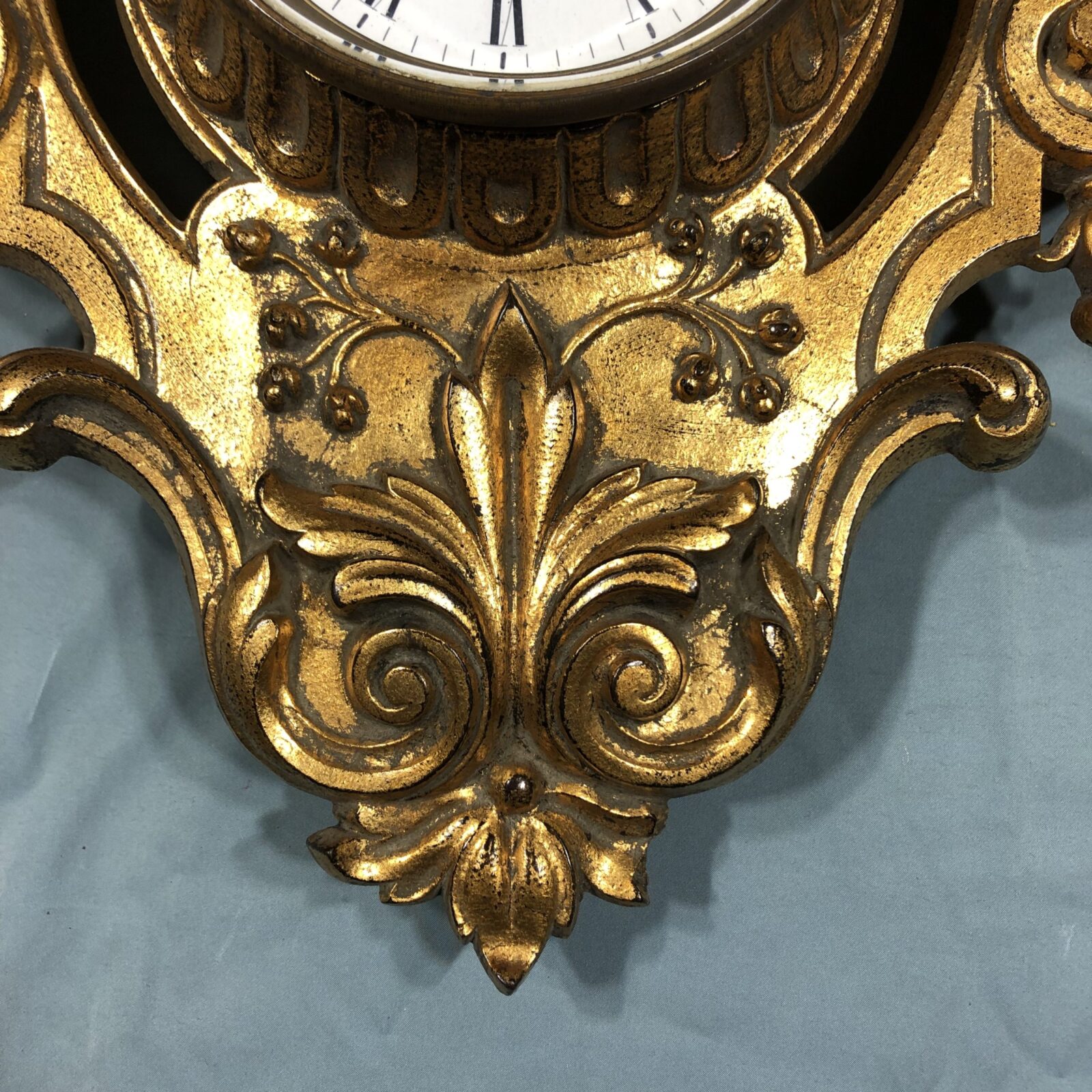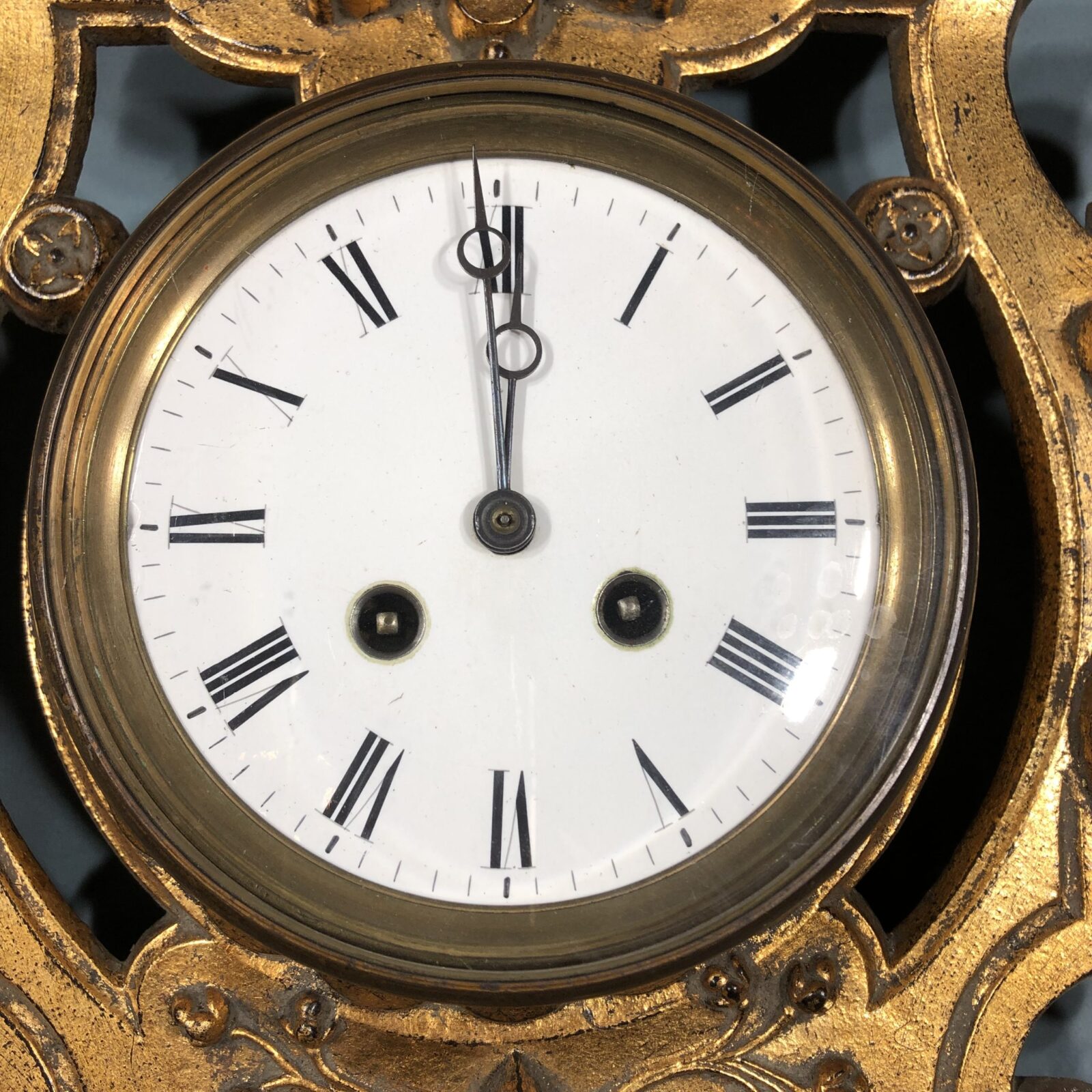 Настенные антикварные часы XIX-XX Века Франция. Выполнены из бронзы и позолоты. Бой каждые 30 мин. Ключ в комплекте. Размер 35х43h см.