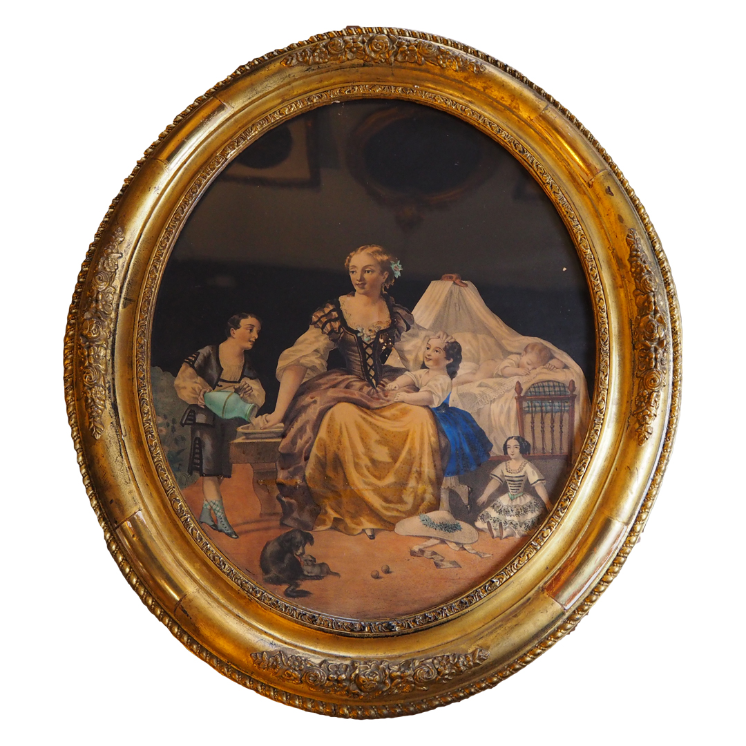 Пара антикварных эстампов “Мать и дети” в овальных рамах.