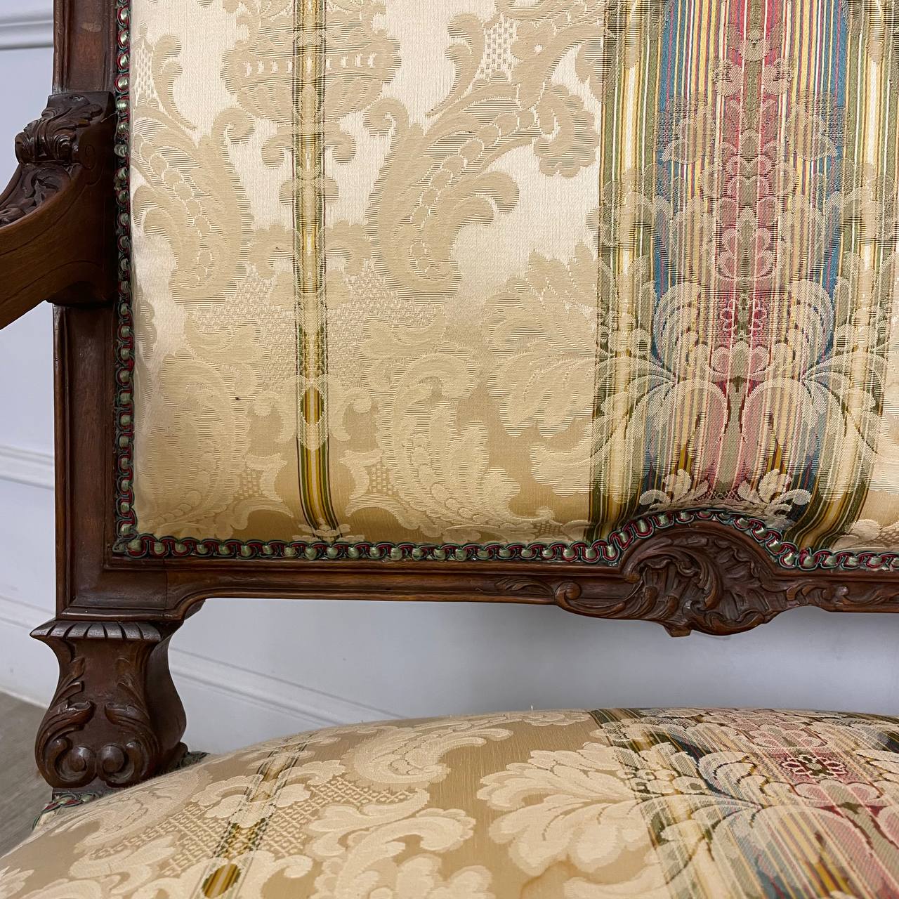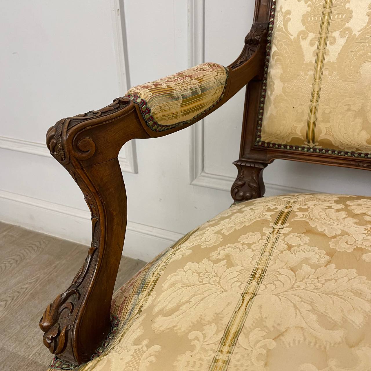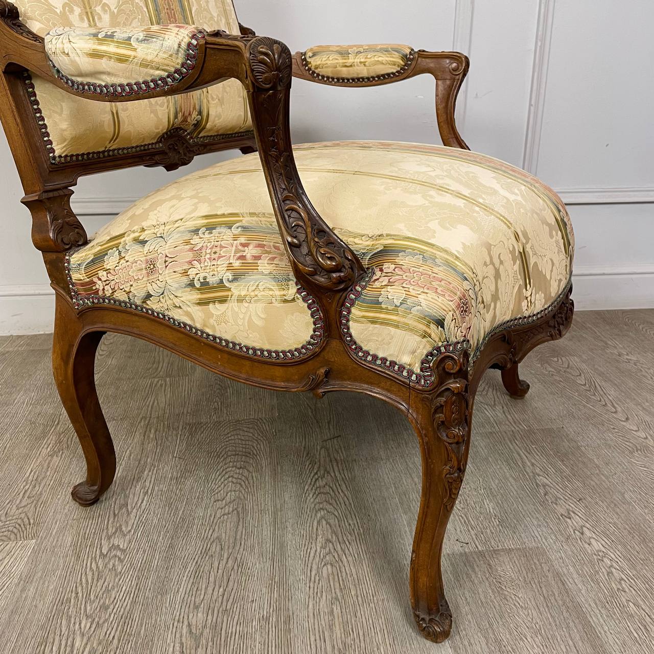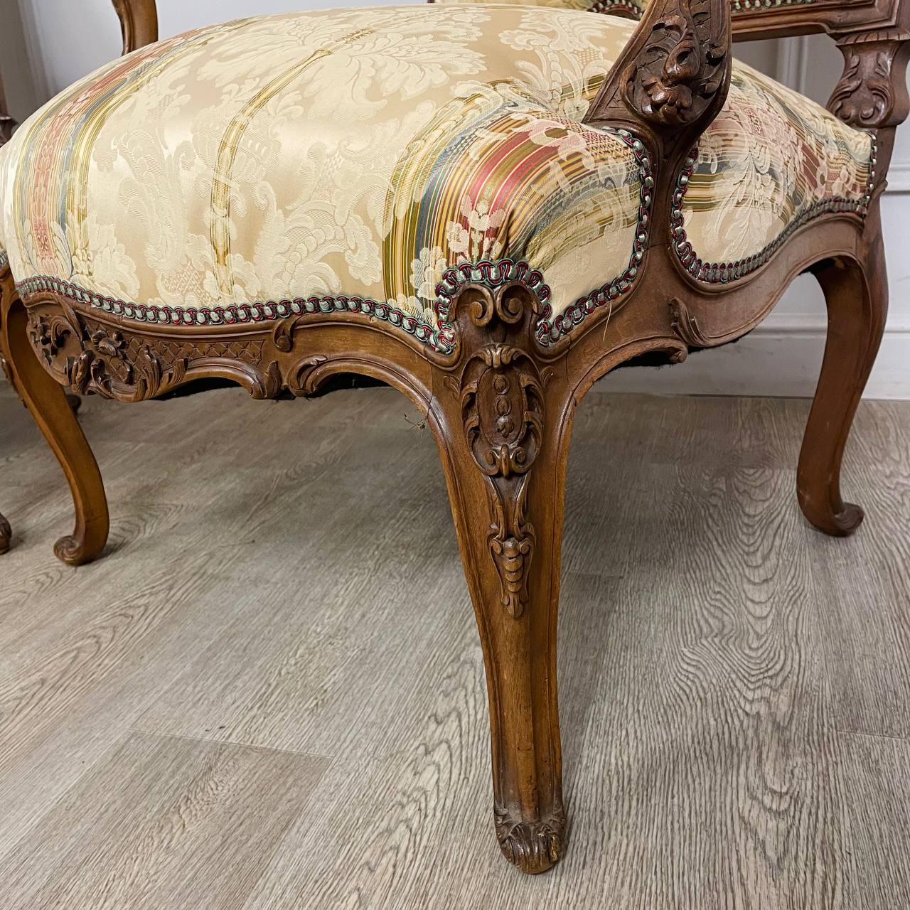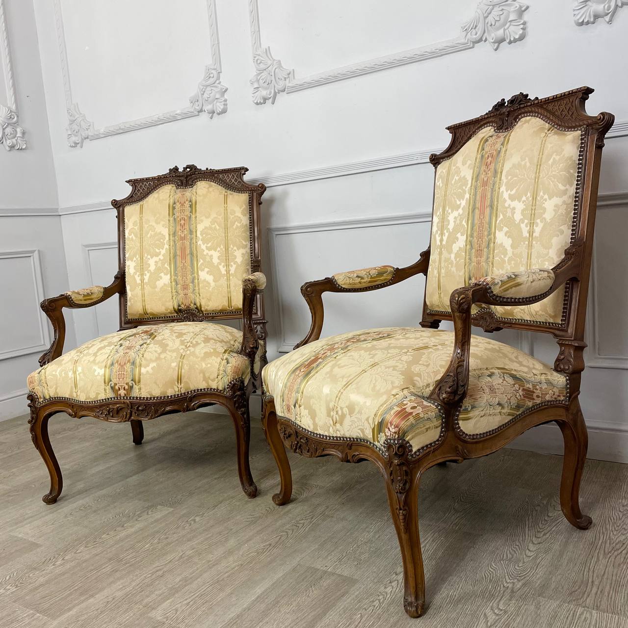 Пара антикварных кресел в стиле Louis XV конца XIX века, Франция. Выполнены из массива ореха. Великолепная резьба ручной работы. Ткань новая. Размер 72х76х106h см