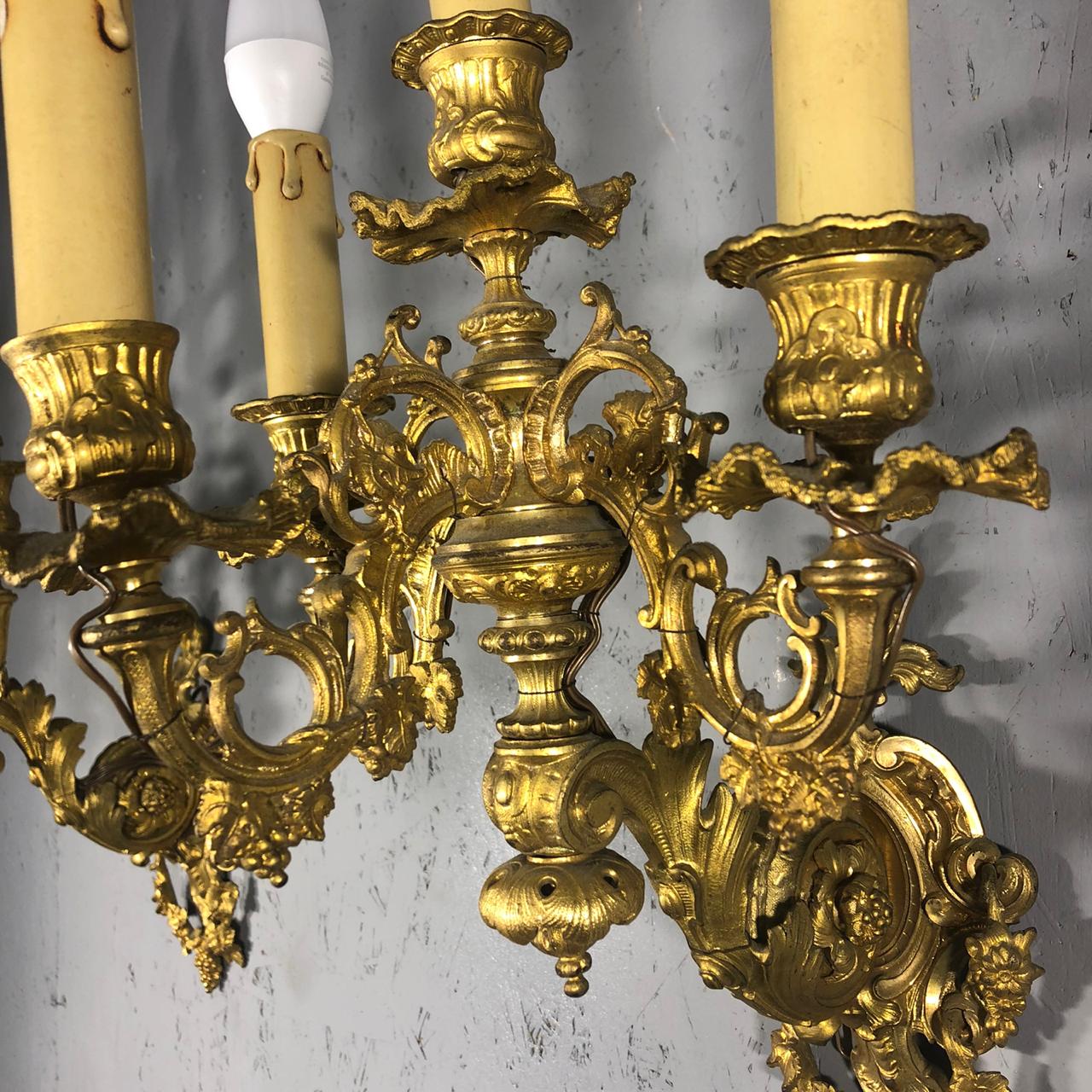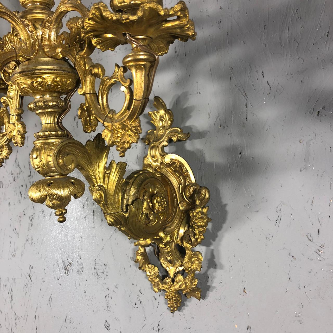 Парные бра XIX века, Франция. Выполнены из золоченой бронзы великолепного качества литья. Каждое на 4 лампочки. Размер 30х30х50h см.