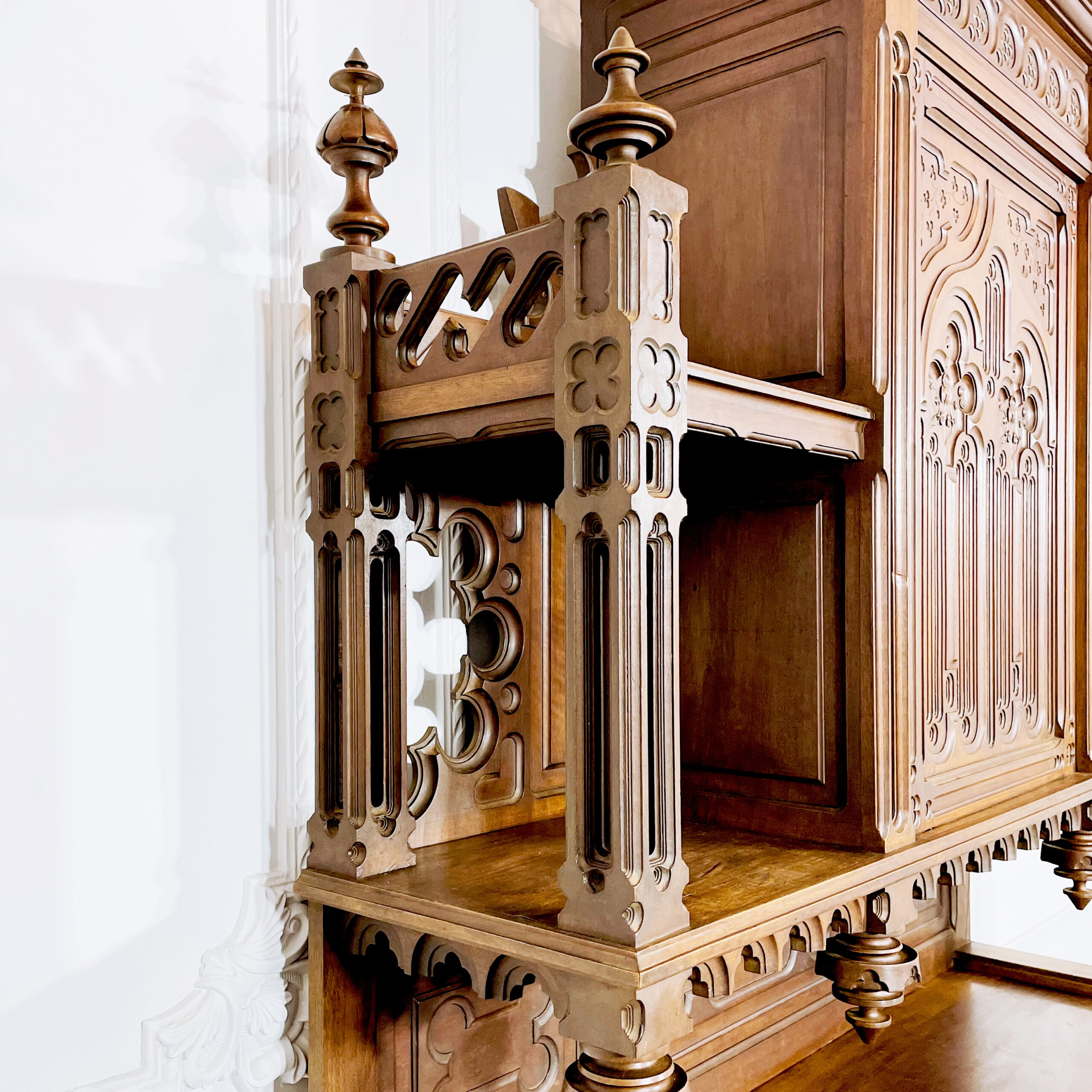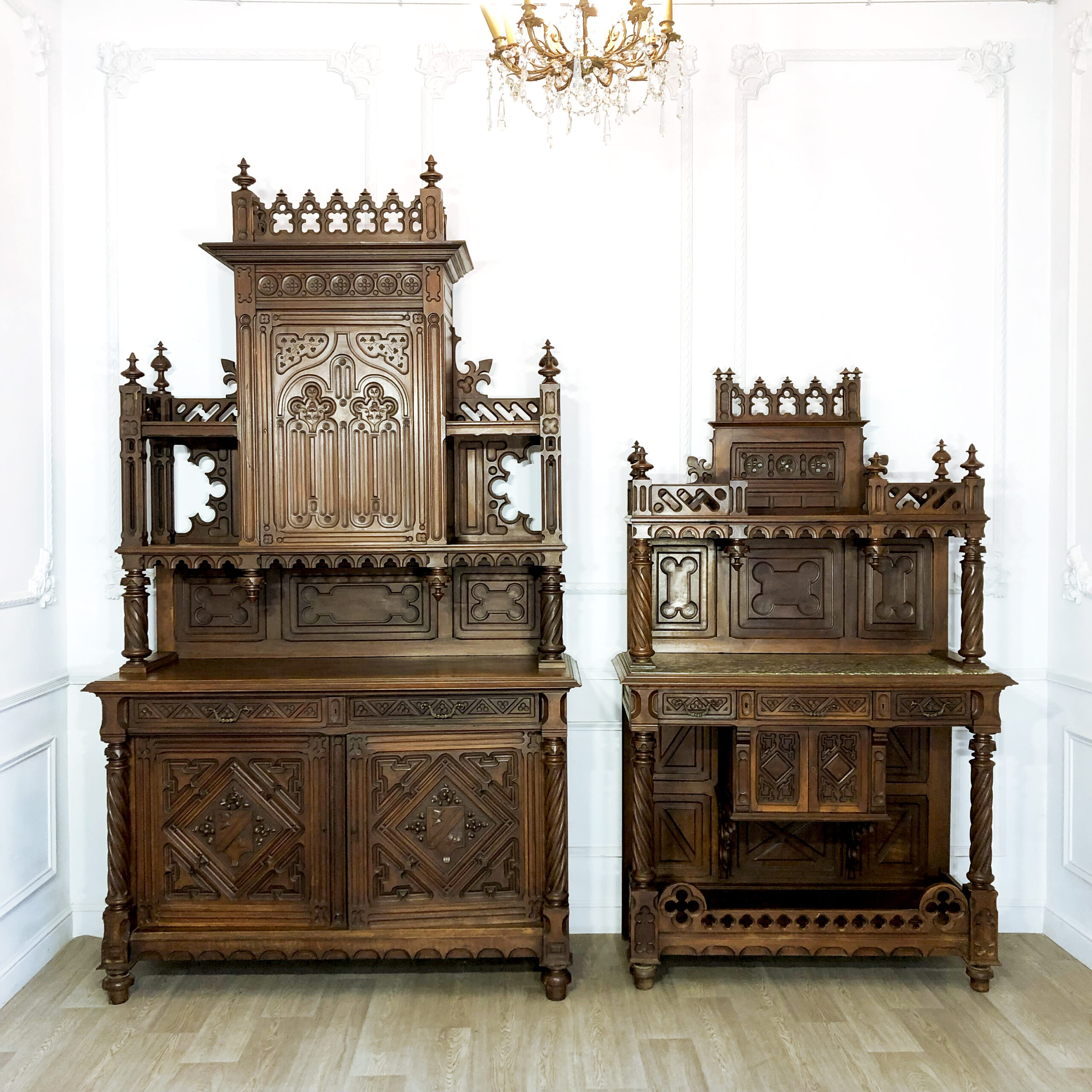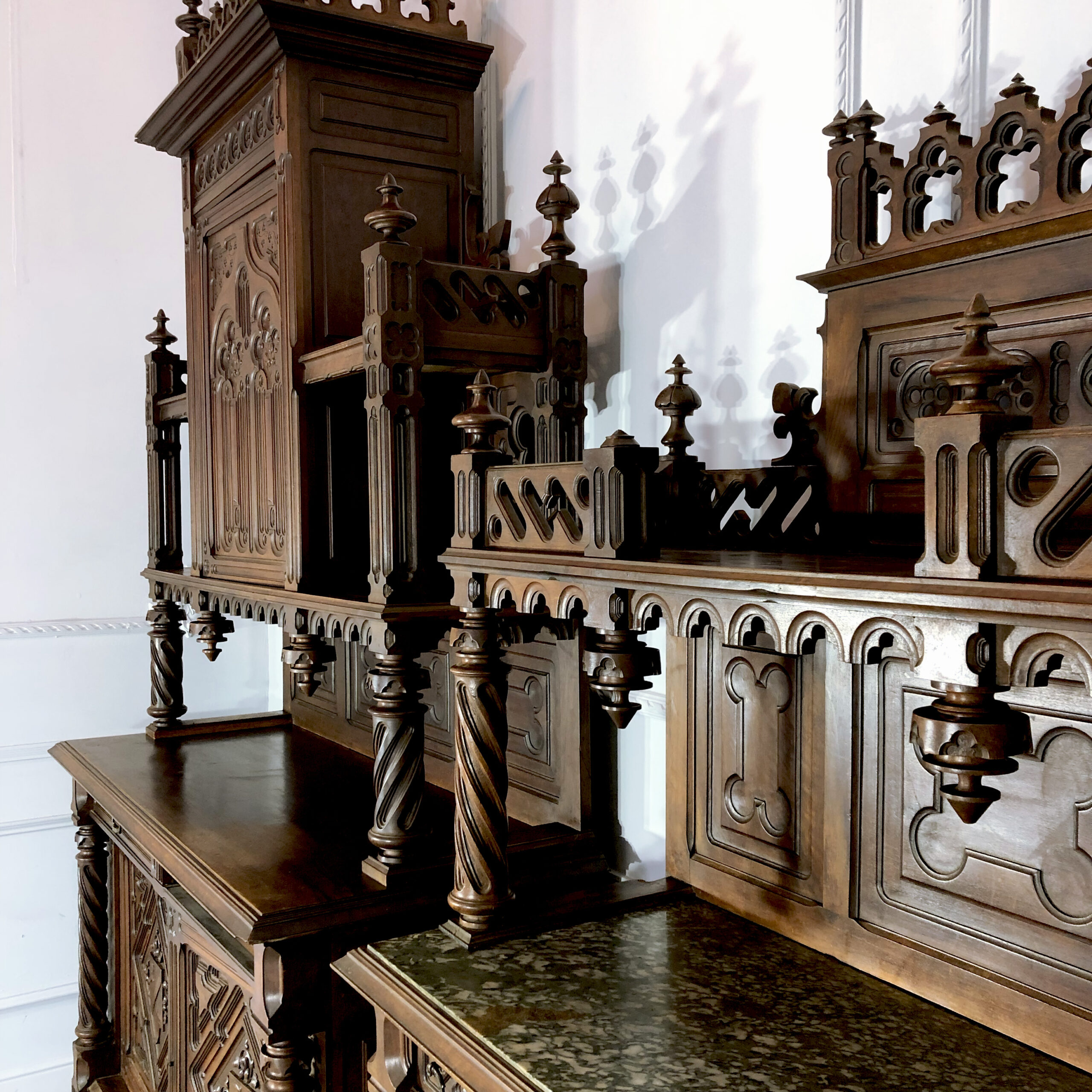 Антикварный буфет и поставец «Готика». Вторая половина XIX века, Франция. Выполнены из массива ореха. Великолепная резьба ручной работы с орнаментами, характерными для готического стиля. Поставец оснащен столешницей натурального зеленого мрамора. Экспертное заключение Министерства Культуры РФ. Размер буфета: 160х60х272h см. Размер поставца: 128х55х210 см. Цена за пару.