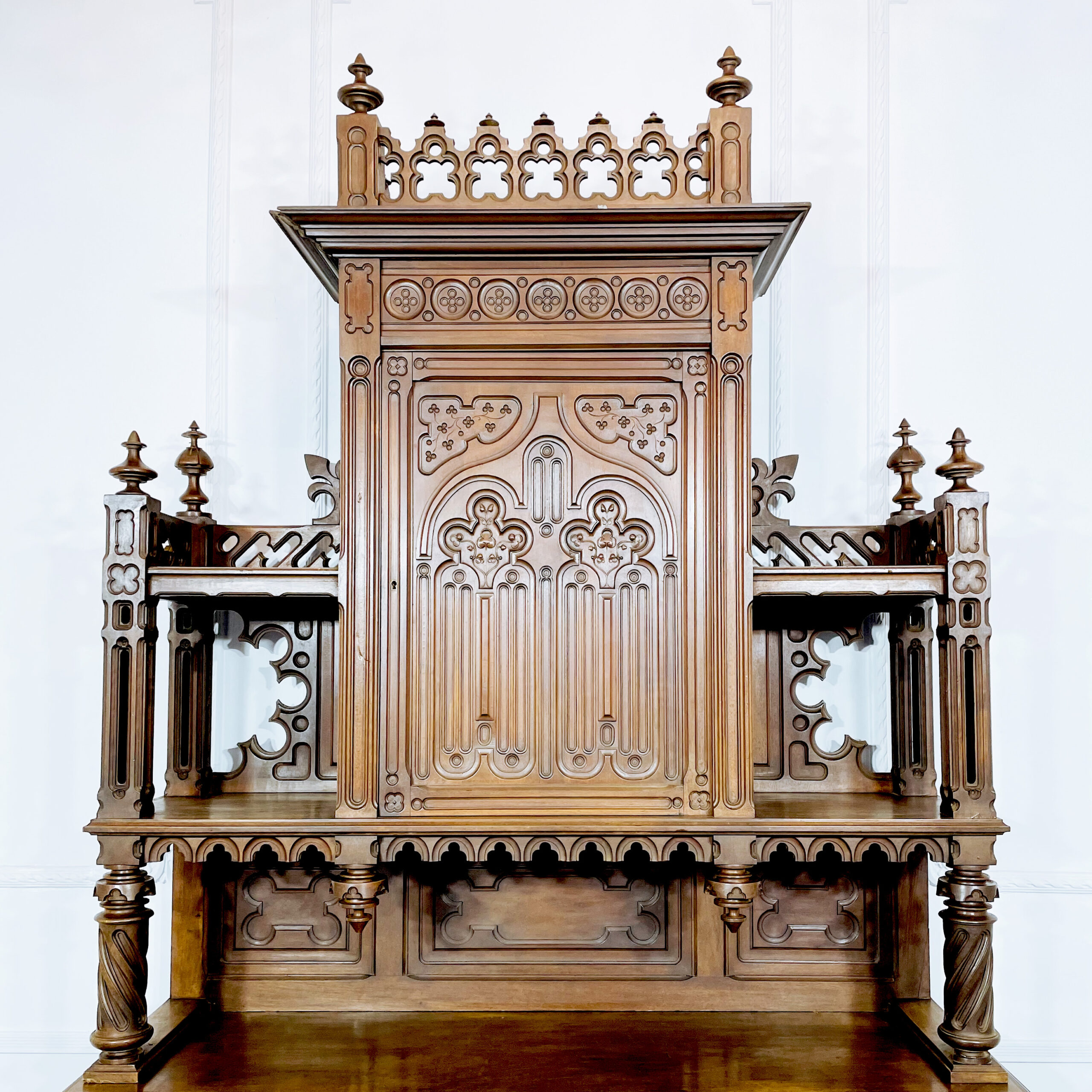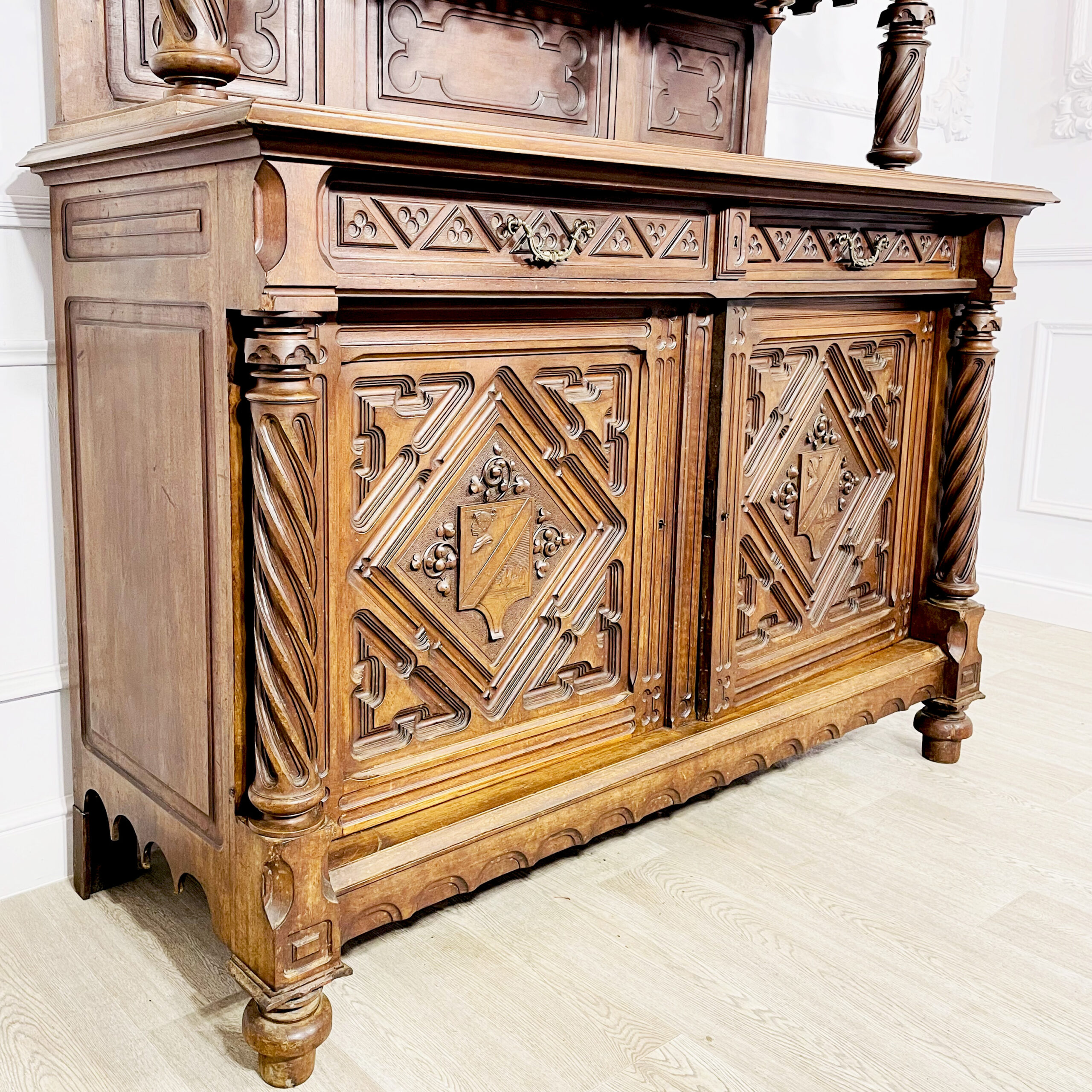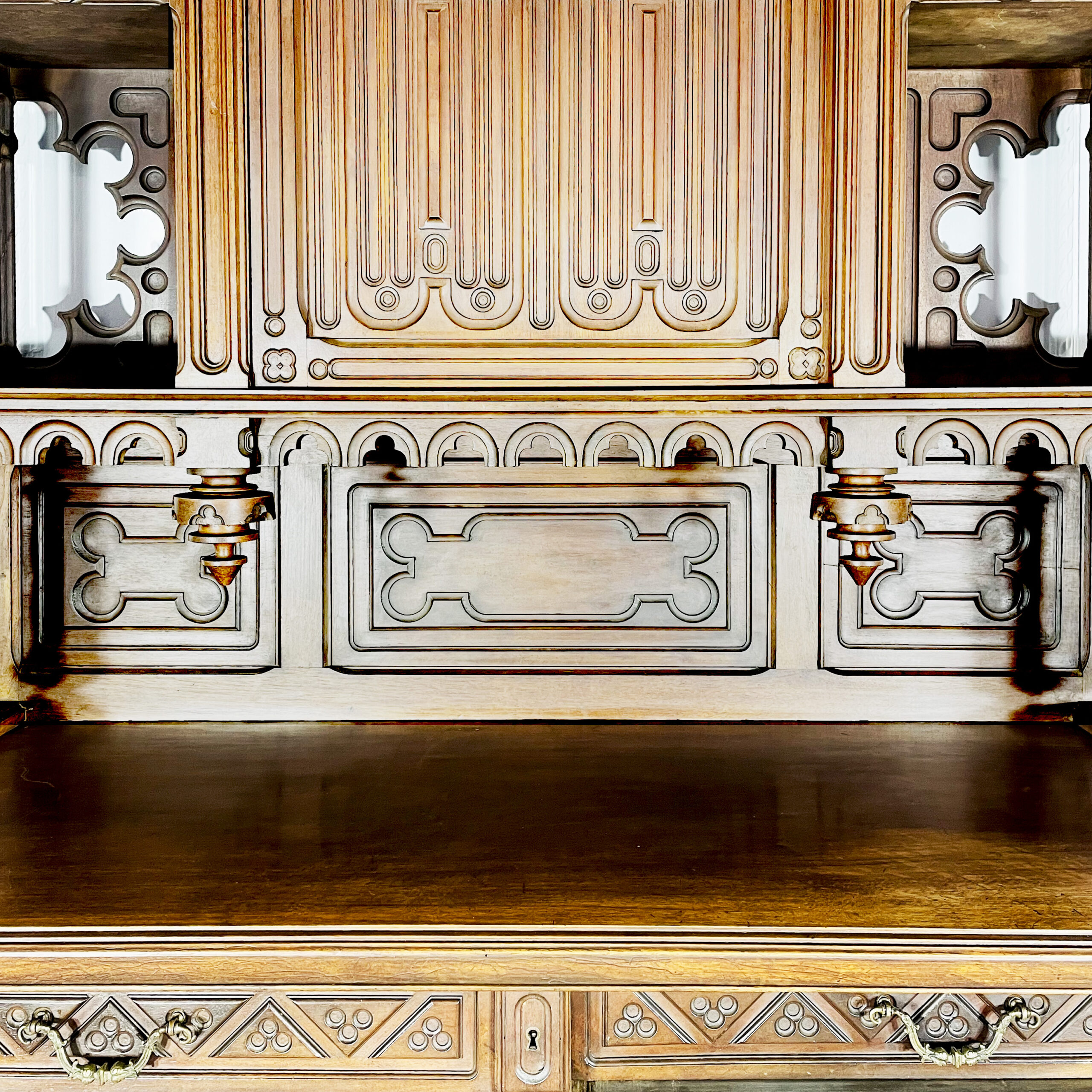 Антикварный буфет и поставец «Готика». Вторая половина XIX века, Франция. Выполнены из массива ореха. Великолепная резьба ручной работы с орнаментами, характерными для готического стиля. Поставец оснащен столешницей натурального зеленого мрамора. Экспертное заключение Министерства Культуры РФ. Размер буфета: 160х60х272h см. Размер поставца: 128х55х210 см. Цена за пару.