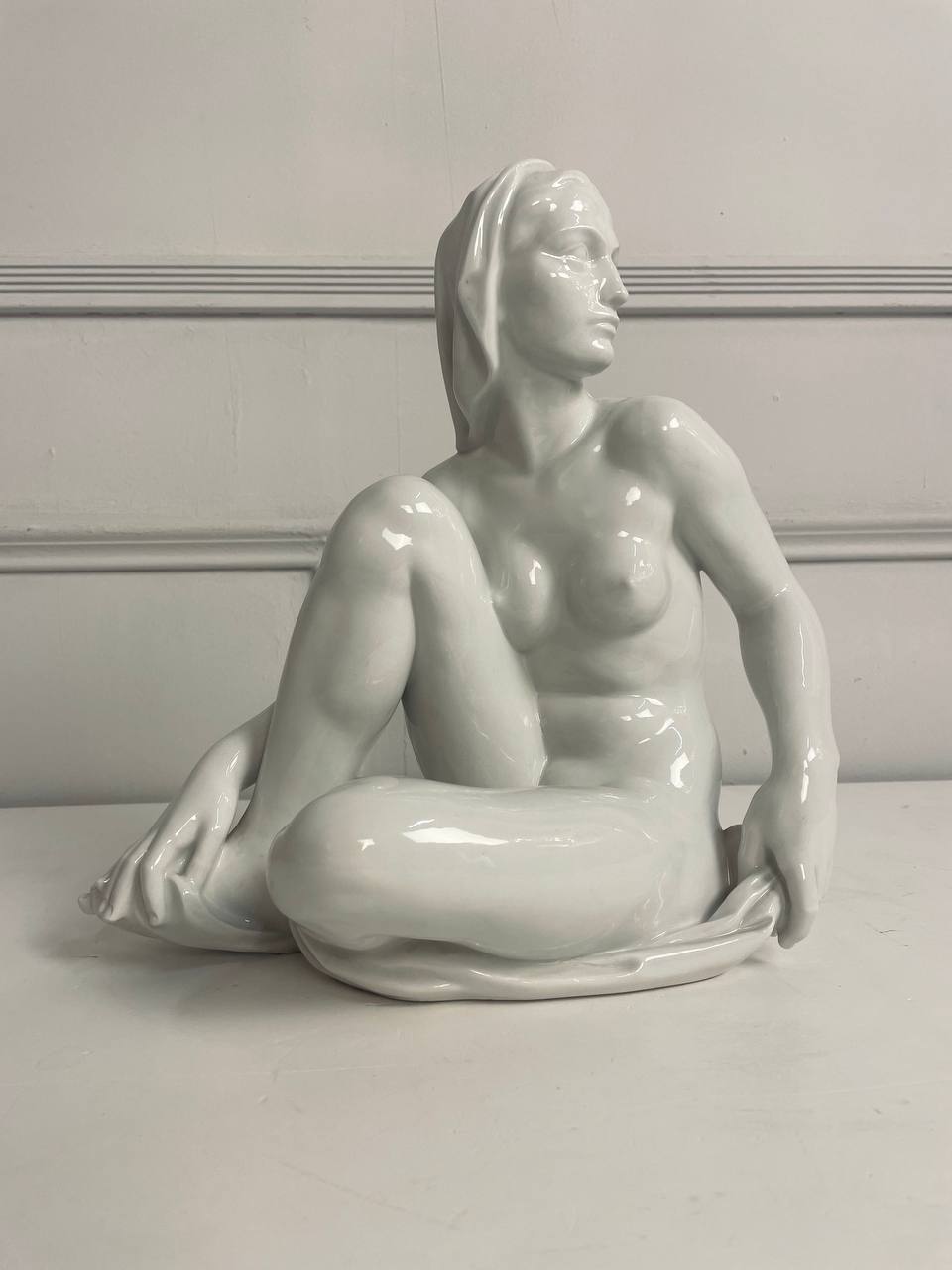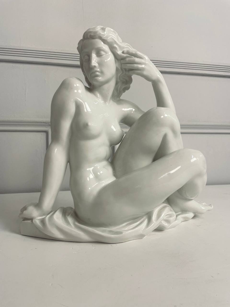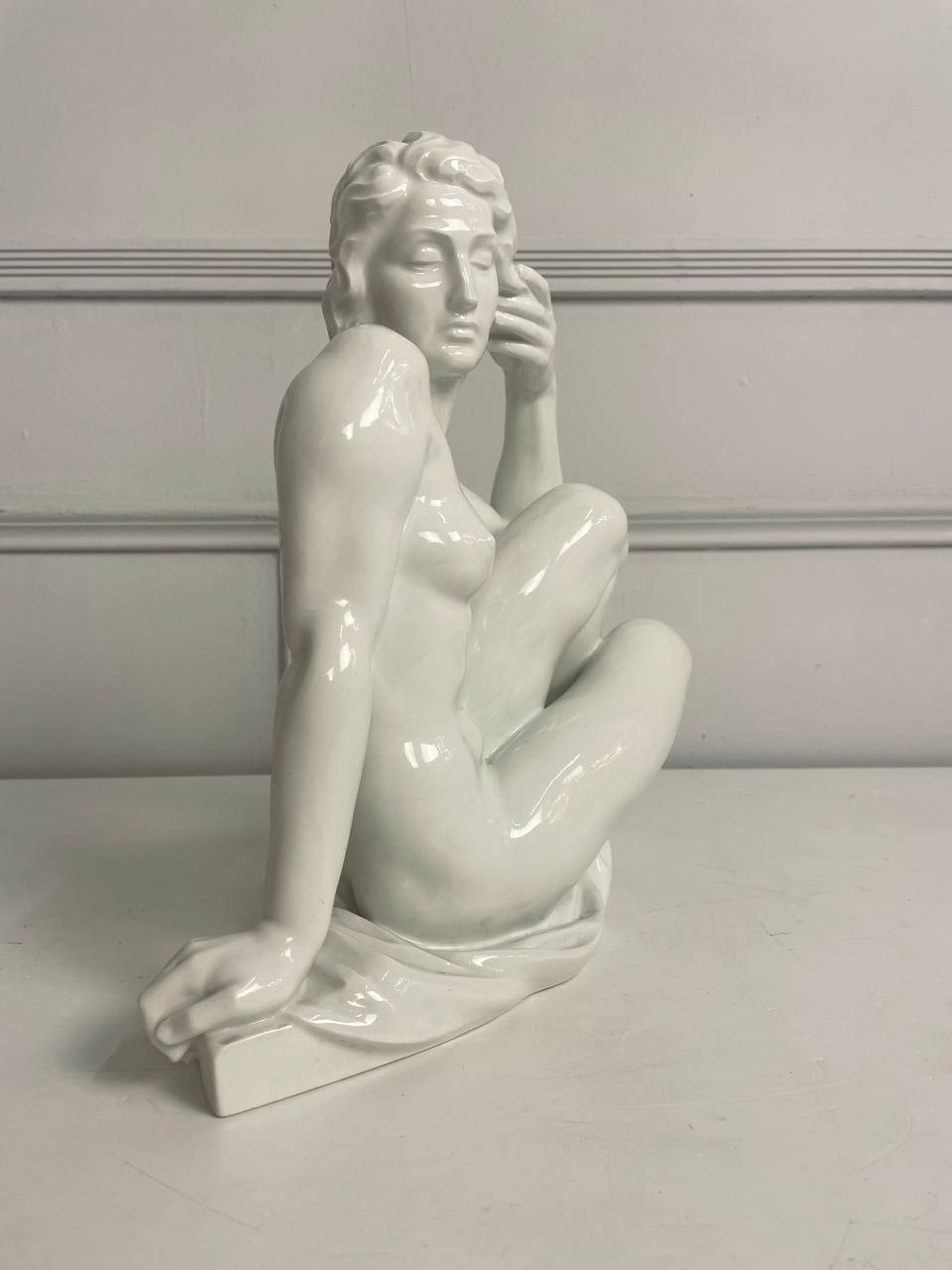 Парные фарфоровые скульптуры девушек «Смотрящая» и «Мечтающая» скульптора Robert Ullmann (1903-1966), легендарной мануфактуры Meissen, Германия. Работы 1939-1940 года. В тесте скрещенные мечи, Weiss, номер мод. Q 238-239. Robert Ullmann Размер 37х24х32h см. Цена за пару.