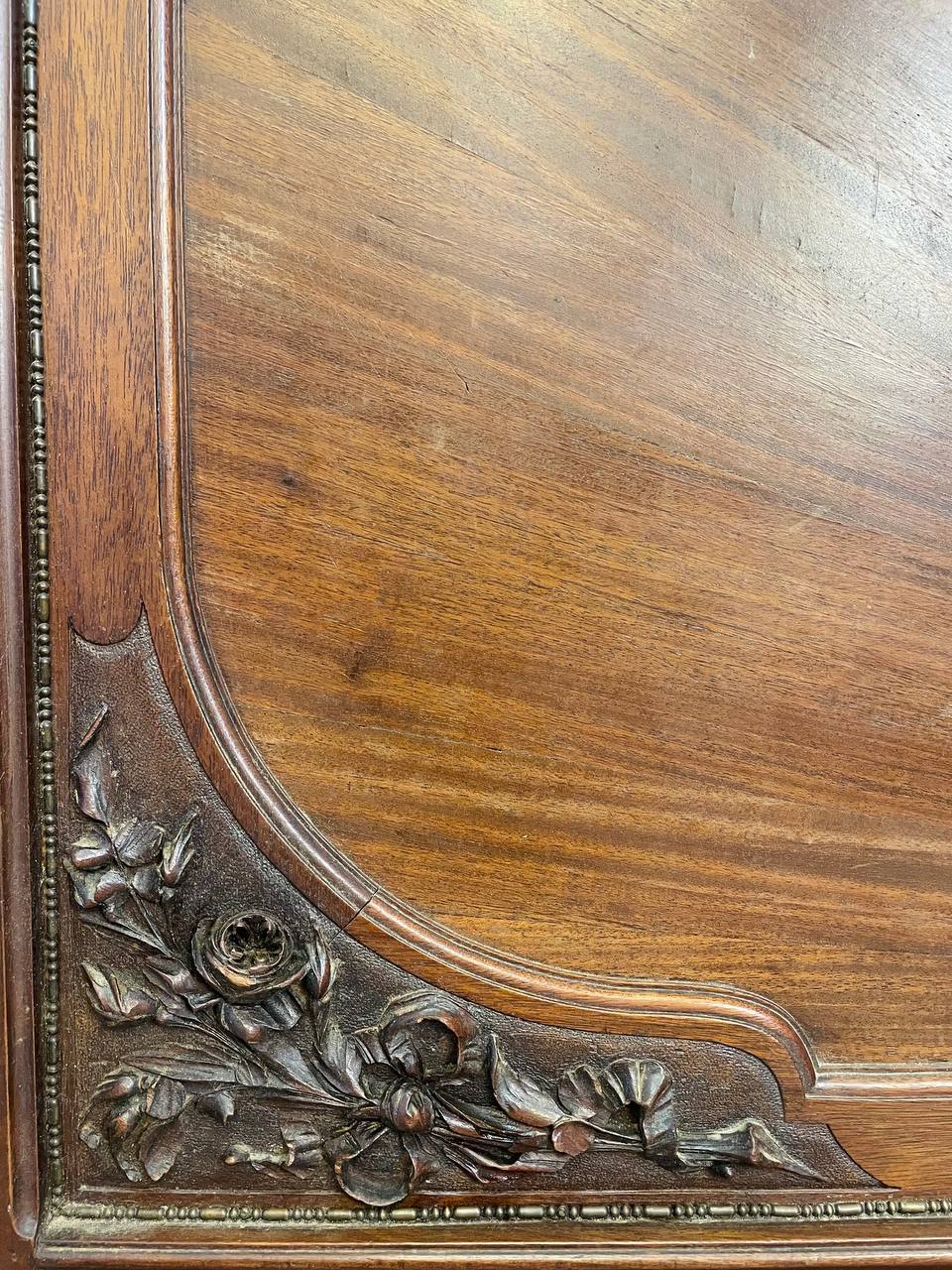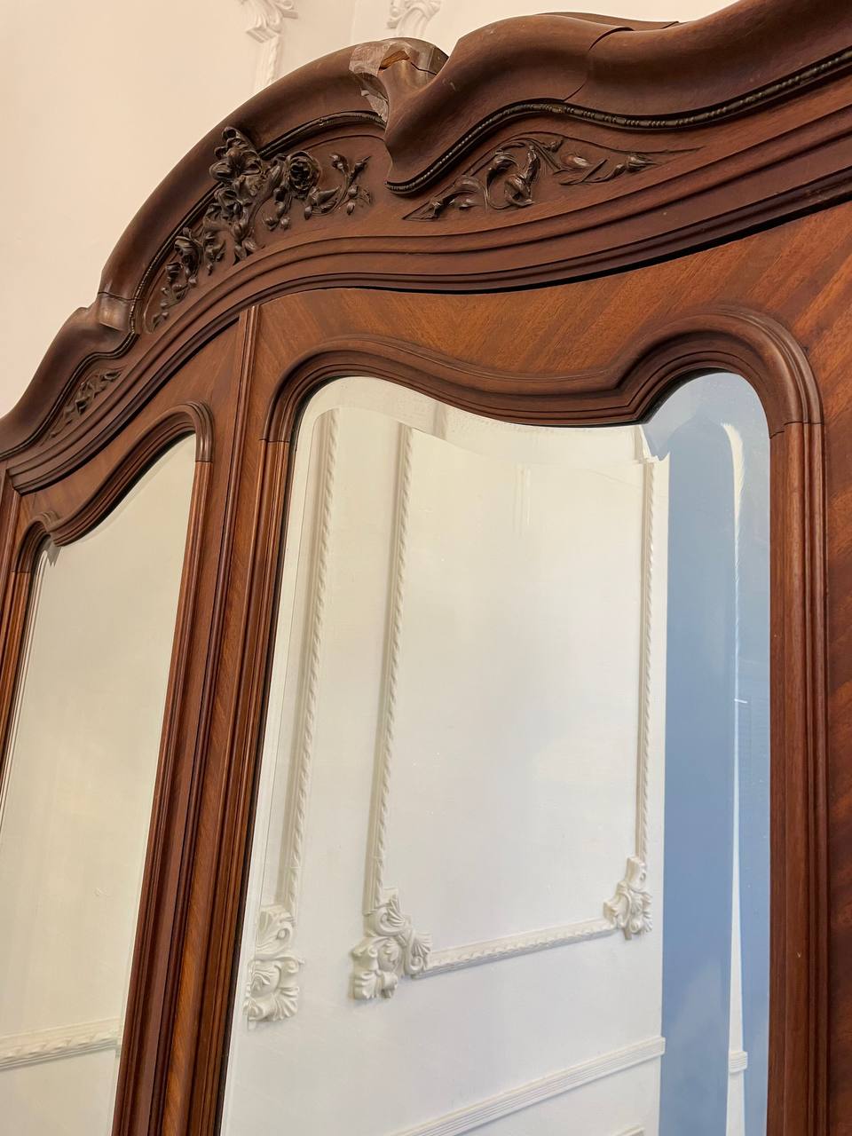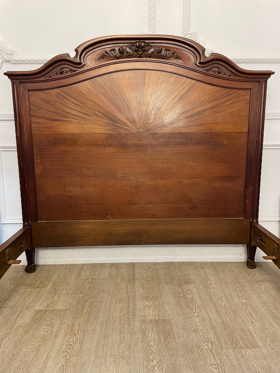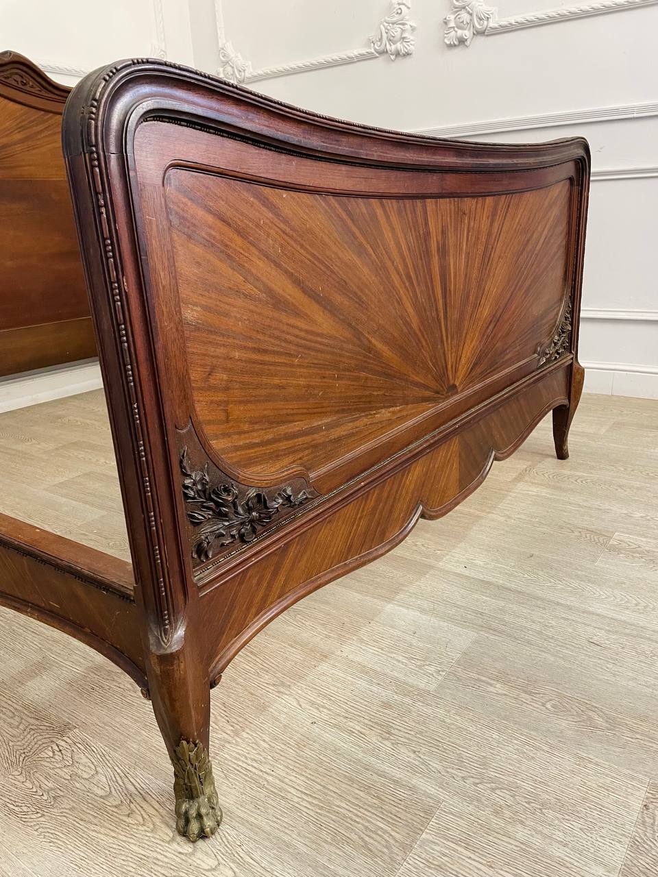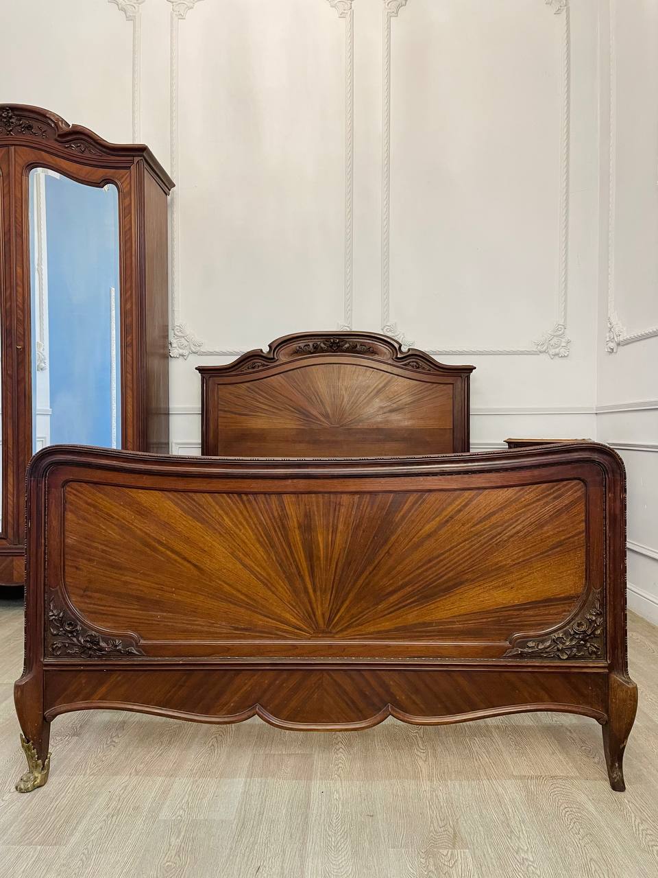 Спальный ПОДПИСНОЙ гарнитур 19 века, Франция. Выполнен из красного дерева. Оригинальные зеркала с фацетом. Бронзовая фурнитура. Шкаф 132х51х238h. Внутри выдвижные ящички и три полки. Кровать (внутренний размер) 135х190 см. Внешний размер кровати 150х201х139/83h см. Тумбочка 39х39х82h см.