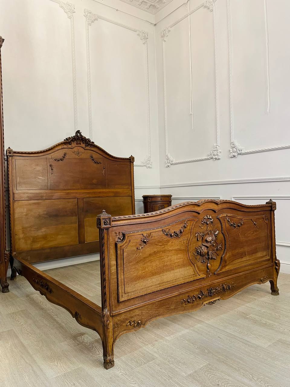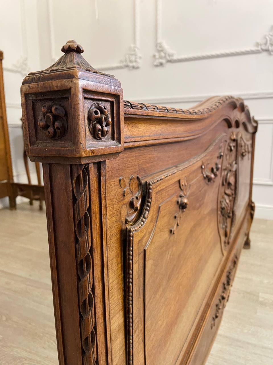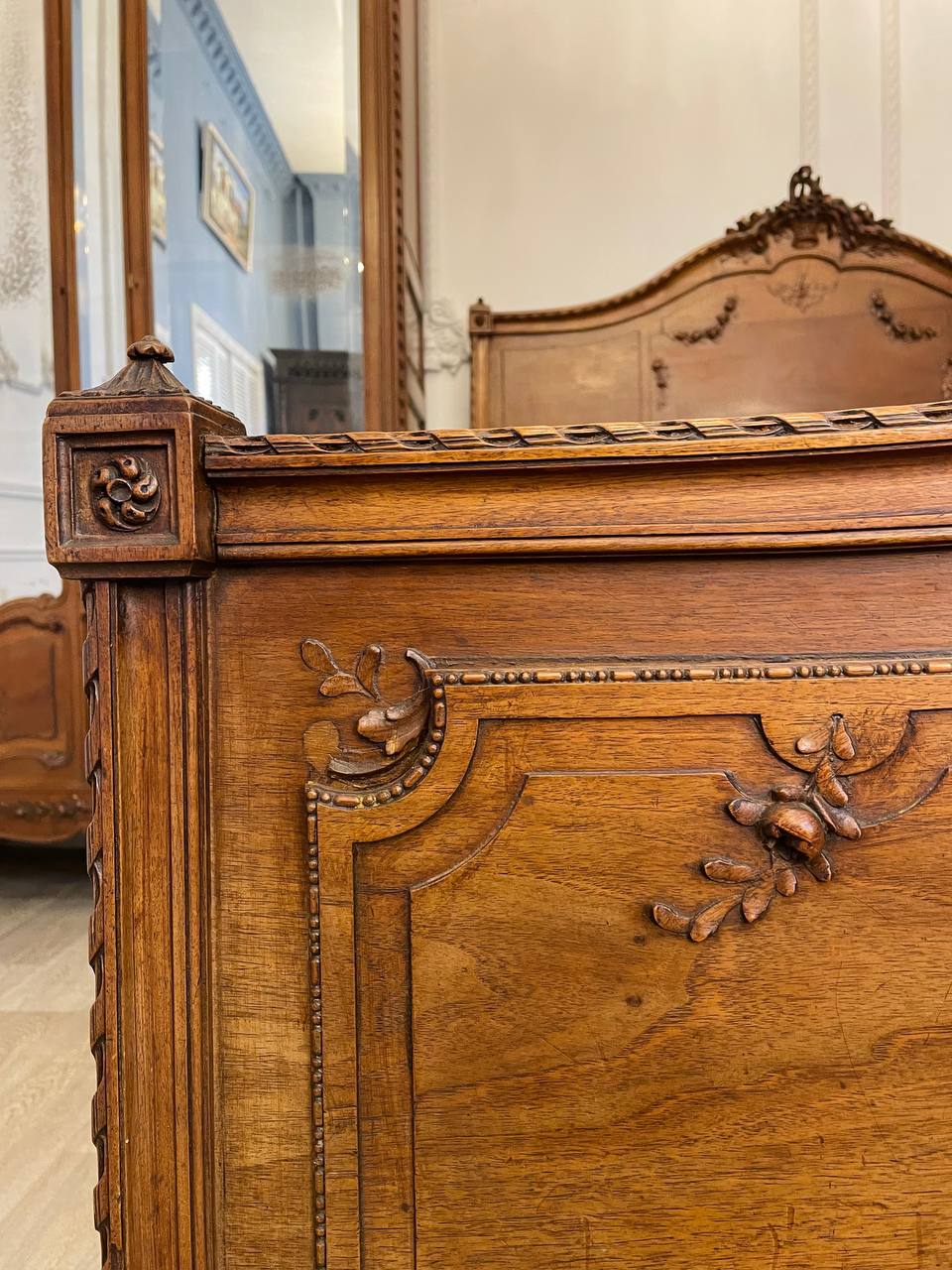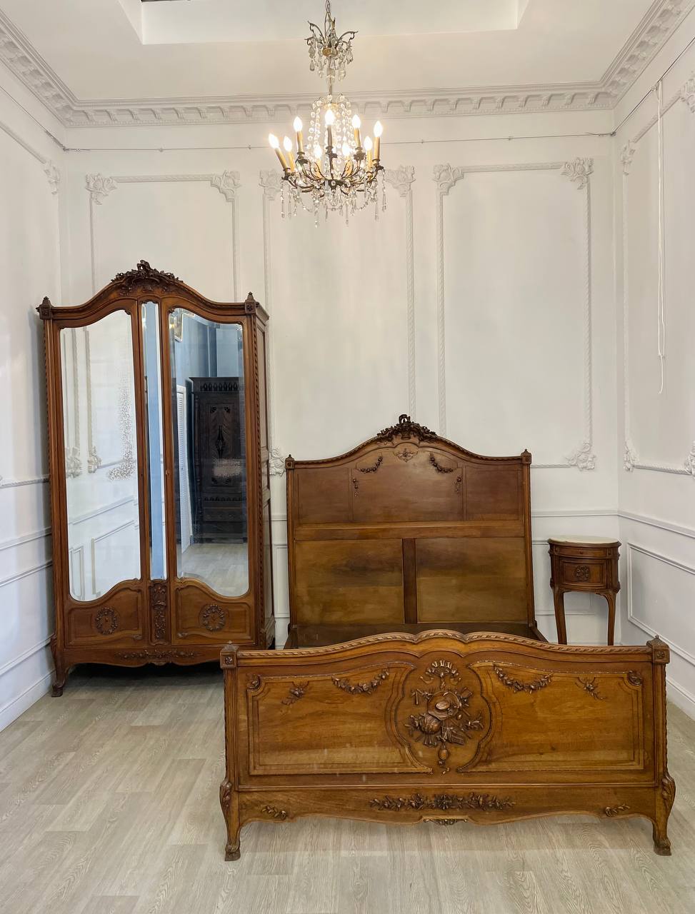 Спальный гарнитур 19 века, Франция. Выполнен из массива ореха. Изысканная резьба ручной работы. Оригинальные зеркала с фацетом. Платяной шкаф внутри имеет две полки и два выдвижных ящичка. Тумбочка 44х37х85h см. Кровать (внутренний размер, для матраса) 150х198 см. Внешний размер 163х209х165/81h см. Шкаф 132х55х258h см.