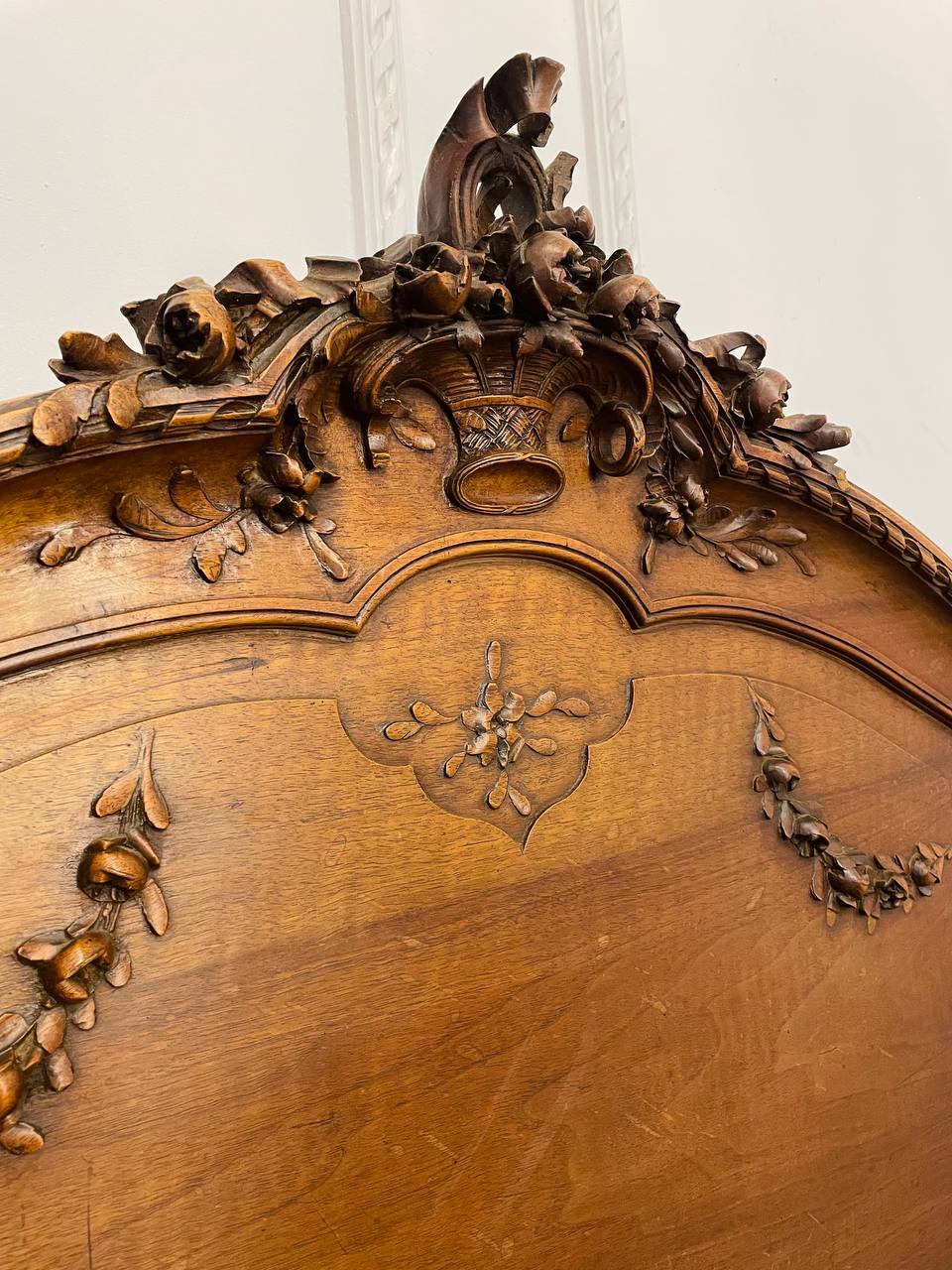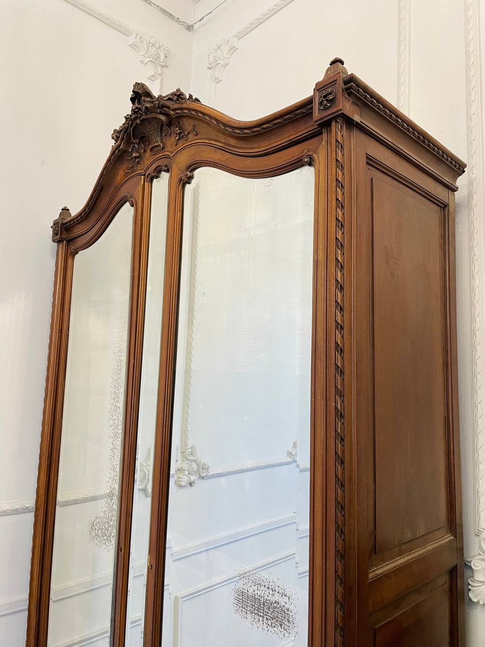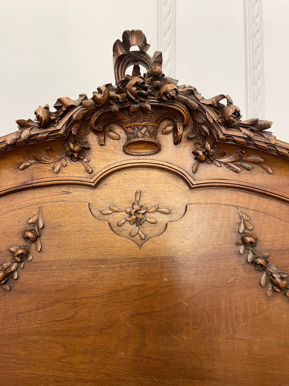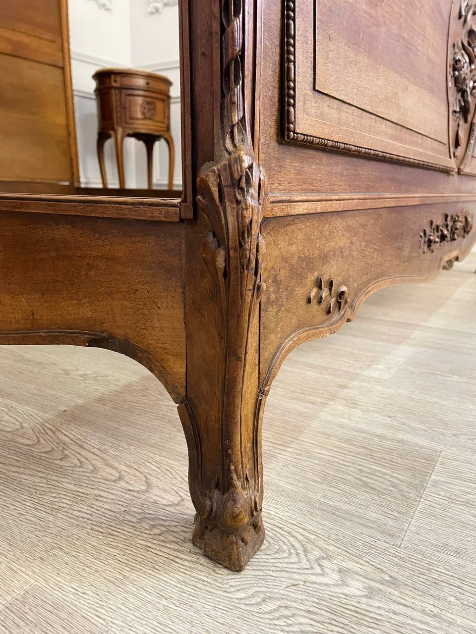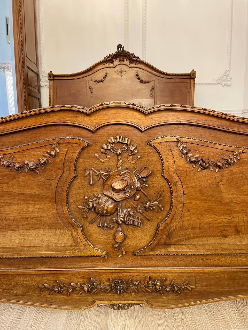 Спальный гарнитур 19 века, Франция. Выполнен из массива ореха. Изысканная резьба ручной работы. Оригинальные зеркала с фацетом. Платяной шкаф внутри имеет две полки и два выдвижных ящичка. Тумбочка 44х37х85h см. Кровать (внутренний размер, для матраса) 150х198 см. Внешний размер 163х209х165/81h см. Шкаф 132х55х258h см.