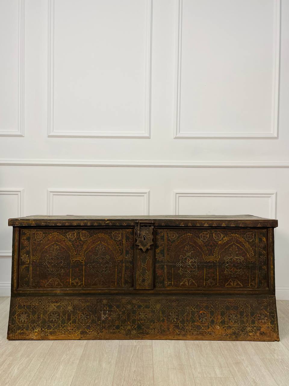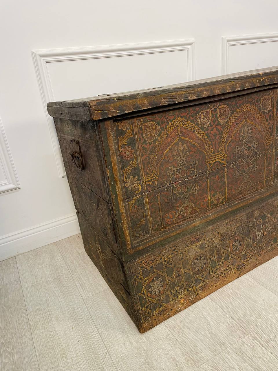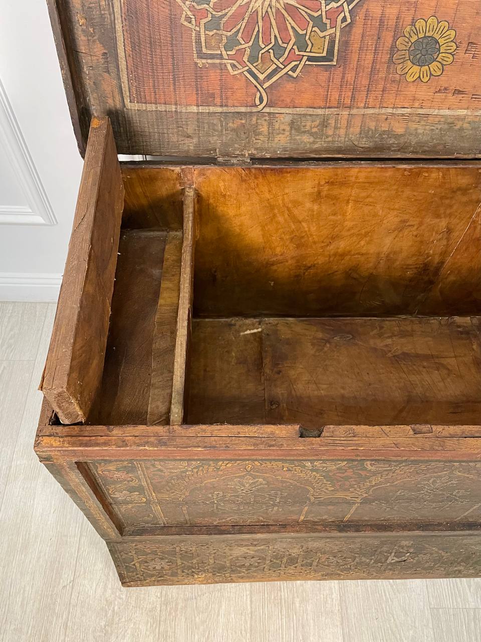 Старинный расписной сундук. Берберский сундук XVIII-XIX вв (?), Марокко. Массив сосны, орнаментальная роспись с трех сторон. Крышка сундука внутри также украшена ручной росписью. Внутри кожа. Имеется небольшой отсек для хранения мелких предметов. Оригинальная металлическая фурнитура. Ширина 143 см. Глубина 48 см. Высота 61 см.