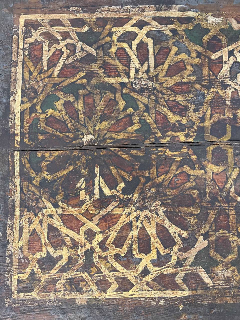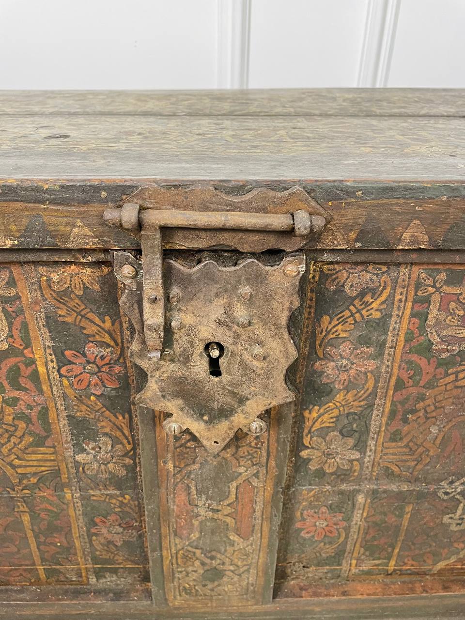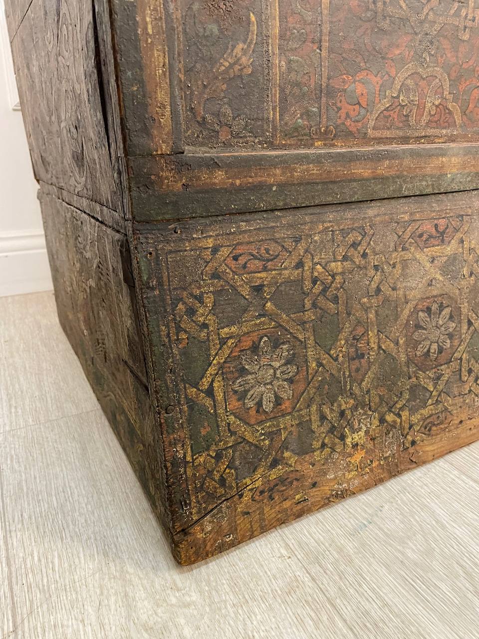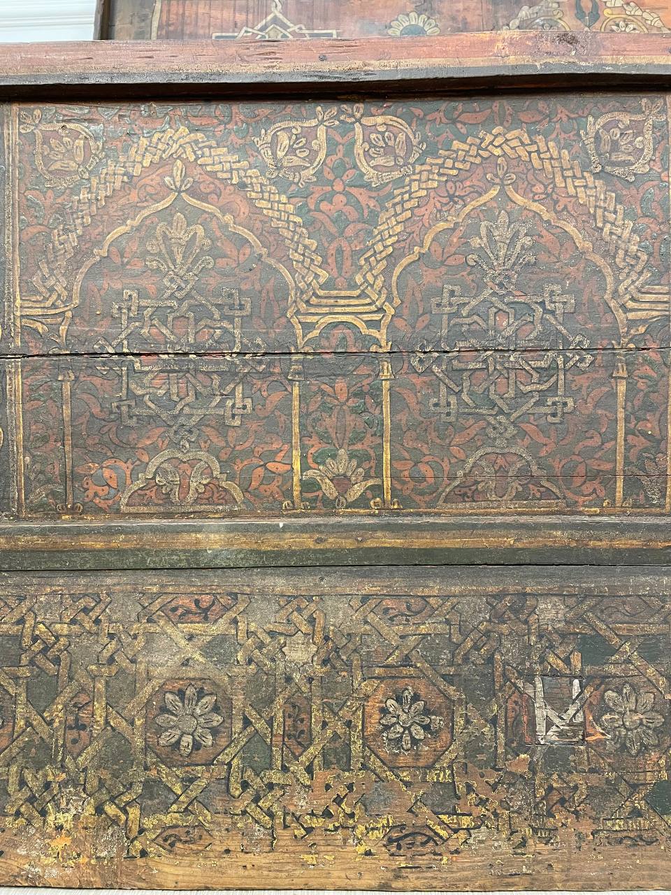 Старинный расписной сундук. Берберский сундук XVIII-XIX вв (?), Марокко. Массив сосны, орнаментальная роспись с трех сторон. Крышка сундука внутри также украшена ручной росписью. Внутри кожа. Имеется небольшой отсек для хранения мелких предметов. Оригинальная металлическая фурнитура. Ширина 143 см. Глубина 48 см. Высота 61 см.