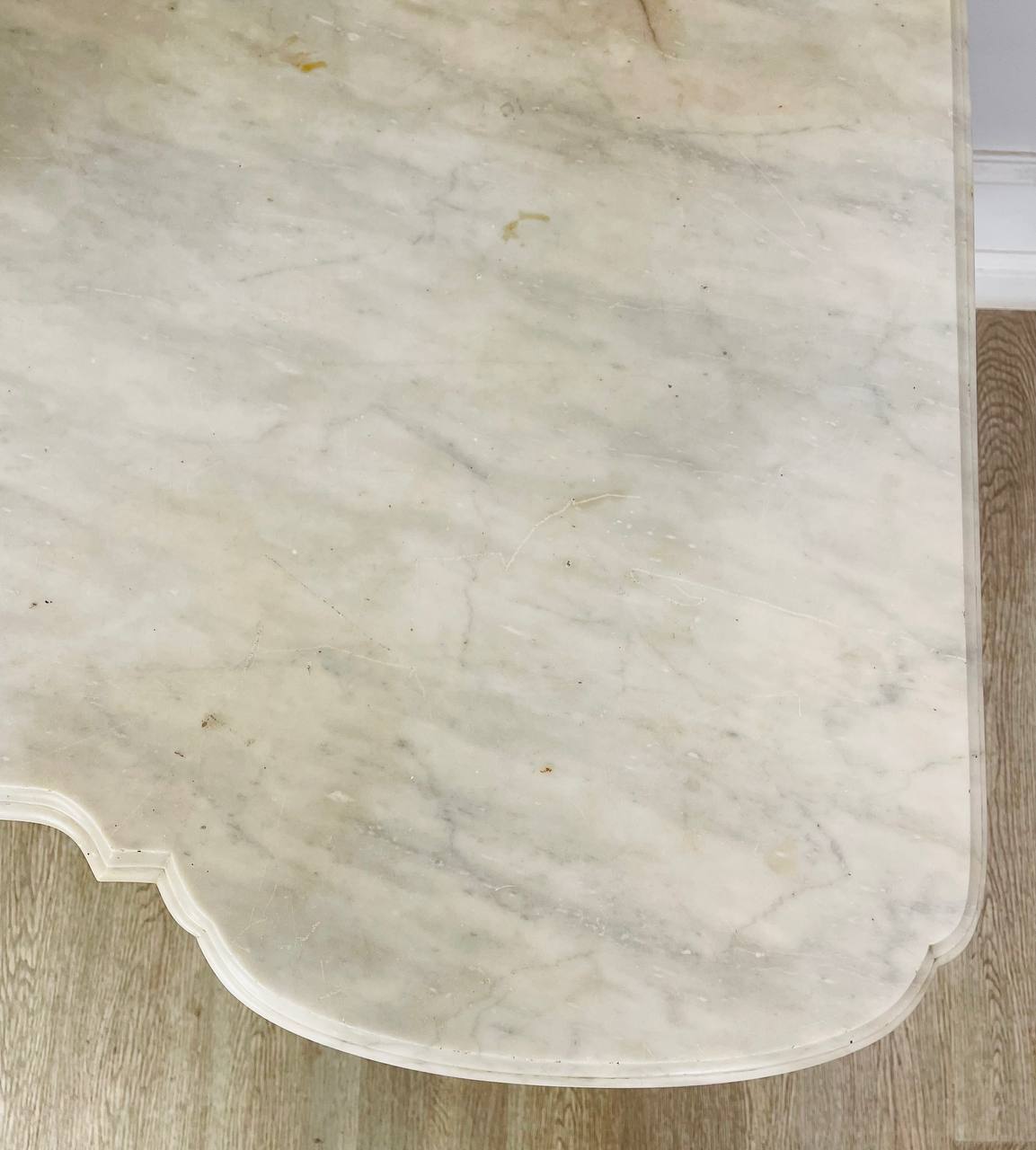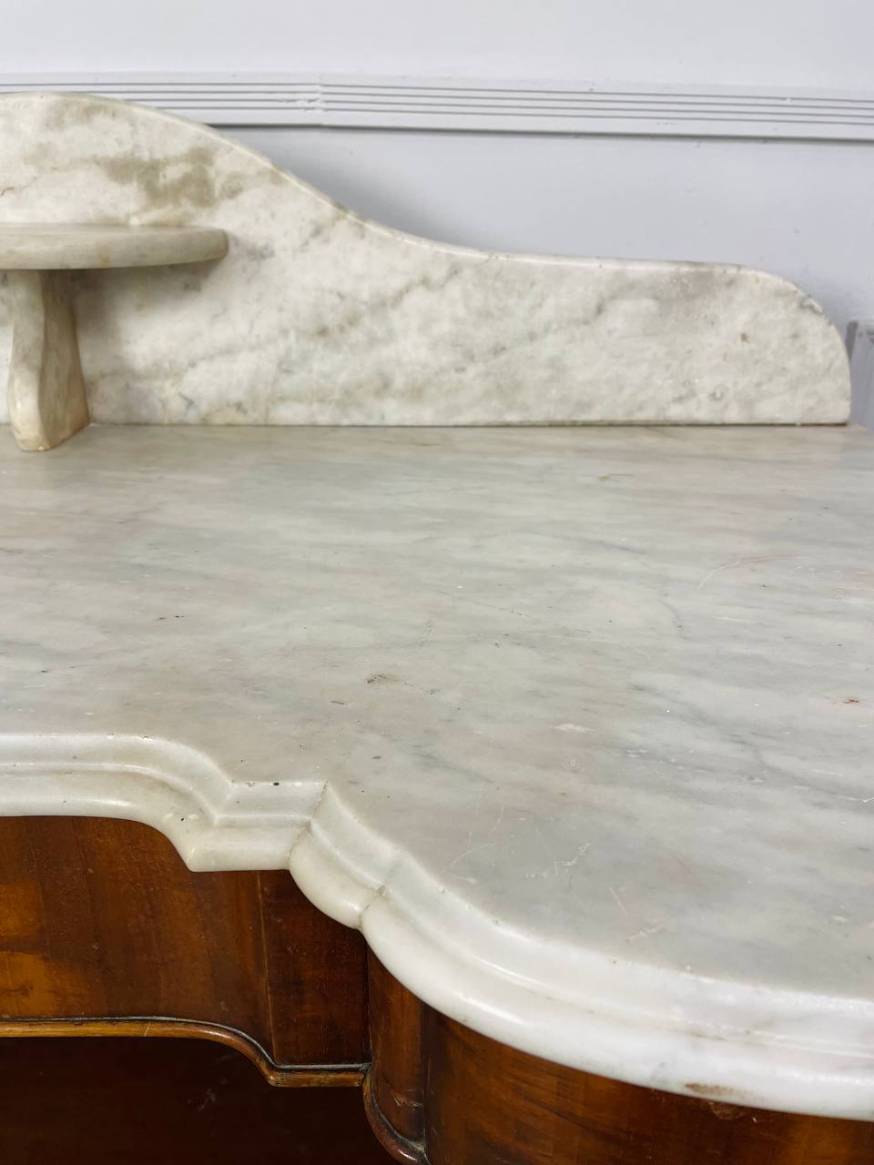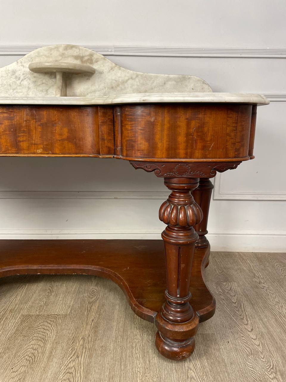 Столик для умывания конца XIX века, Россия. Выполнен из красного дерева и фигурного белого мрамора. Выдвижной ящик по центру. Размер 131х62х97h см Высота до столешницы 74 см.
