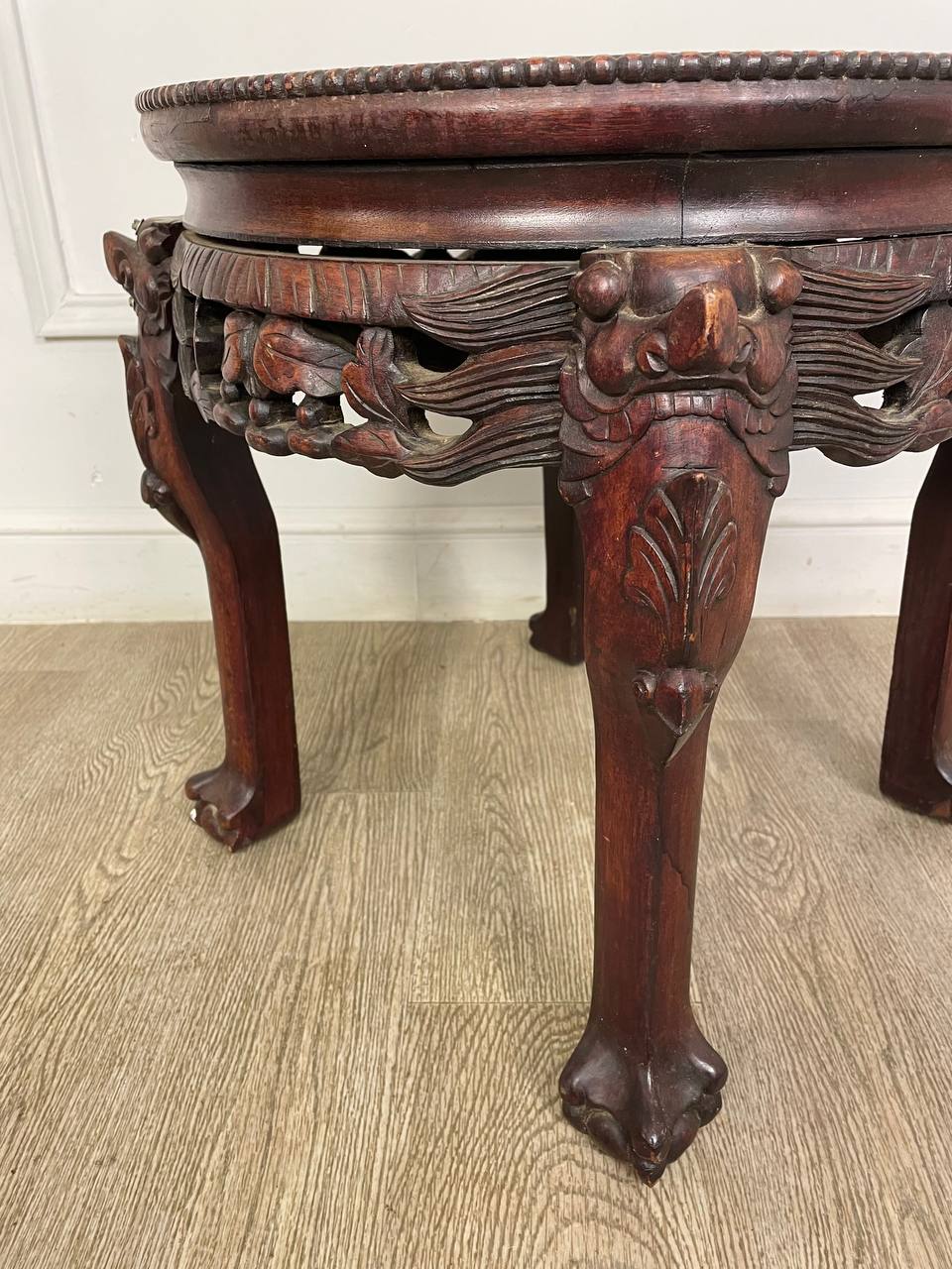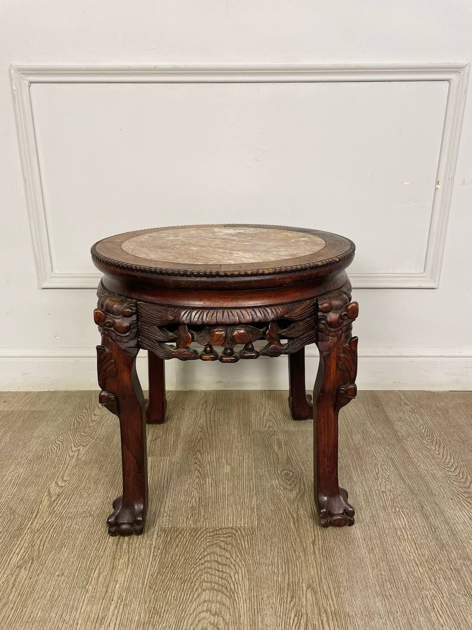 Столик в стиле Шинуазри. Антикварный китайский столик с оригинальной мраморной столешницей. Выполнен из красного дерева. Д 46 см. В 46 см.