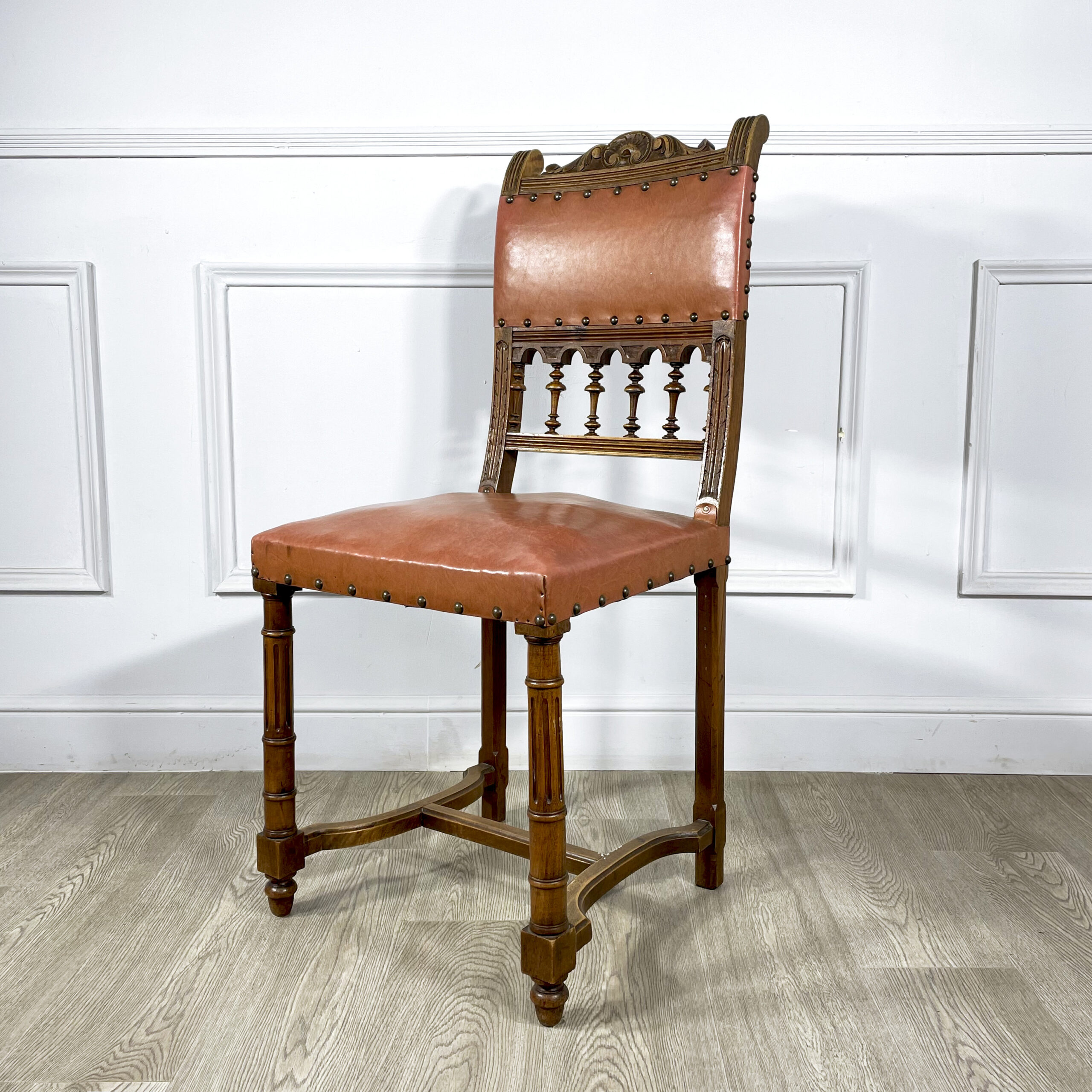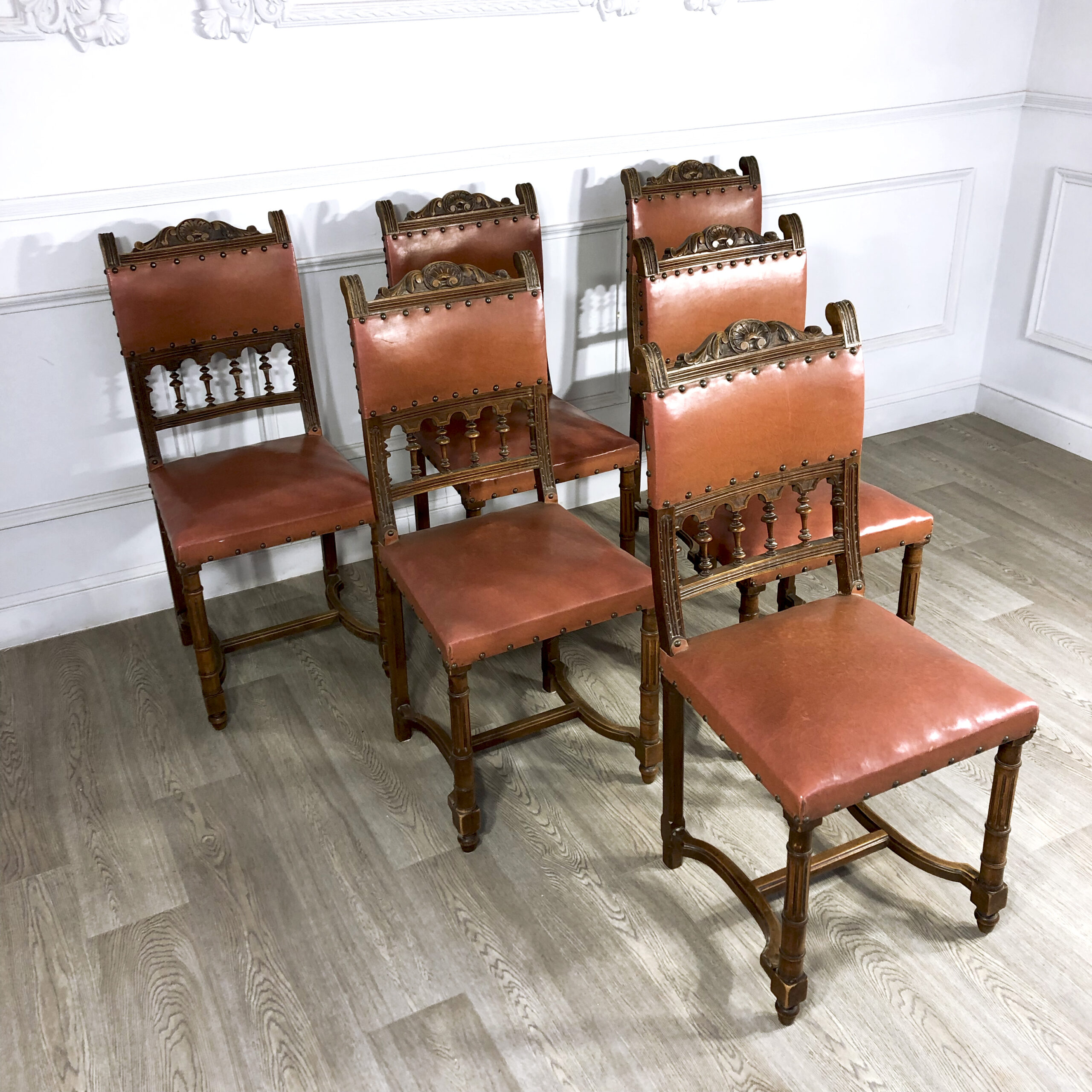 Гарнитур антикварных стульев 6 шт. XIX-XX века Франция. Выполнены из массива ореха, натуральная кожа. Размер 43х41х93h см.