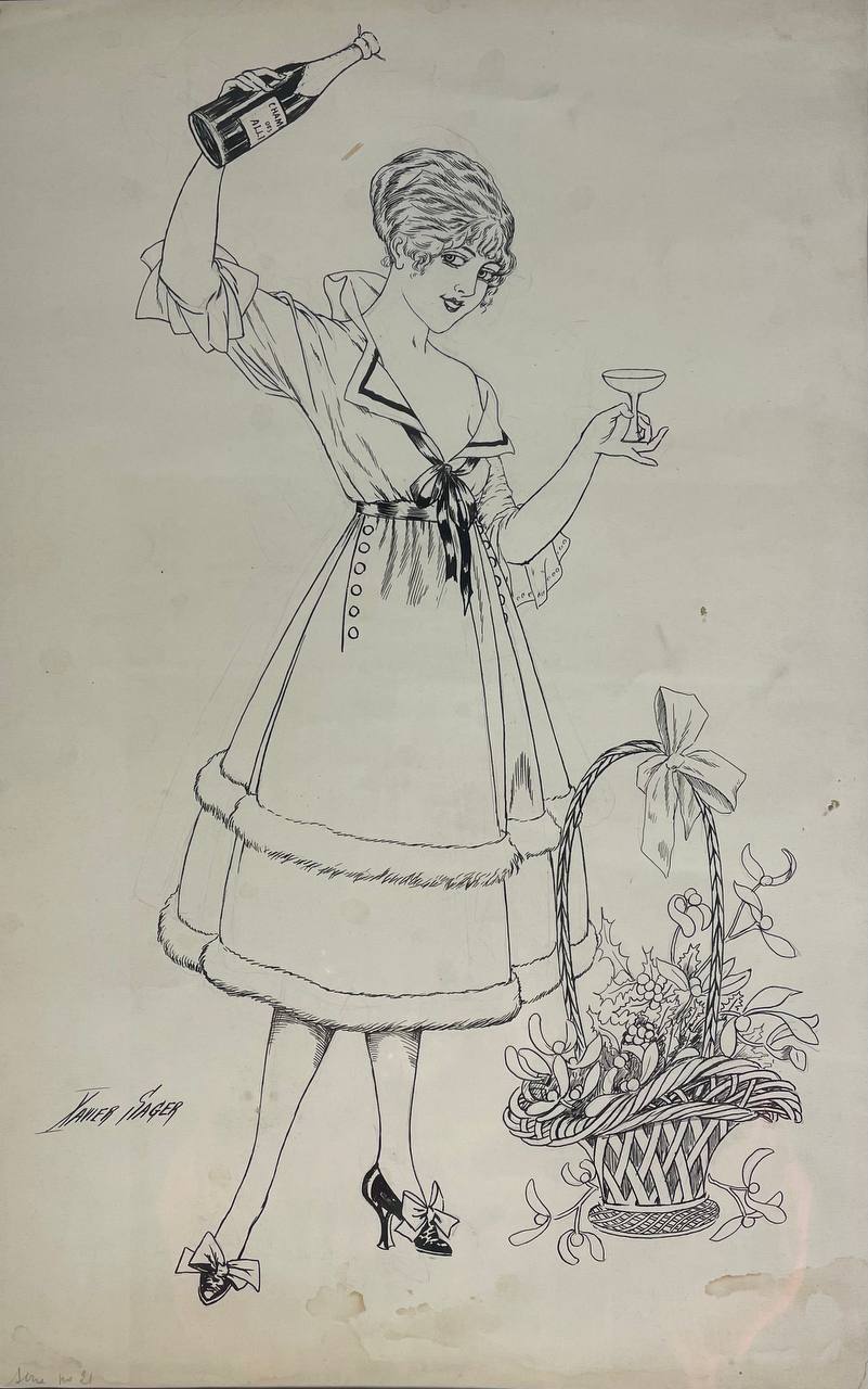 Тушь на бумаге «Девушка с шампанским»