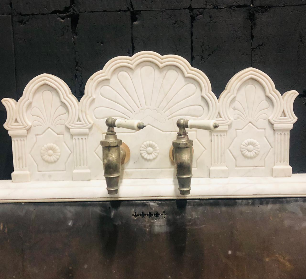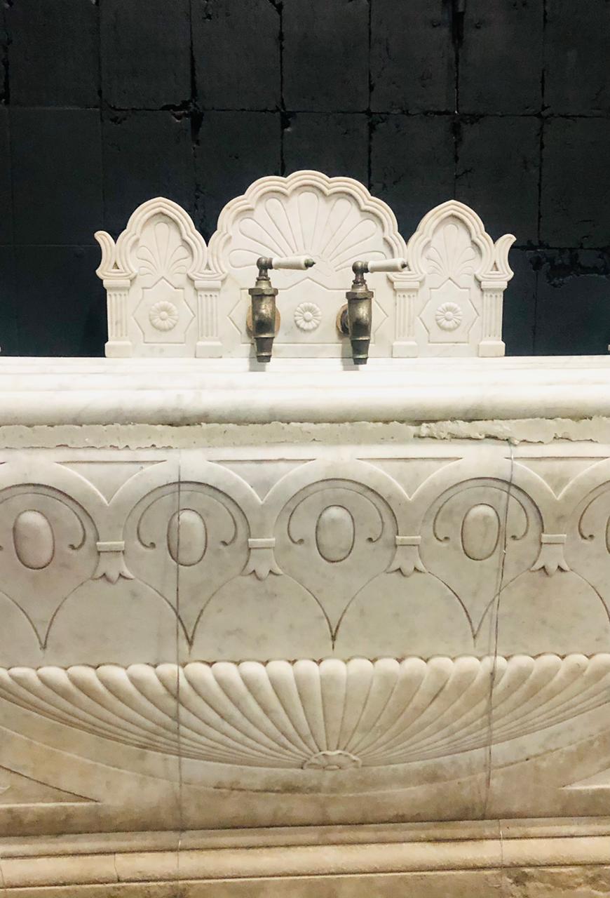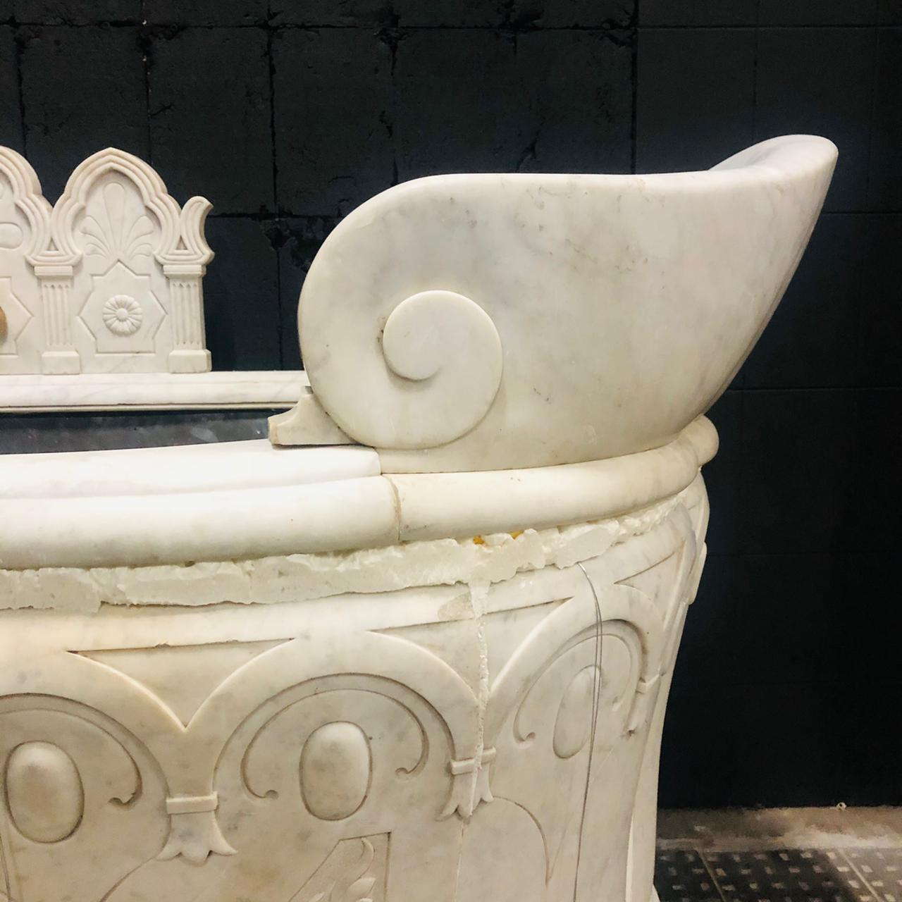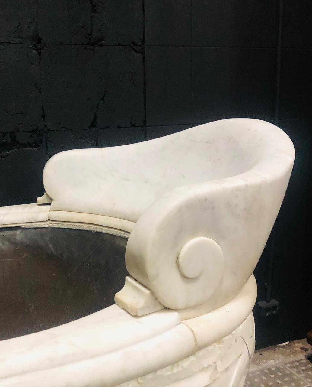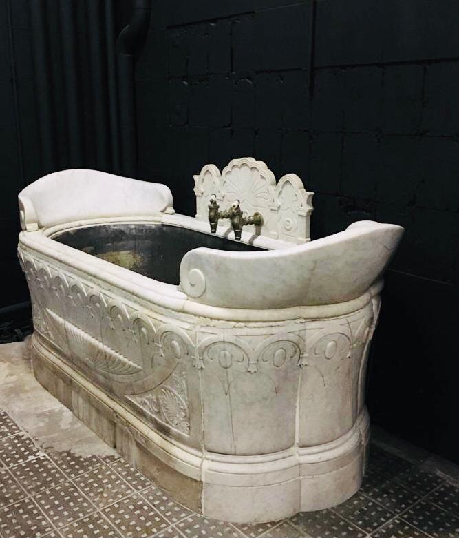 Эксклюзивный предмет в нашем собрании с выдающимся провенансом. Ванна белого мрамора создавалась для никого иного как королевы Изабеллы II (1830-1904), которая правила Испанией в неспокойные переломные для испанской монархии времена. Ванну из мрамора создавали по индивидуальному заказу для кастильского замка королевы в середине XIX века (1840 -1850 годы). История странствий предмета начинается, когда в Испании случается государственный переворот и королеву свергают. Судьба оставшейся в покинутом дворце ванны остается неизвестной с 1868 до 1937 года, когда ее инсталлируют в люксовый номер SPA-отеля Majestique в Париже. Там она и находилась до недавнего времени, пока не была продана с аукциона. Спроектированный по индивидуальным меркам внутренний резервуар имеет крупные, поистине королевские габариты. Внутреннее пространство, медное, кстати говоря, посеребрено. За полтора века серебрение частично утратилось, но первоначальный вид сегодня совсем несложно восстановить. Такие предметы - редкость масштаба лучших аукционных домов. Приходите в гости на территорию завода Кристалл в Лефортово и посмотрите на эту и множество других диковинок с душой и историей. Материалы: мрамор. Внутренний резервуар: медь, серебрение. Высота 120 см. Ширина 240 см. Глубина 110 см.