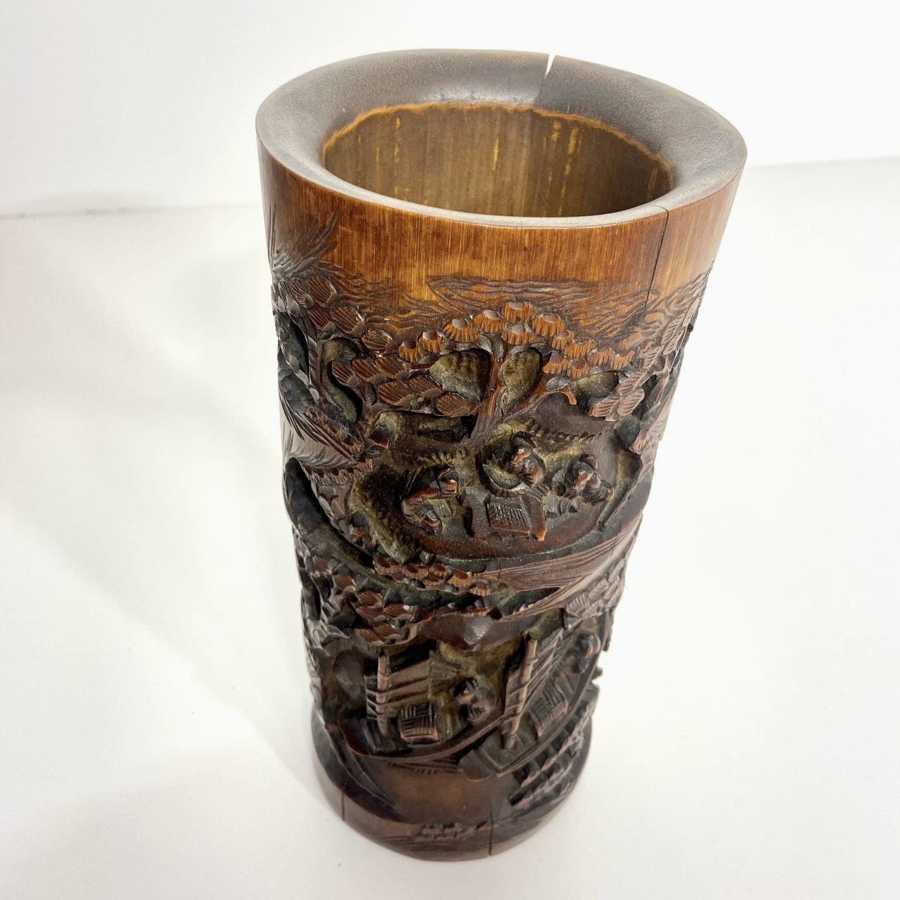Декоративная антикварная ваза, выполненная из бамбука в традиционной китайской технике резьбы, 1910-1930 гг., Китай. Ручная работа. Размер 12 х 27h см.