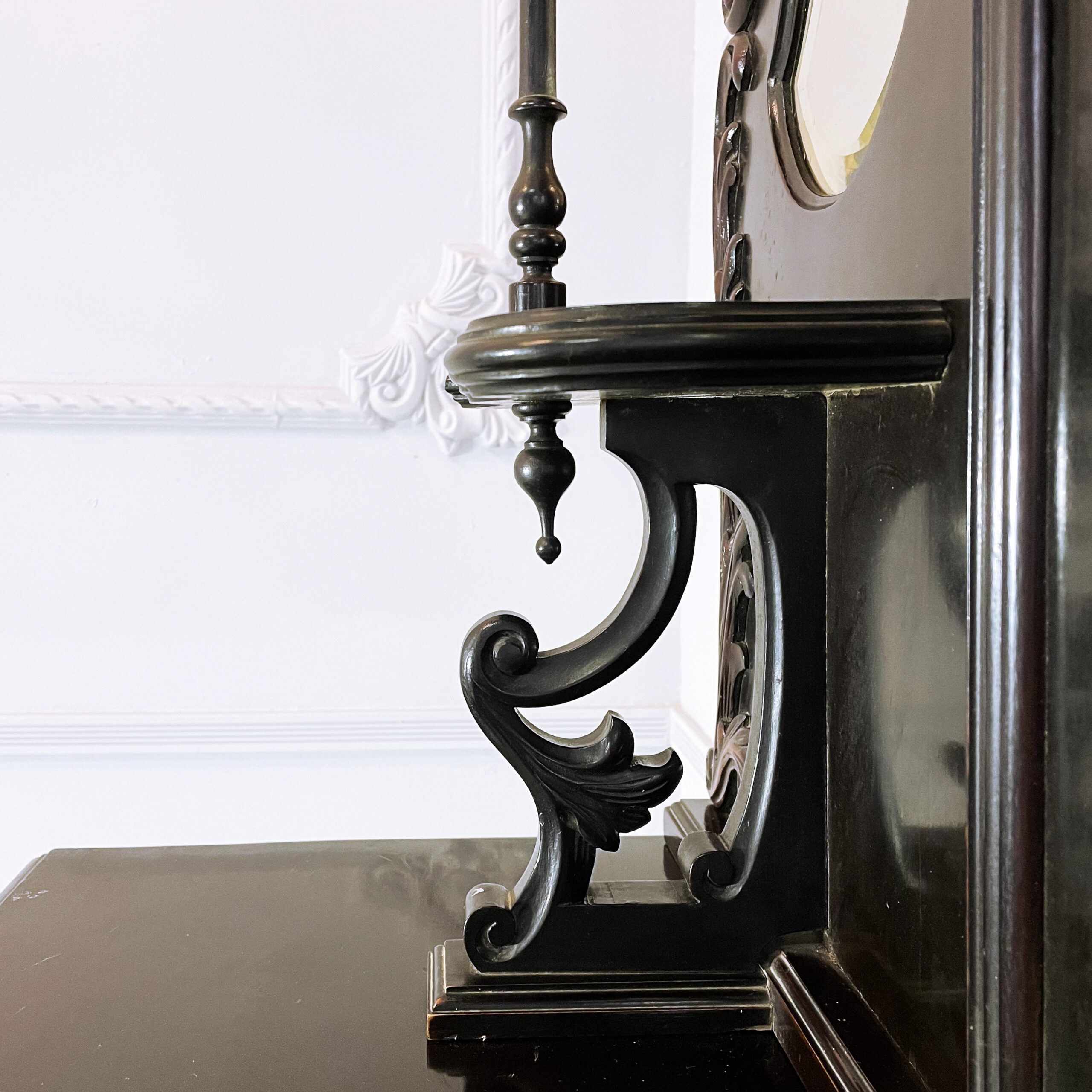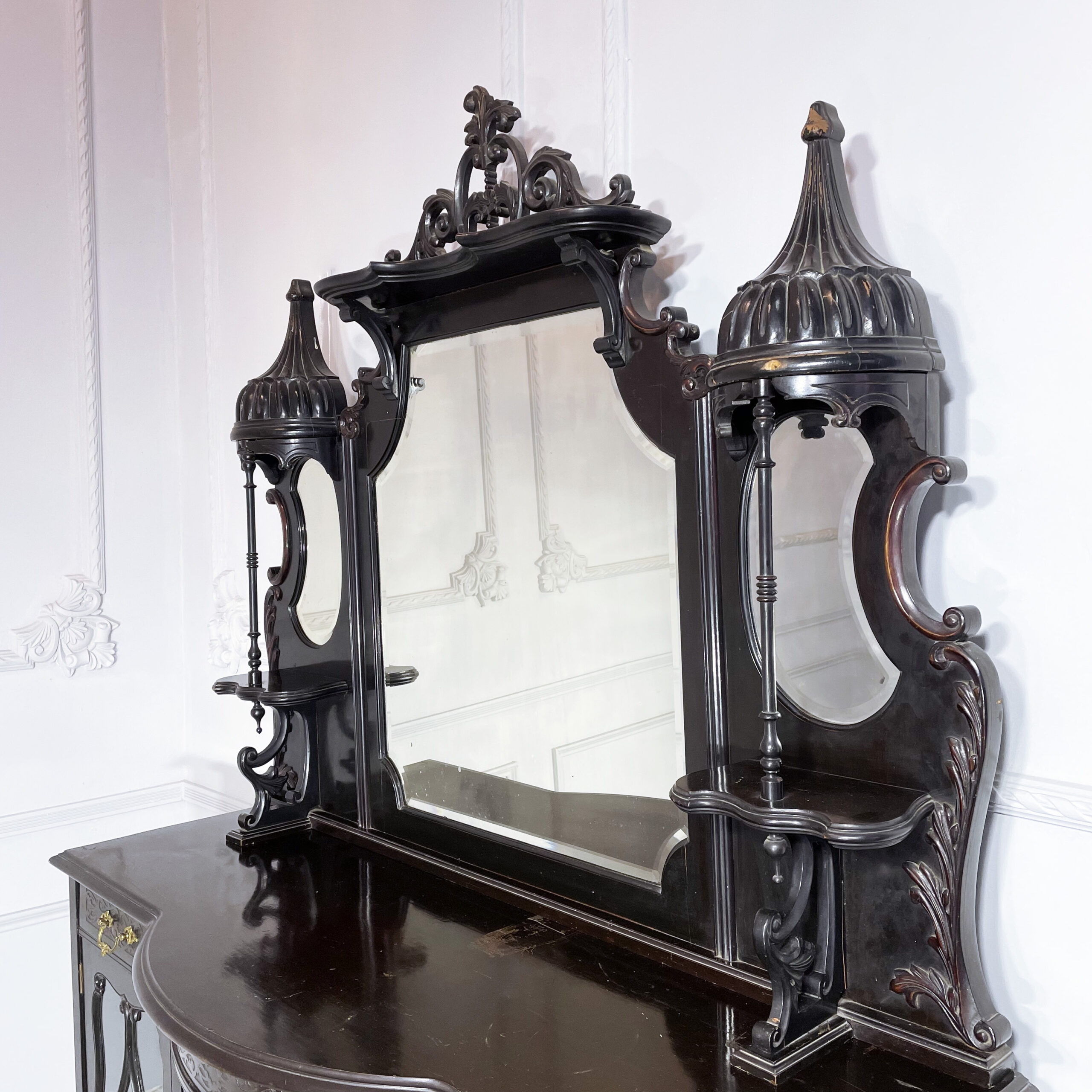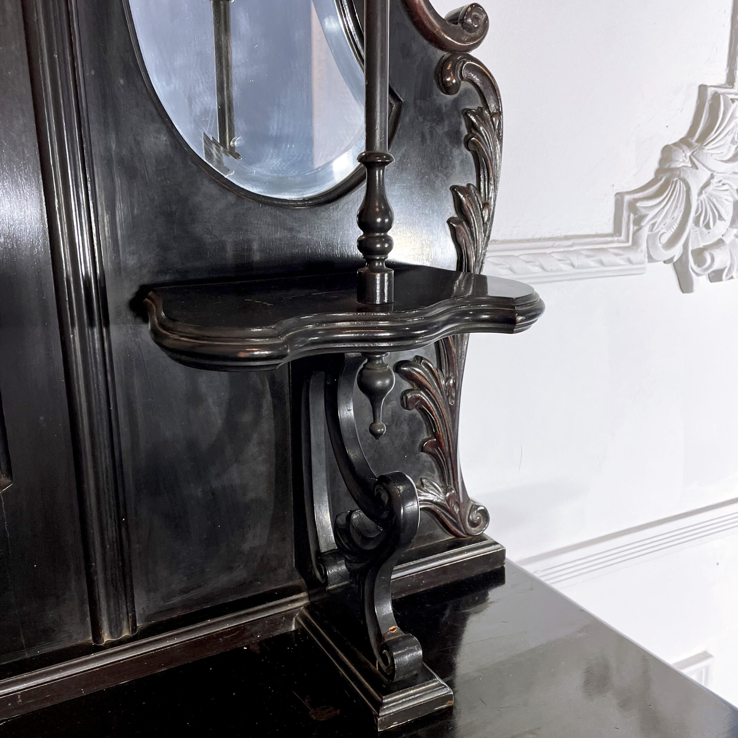Трюмо антикварное в викторианском стиле черного цвета XIX века. Оригинальная фурнитура и зеркала с фацетом. Великолепная резьба ручной работы. Размер 138х49х225h см.