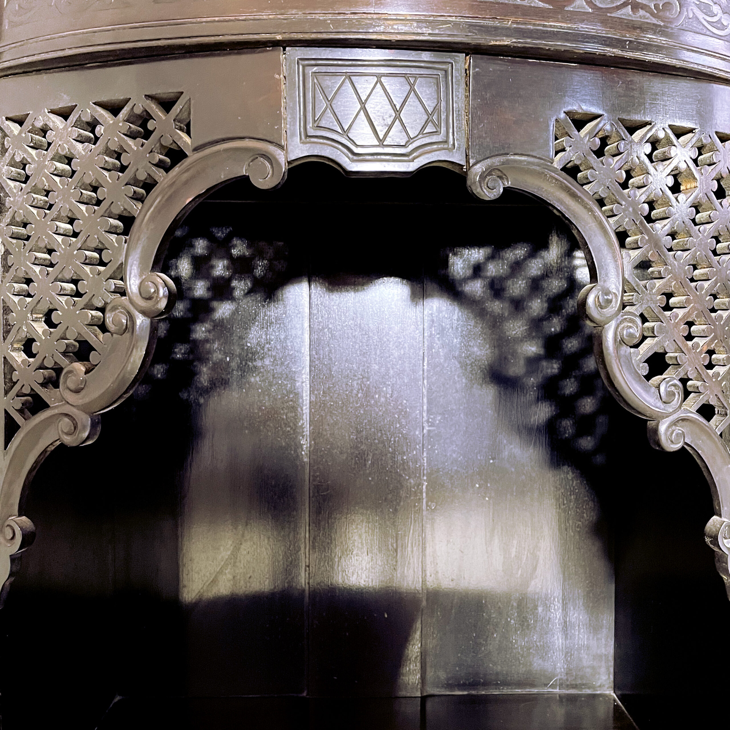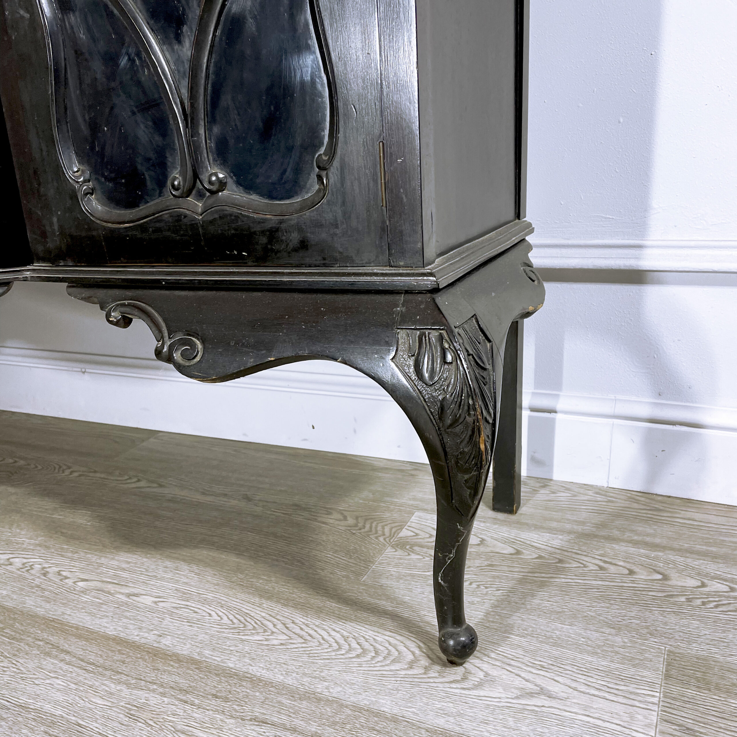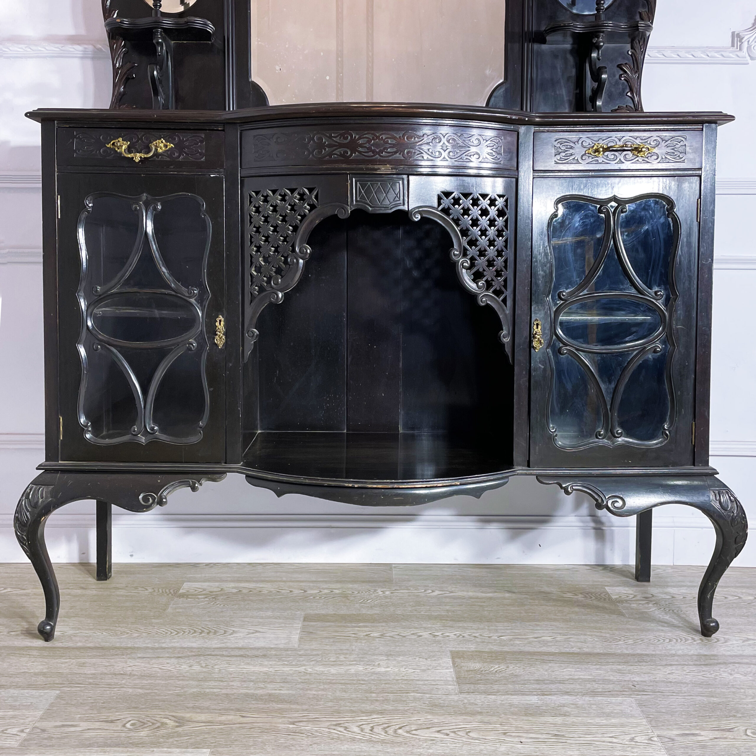 Трюмо антикварное в викторианском стиле черного цвета XIX века. Оригинальная фурнитура и зеркала с фацетом. Великолепная резьба ручной работы. Размер 138х49х225h см.
