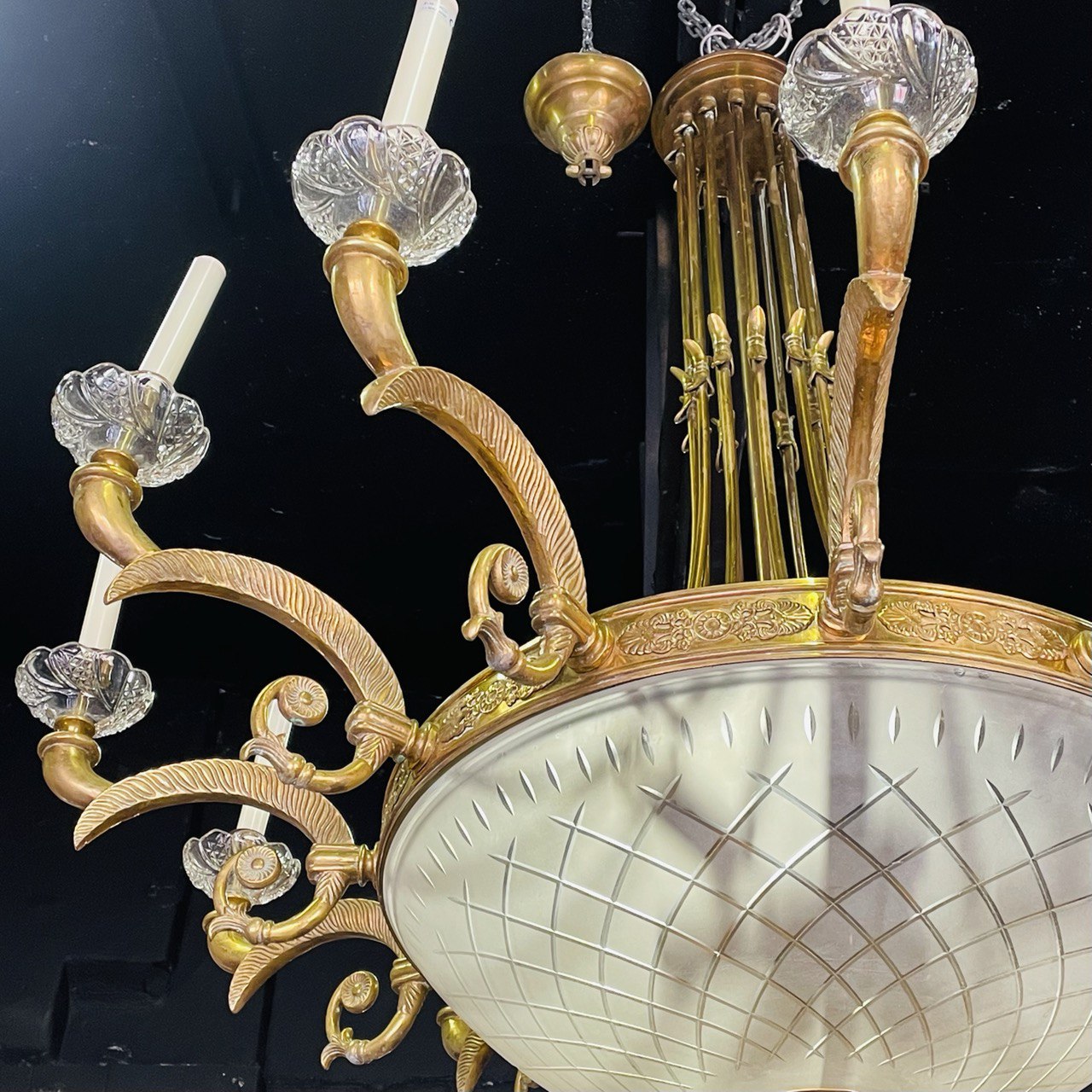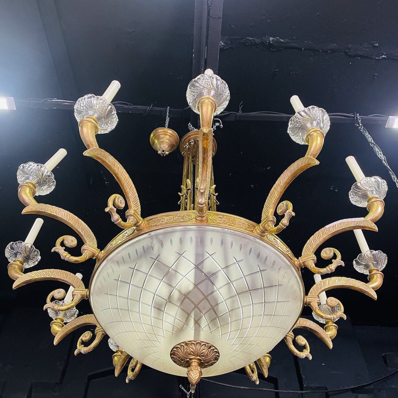 Люстра в стиле ампир, 2-ая половина ХХ века, Франция. Латунь, плафон и розетки из стекла с гравировкой. 12 лампочек снаружи и шесть внутри плафона. Размер: Высота: 180 см. Диаметр: 140 см. В наличии 2 штуки.