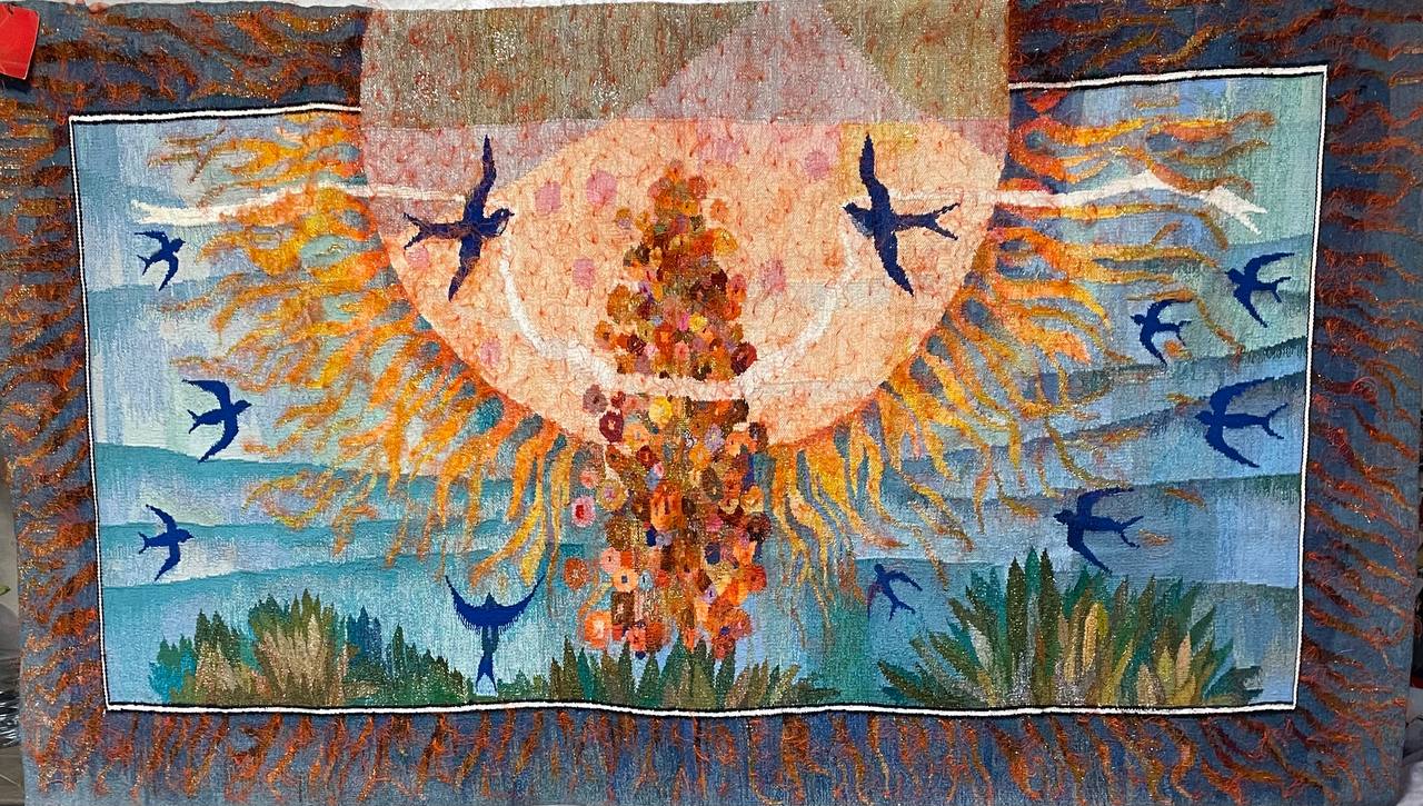 Винтажный гобелен «Гимн Солнцу». Гобелен 2012 г. Размер 246х142 см. художник И.Тимченко. Ручное гладкое ткачество, шерсть, лен. Иван Алексеевич Тимченко родился в 1938 г. Рисовал с раннего детства. В 1962-1967 г. поступил в Краснодарский государственный педагогический институт на художественно-графический факультет. 1967 г. участие в выставке лучших работ студентов ВУЗов в Монреале. Затем, следующая выставка в 1975 году и множество последующих, принесших ему заслуженную популярность и подтверждение его высокого профессионального статуса. В 1982 г., после успешного участия в 1981 г. в выставке “Памятники истории и культуры в изображении советских художников”, он становится членом Московского Союза художников. С 1986 года работает в мастерских декоративно-прикладного искусства художественного Фонда РСФСР при московском комбинате декоративно-прикладного искусства по изготовлению гобеленов . Многие его работы находятся в частных и музейных собраниях разных стран.