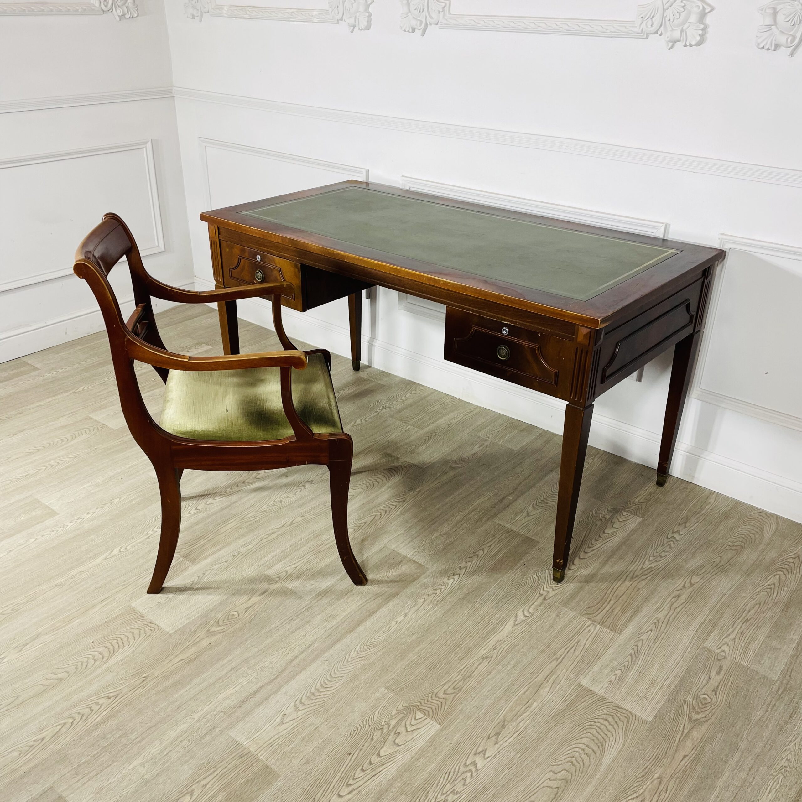 Письменный стол для кабинета в ампирной стилистике, 1970-е годы, Франция. Оснащен двумя выдвижными ящиками. Столешница отделана кожей. Бронзовая фурнитура и бронзовые накладки на ножках. Размер стола: 140х70х76h см. Кресло отдельно продается.
