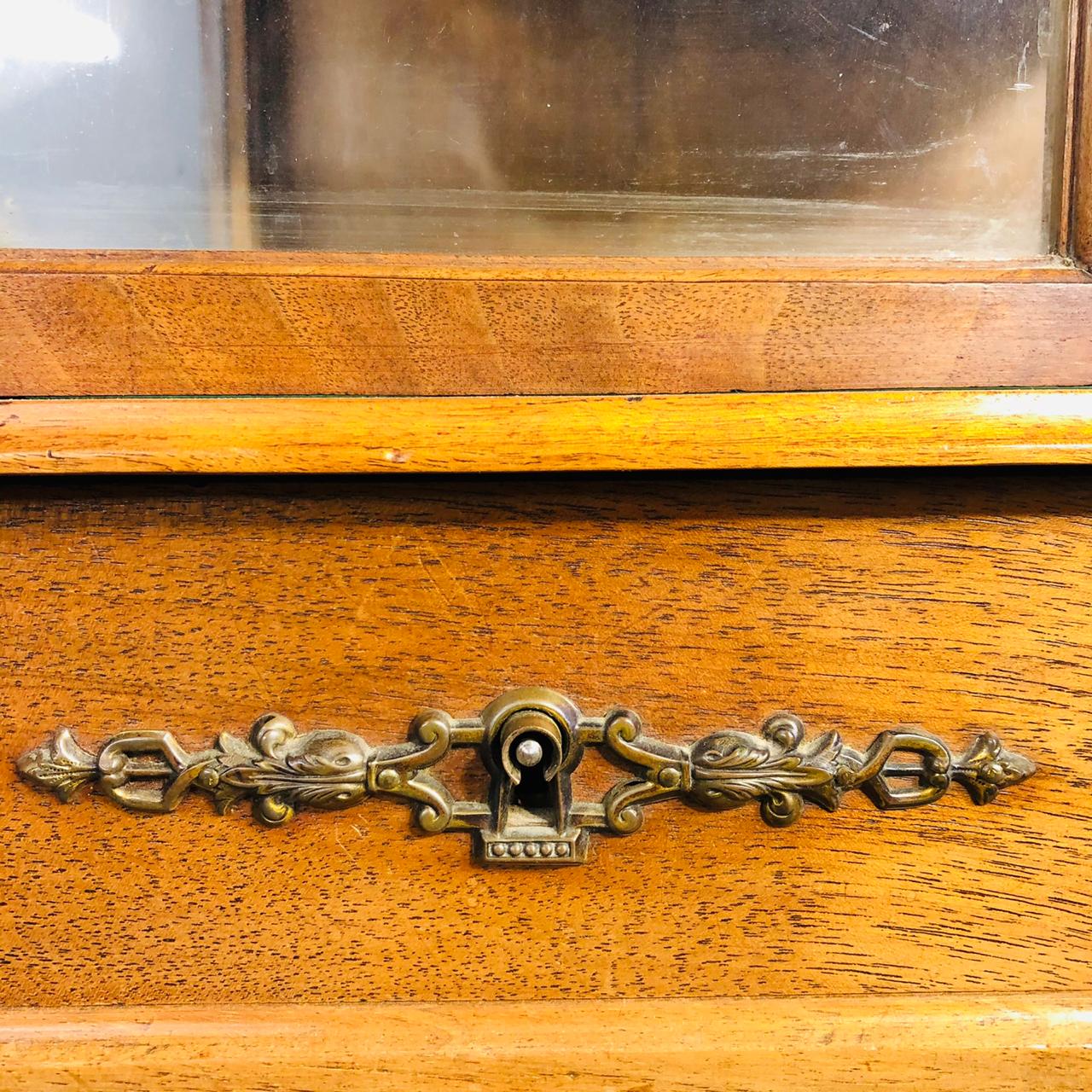 Небольшая антикварная витрина начала XX века Франция. Выполнена из ореха. Внутри зеленое сукно. Украшена оригинальной латунной фурнитурой. Размер 53х41х145h см.